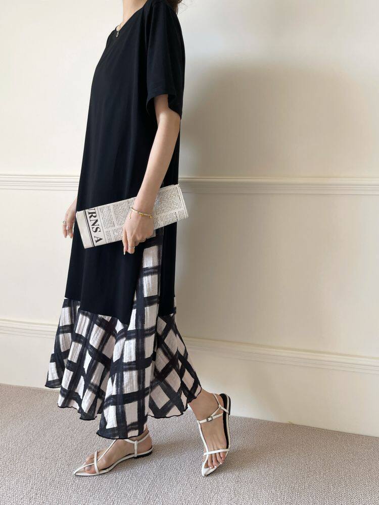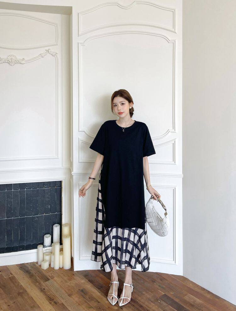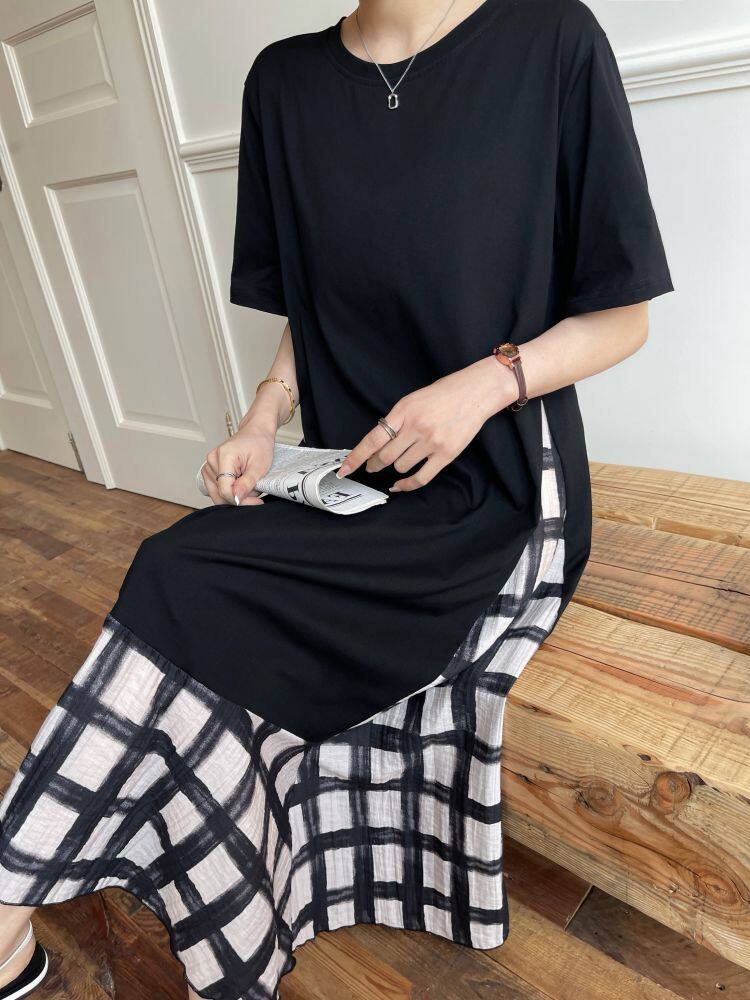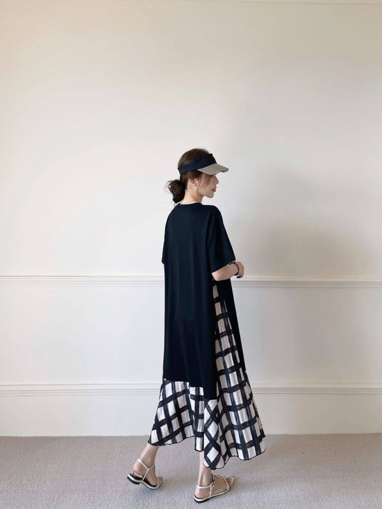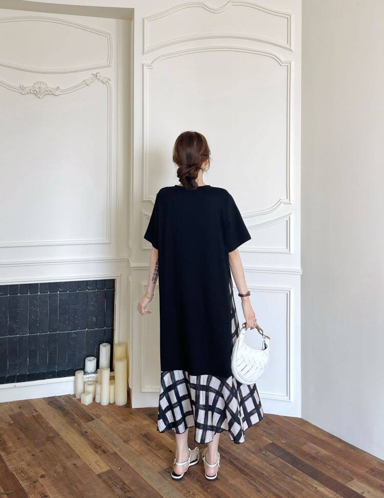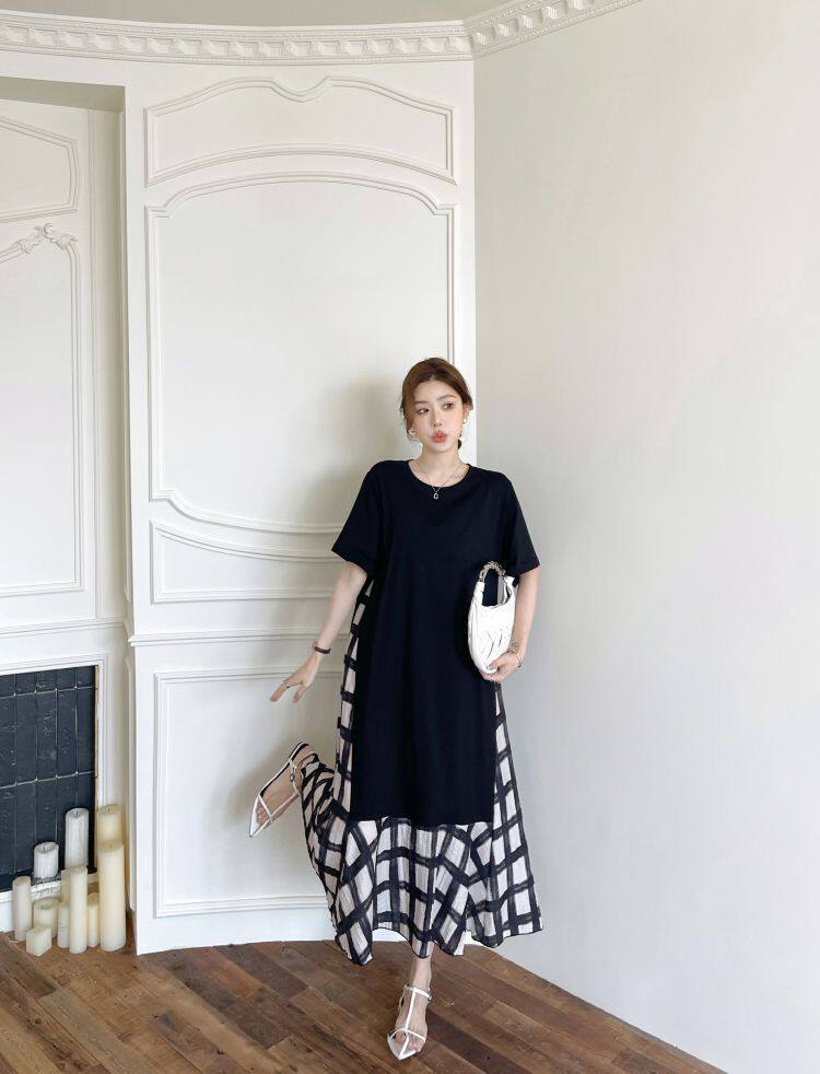 【ワンピース】☀️夏 新作 大きいサイズ レディース チェック柄 重ね着風 半袖ワンピース ゆったり 体型カバー【SHシリーズ】