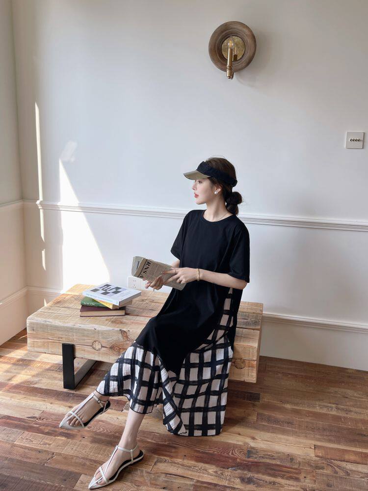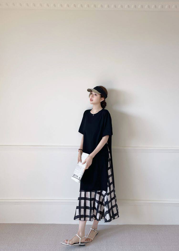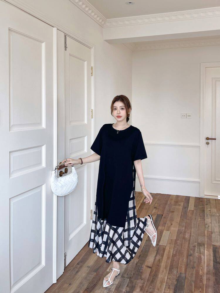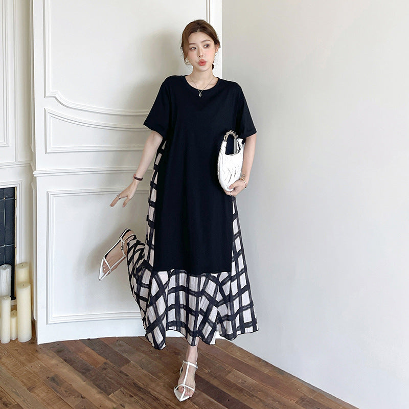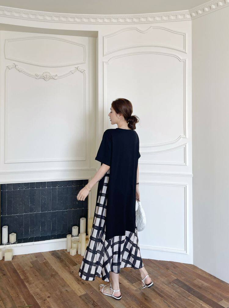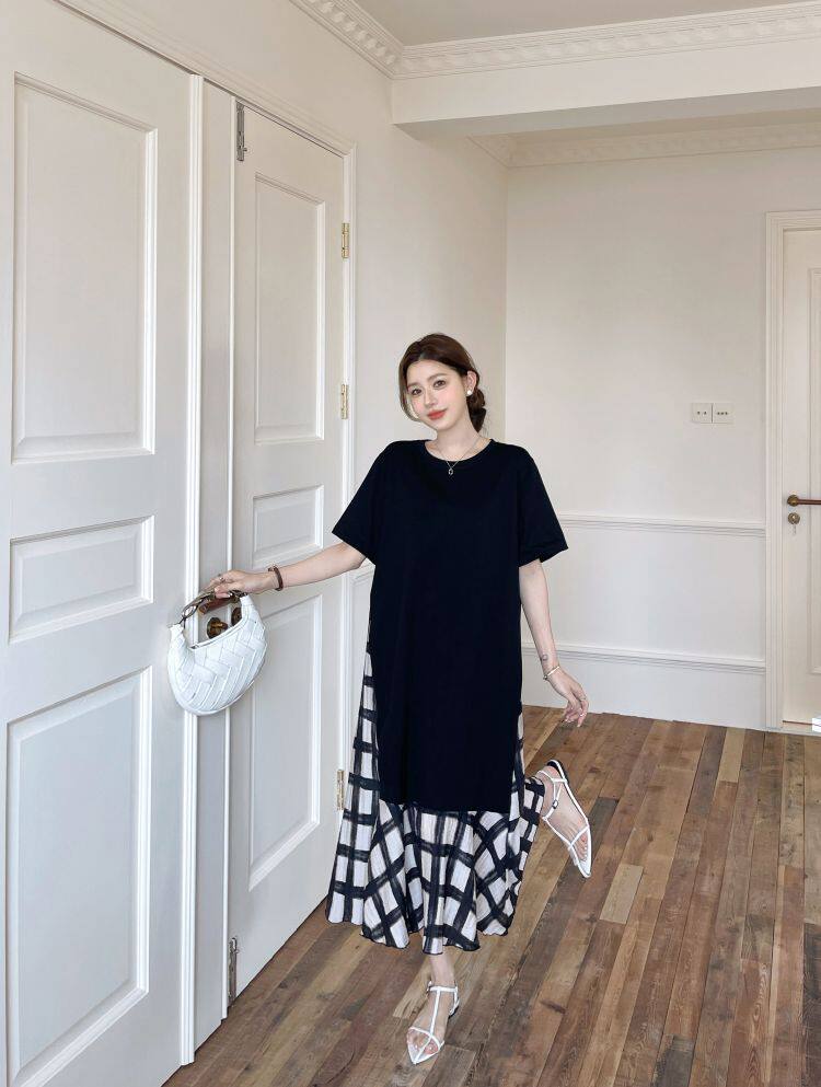 【ワンピース】☀️夏 新作 大きいサイズ レディース チェック柄 重ね着風 半袖ワンピース ゆったり 体型カバー【SHシリーズ】