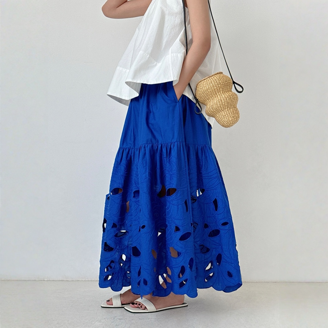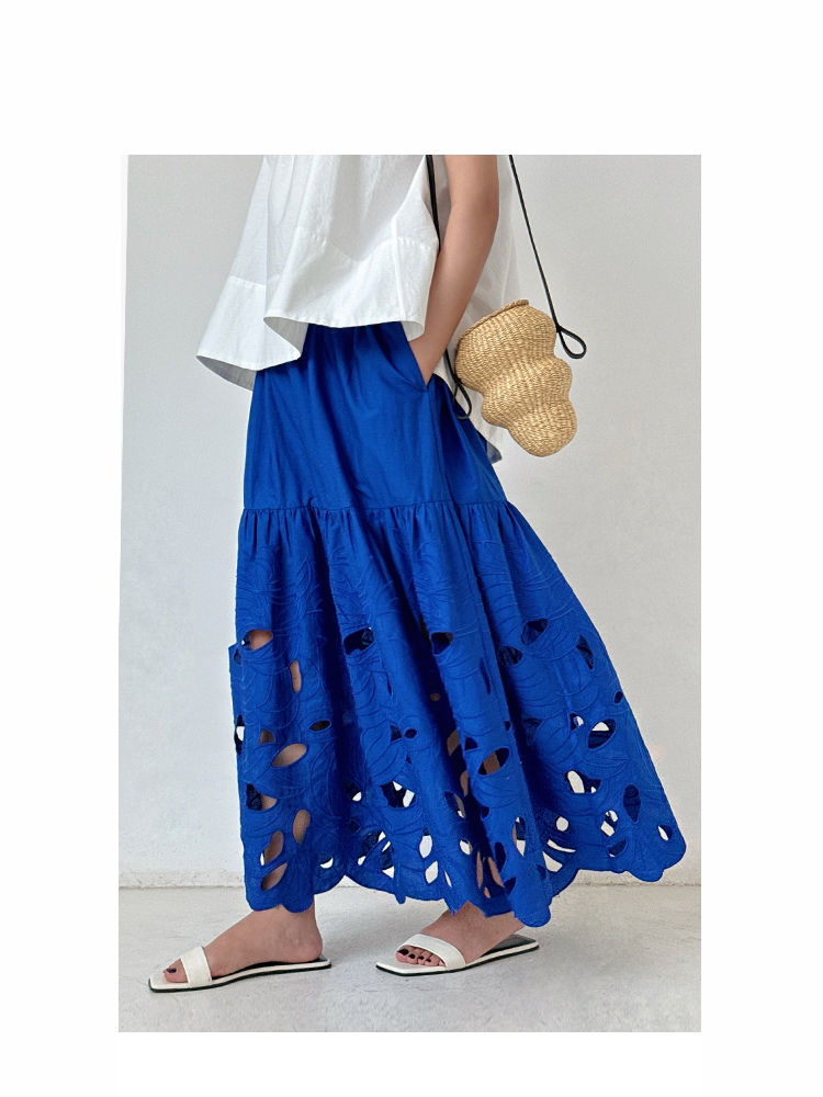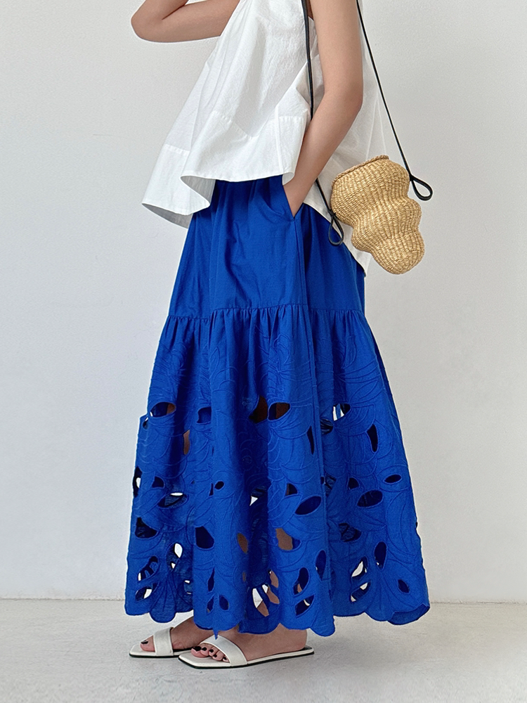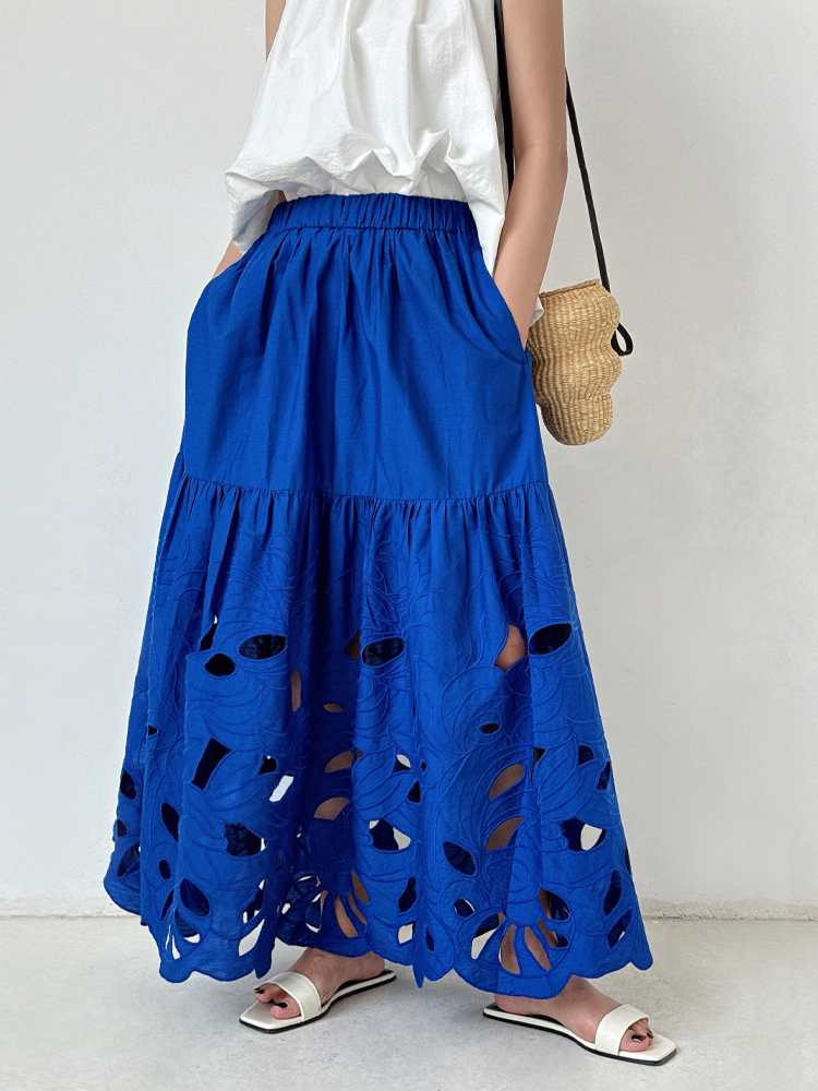 【商品名】【ボトムス】クラインブルー レーザーカット透かしデザイン 両サイド刺繍 ウエストゴム仕様 スカート 【JZシリーズ】