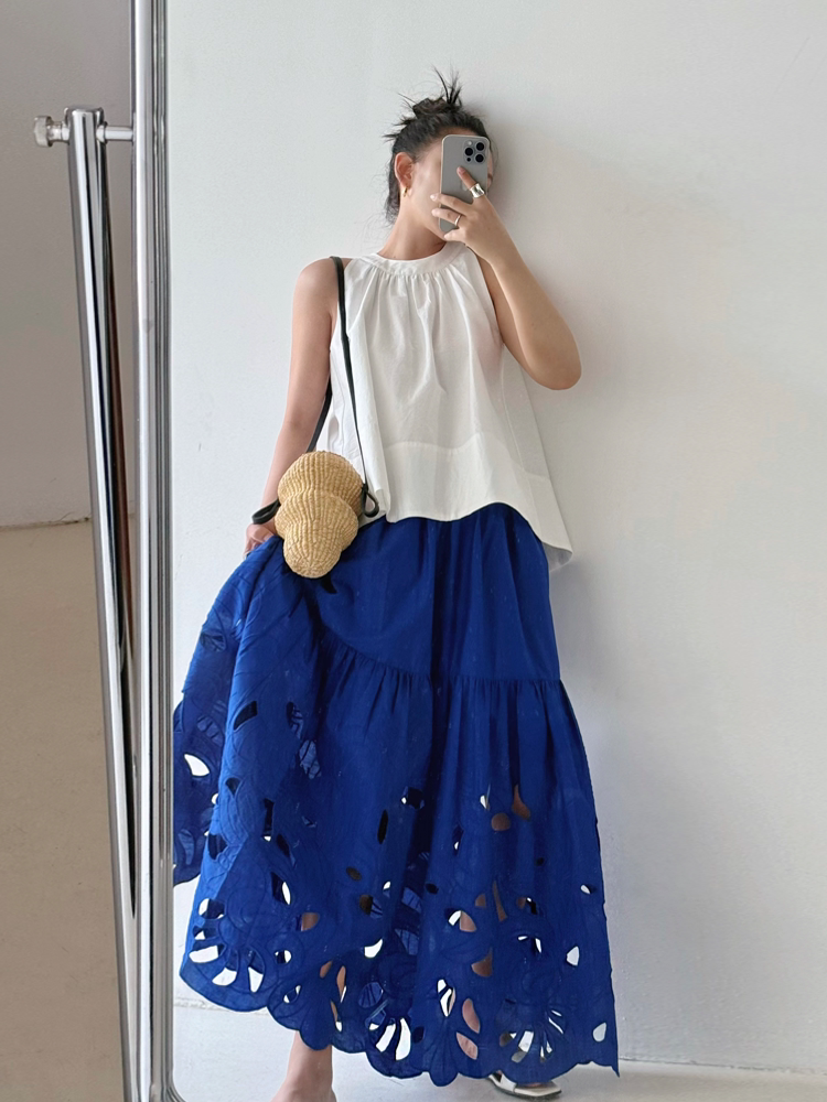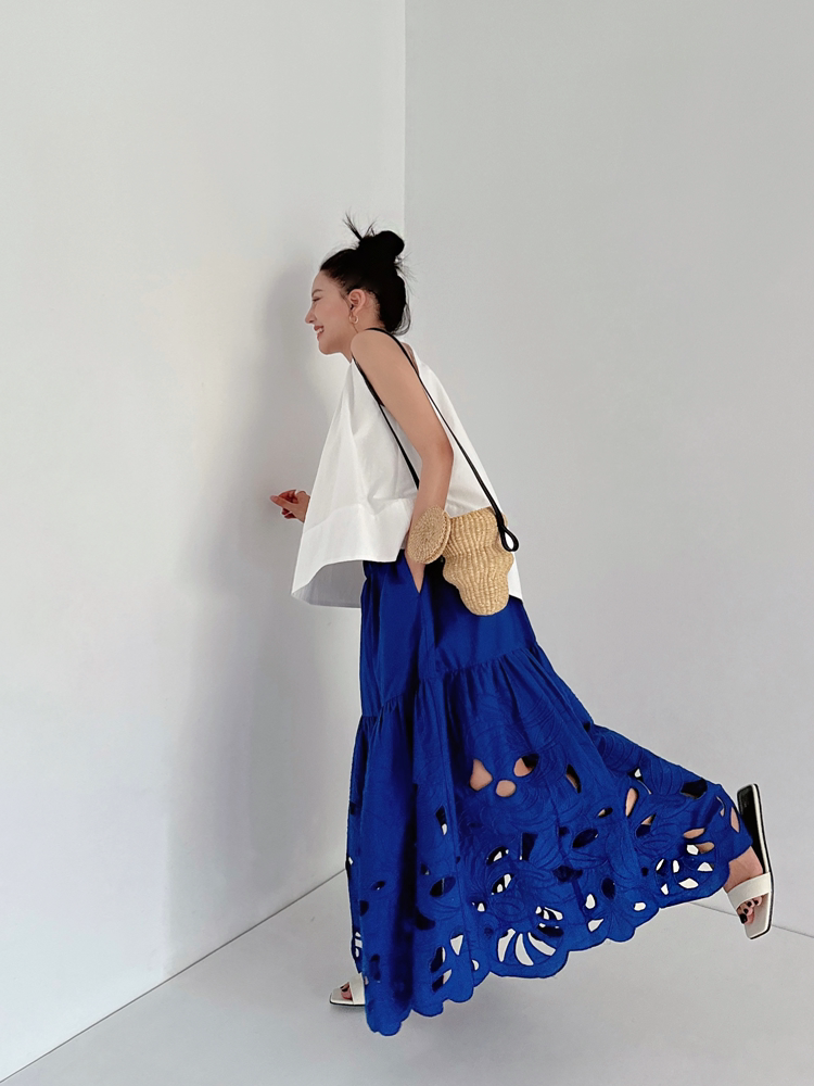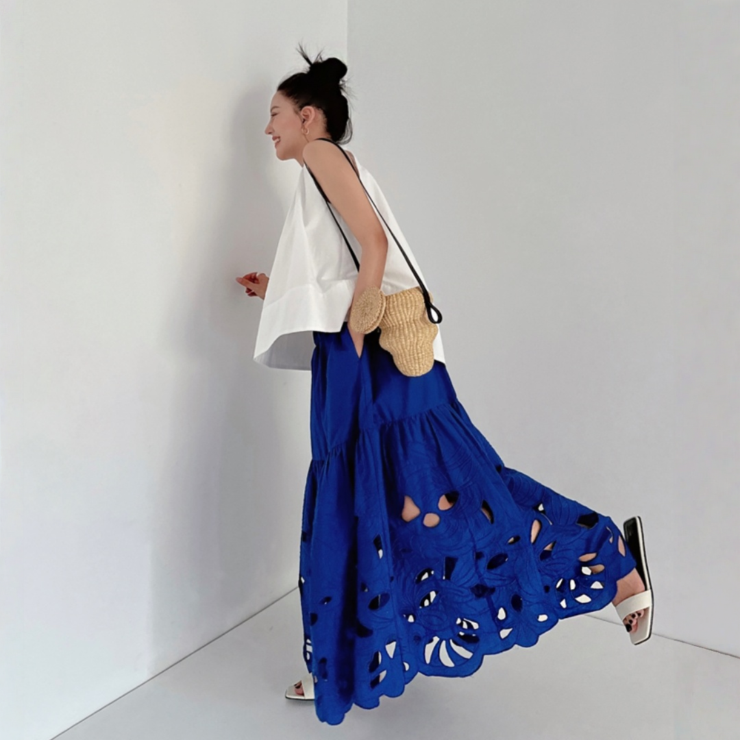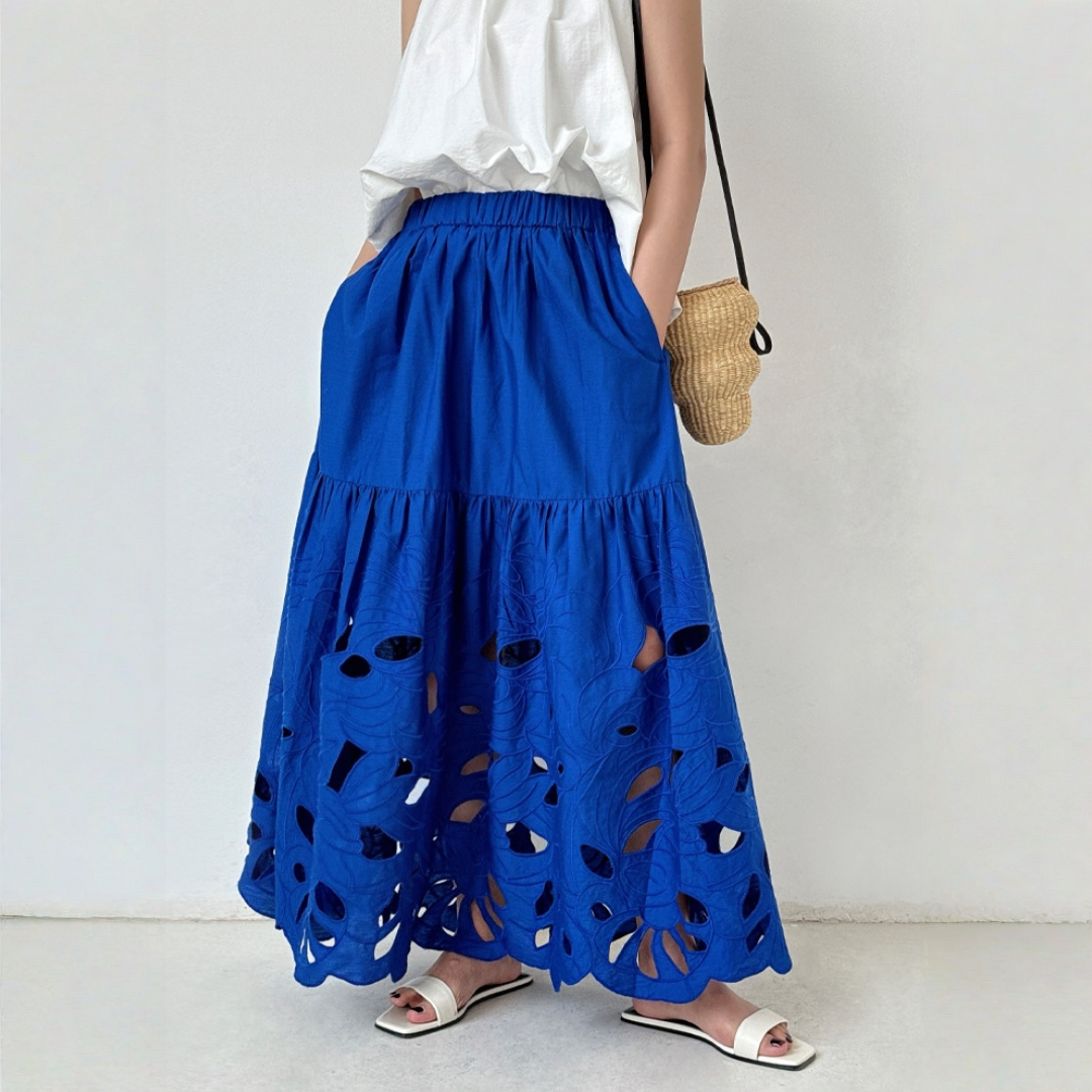 【商品名】【ボトムス】クラインブルー レーザーカット透かしデザイン 両サイド刺繍 ウエストゴム仕様 スカート 【JZシリーズ】