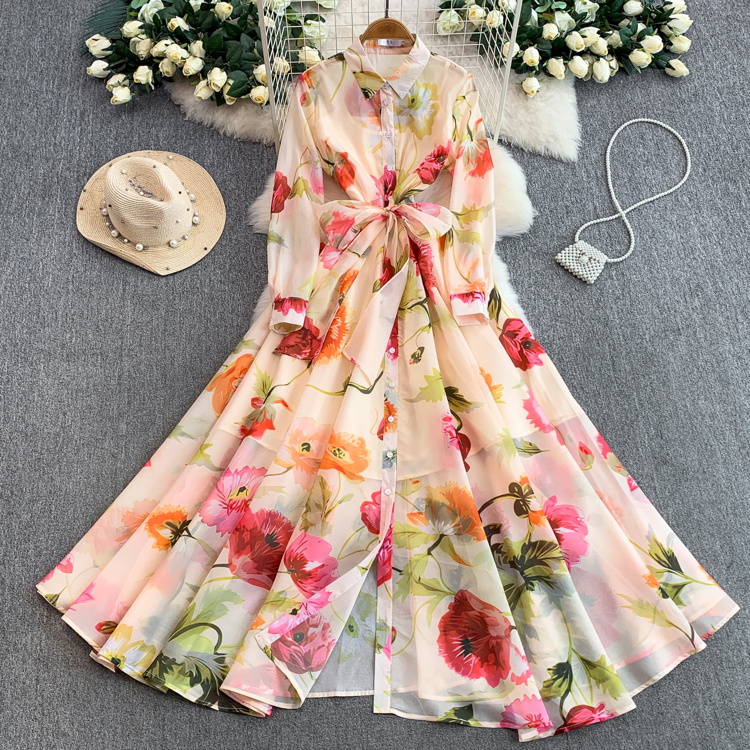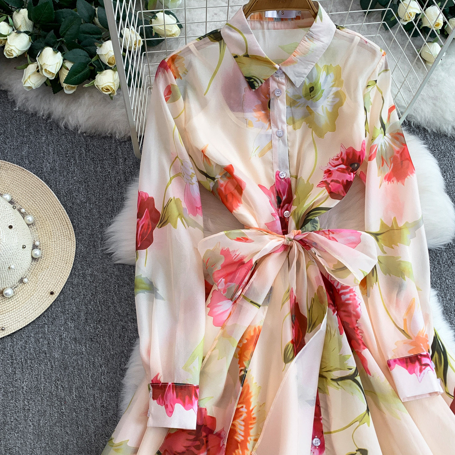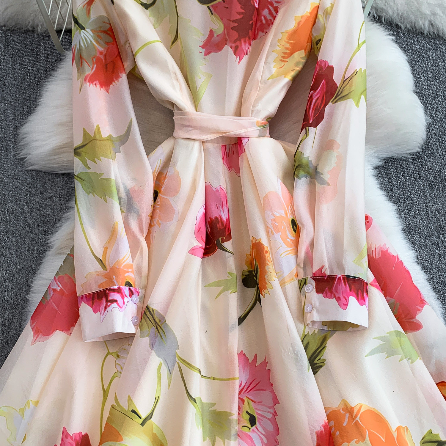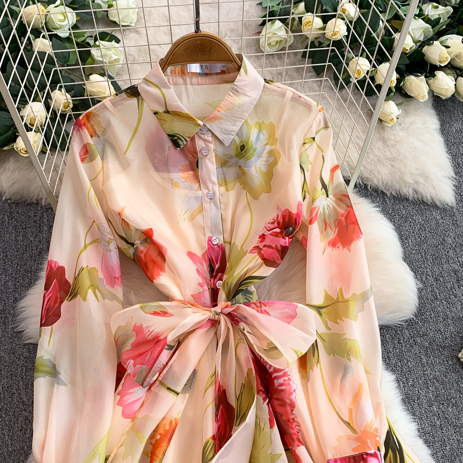 【ワンピース】長袖 花柄ワンピース 襟付き ウエストリボン フレアロング アシンメトリー 着痩せ エレガント リゾートワンピ【SHシリーズ】