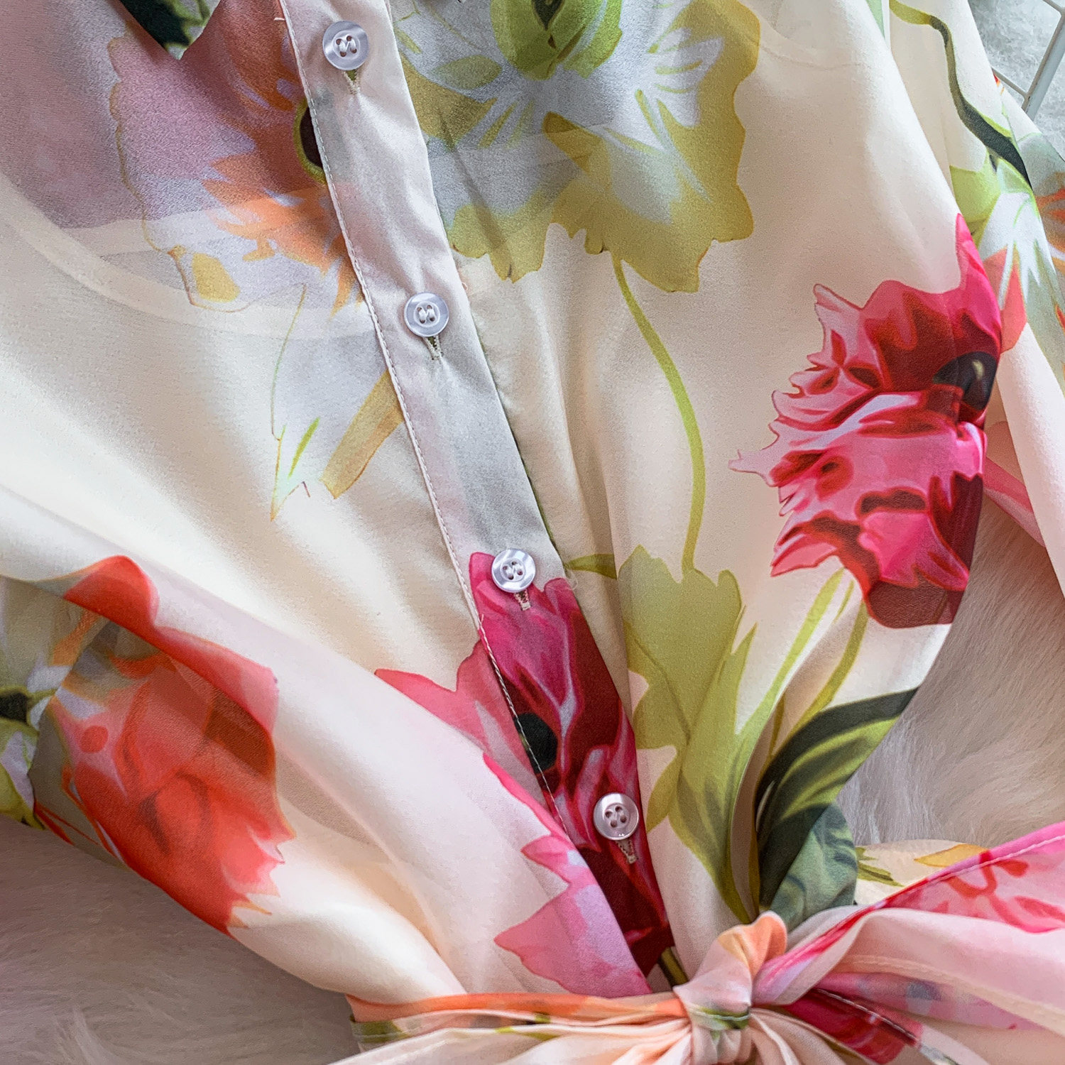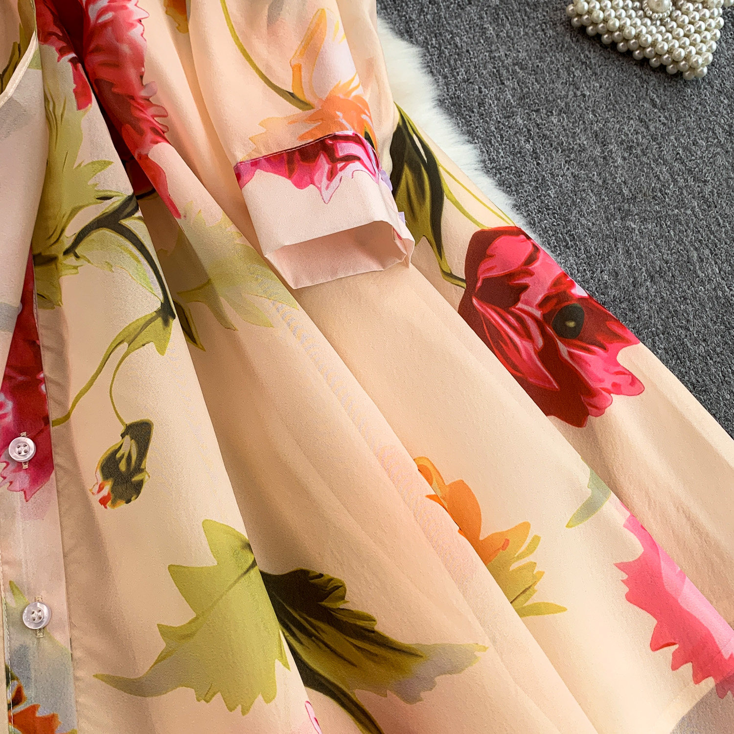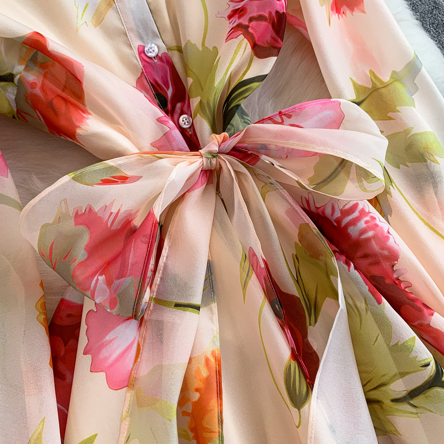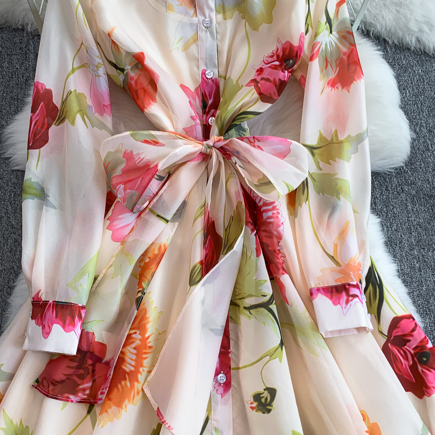 【ワンピース】長袖 花柄ワンピース 襟付き ウエストリボン フレアロング アシンメトリー 着痩せ エレガント リゾートワンピ【SHシリーズ】