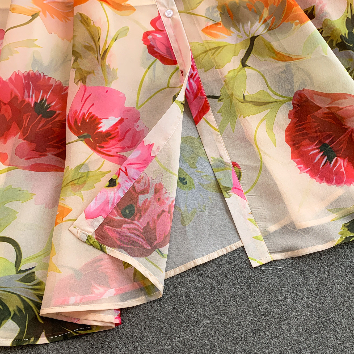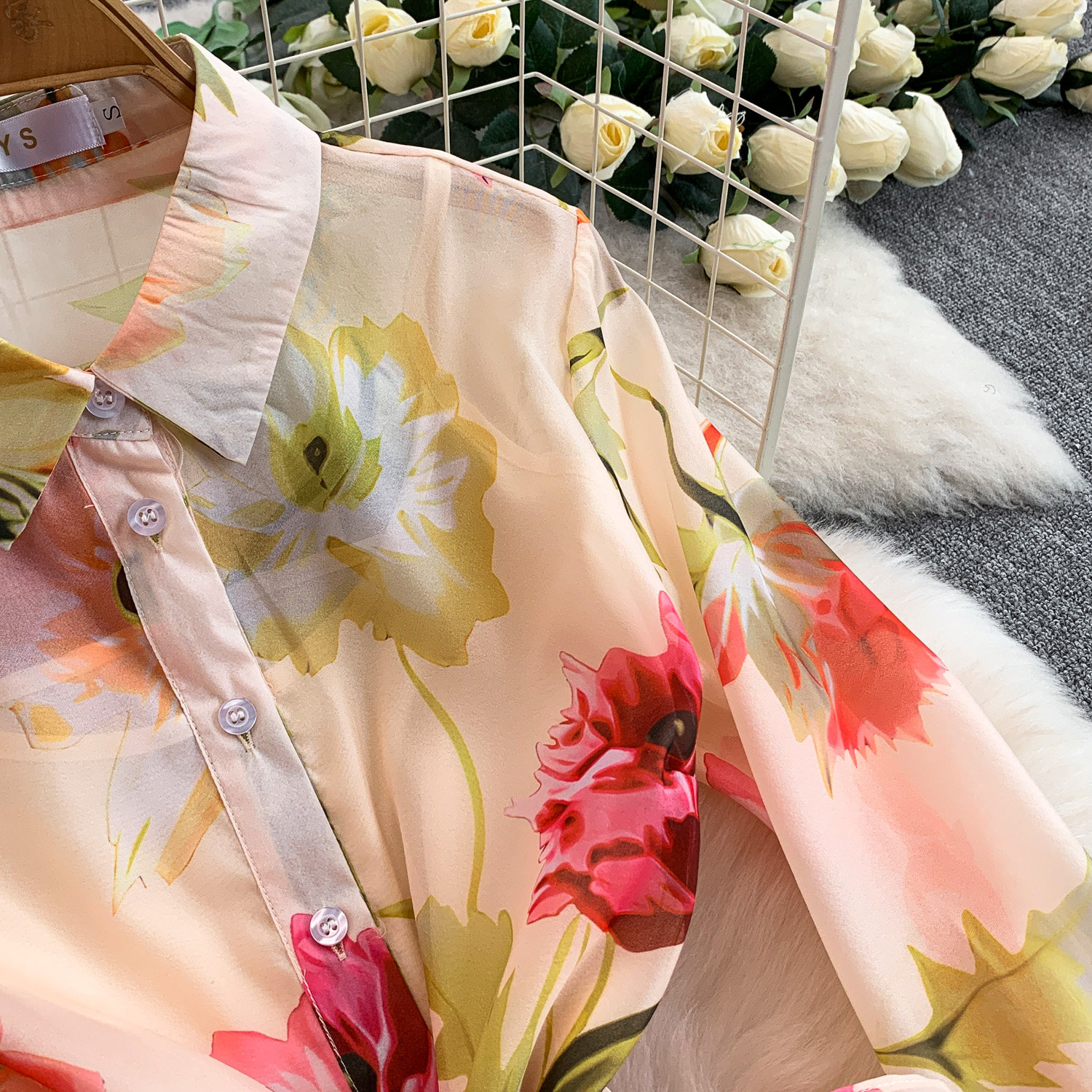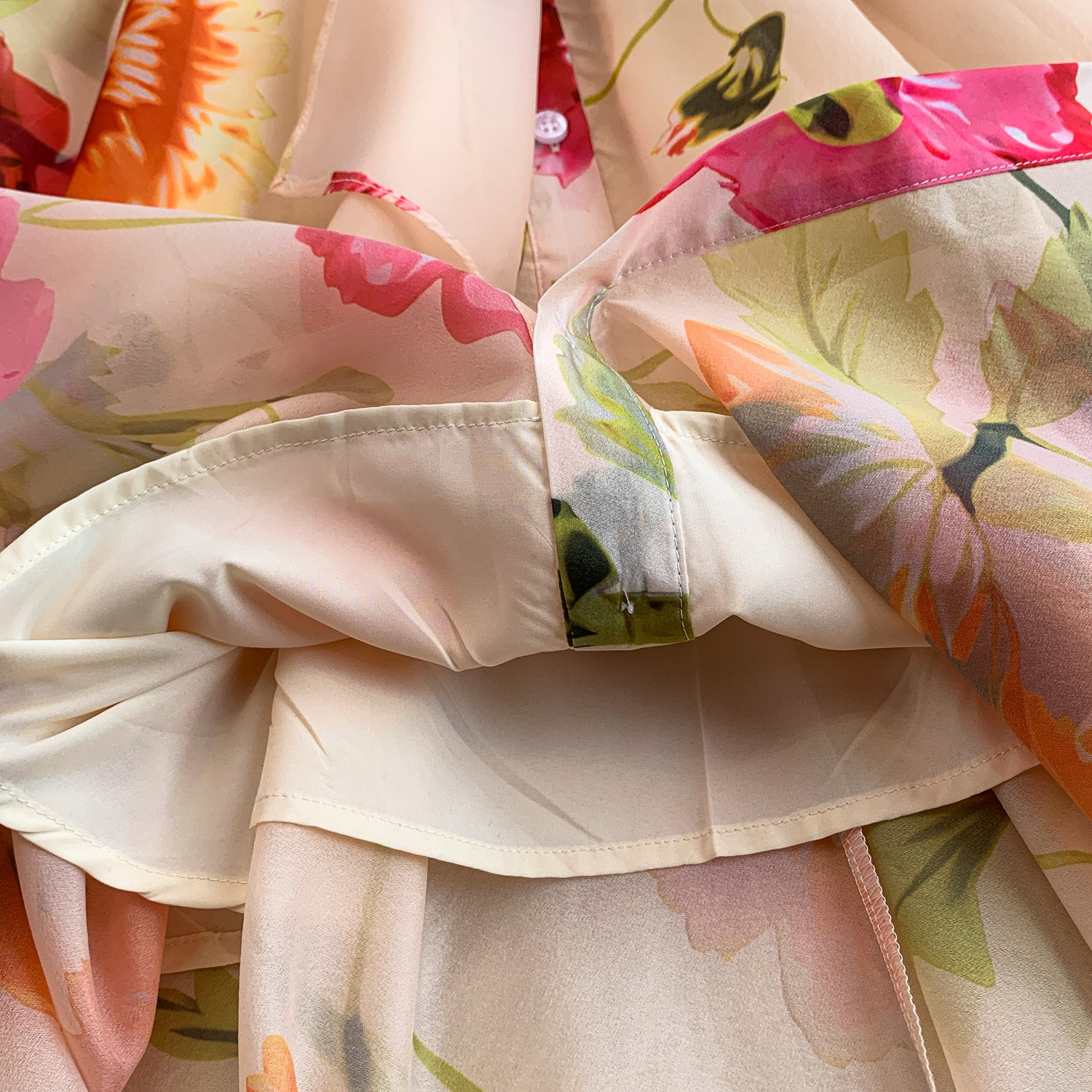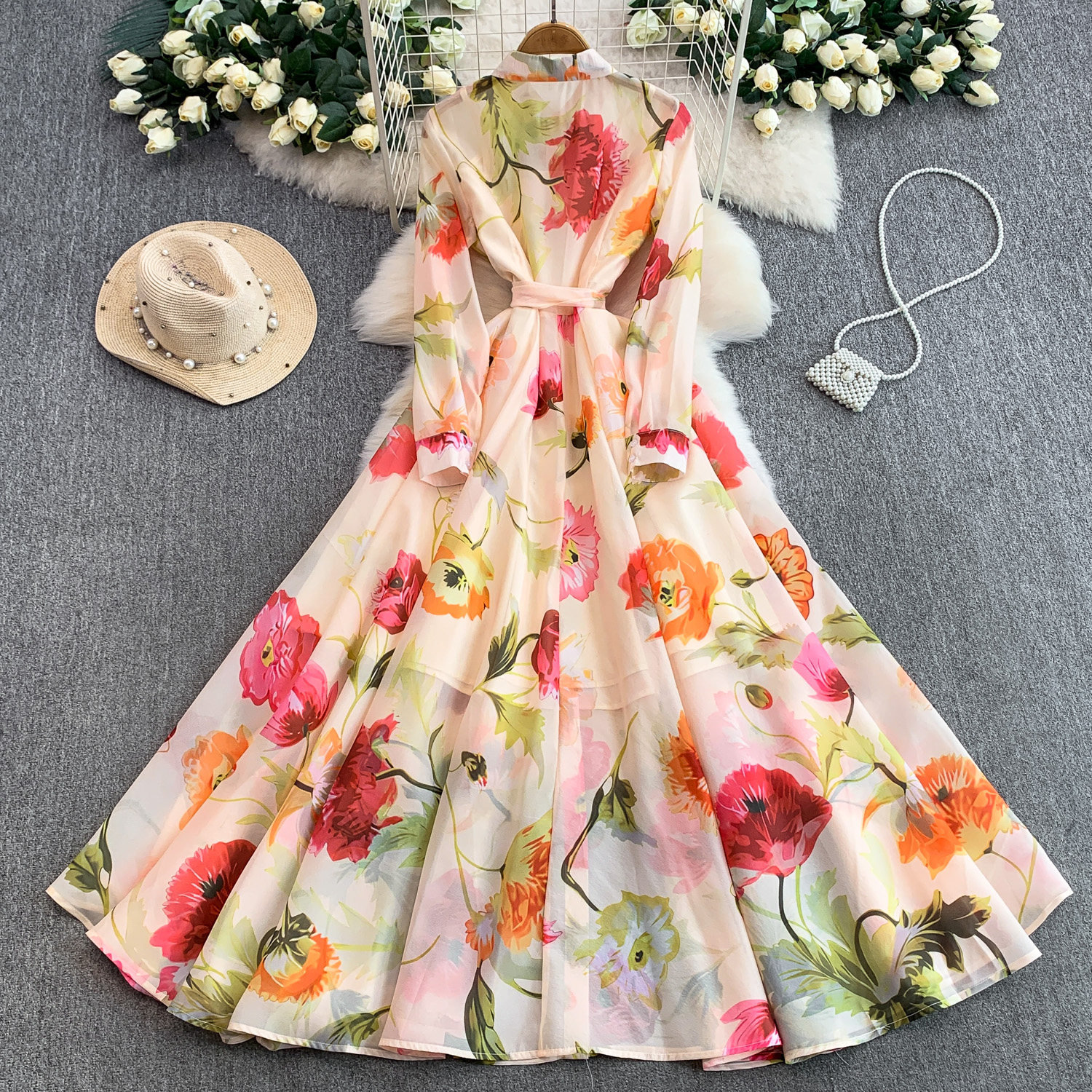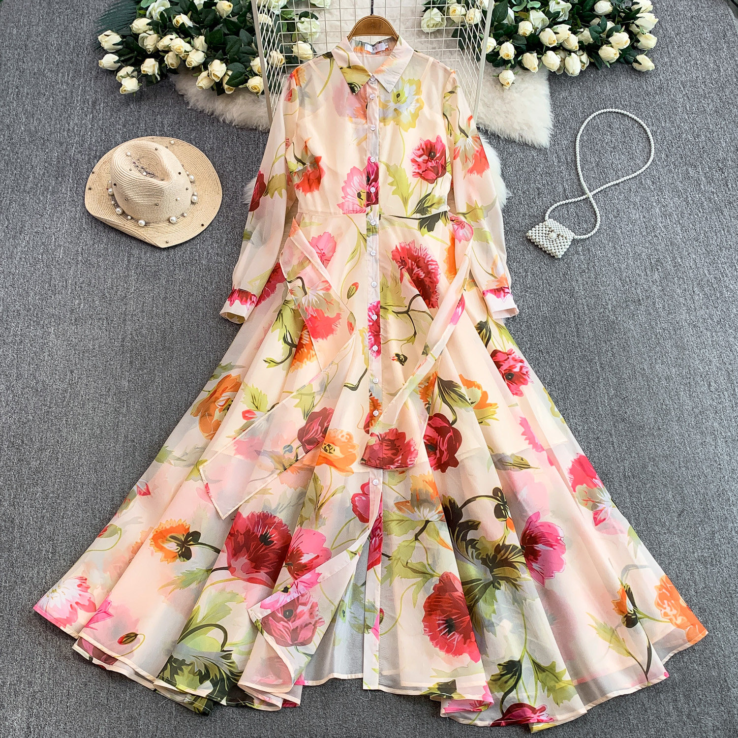 【ワンピース】長袖 花柄ワンピース 襟付き ウエストリボン フレアロング アシンメトリー 着痩せ エレガント リゾートワンピ【SHシリーズ】