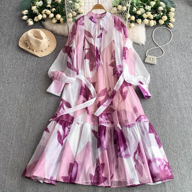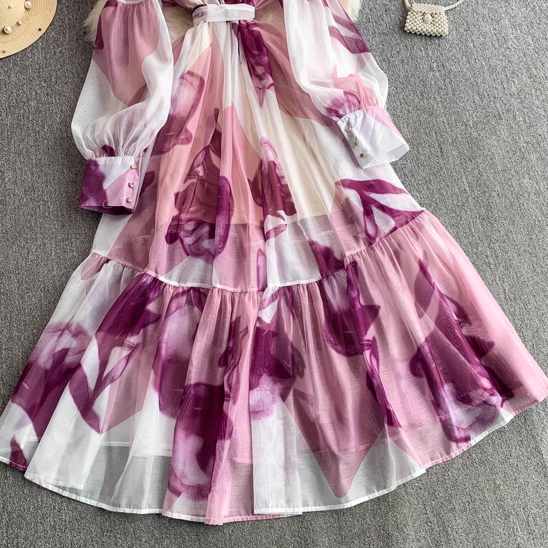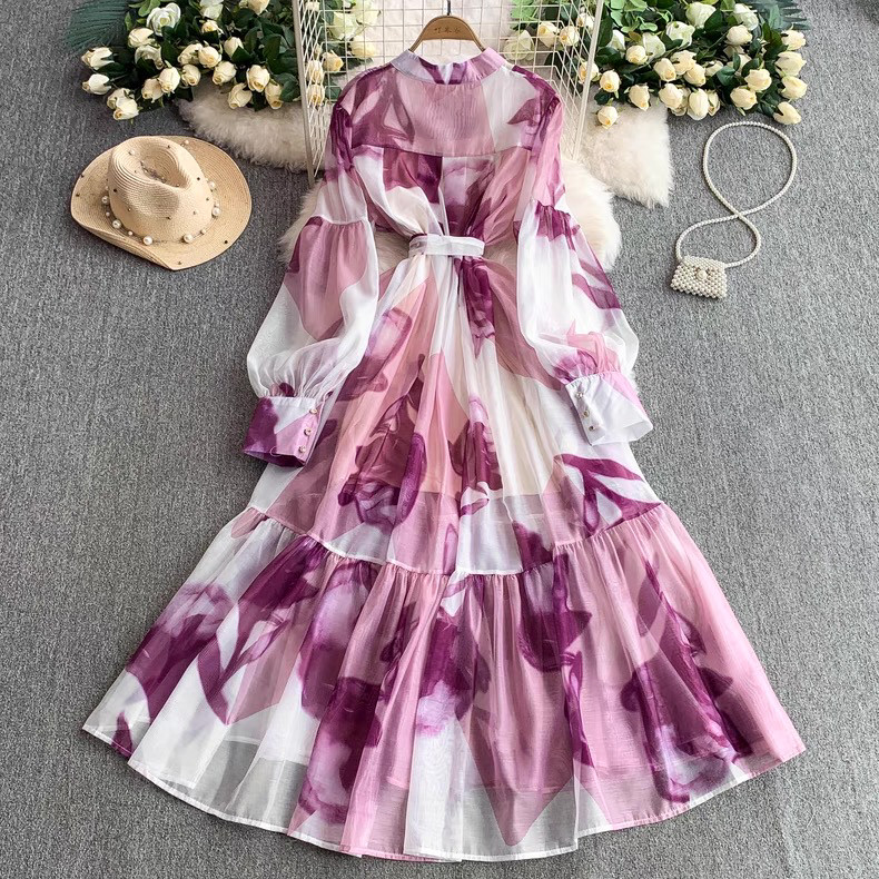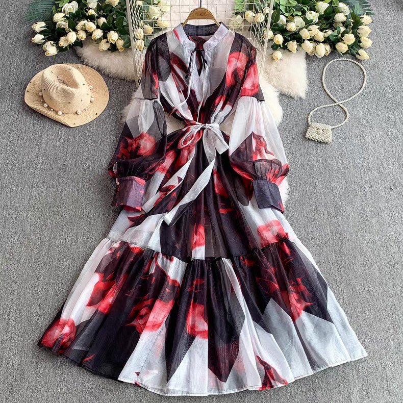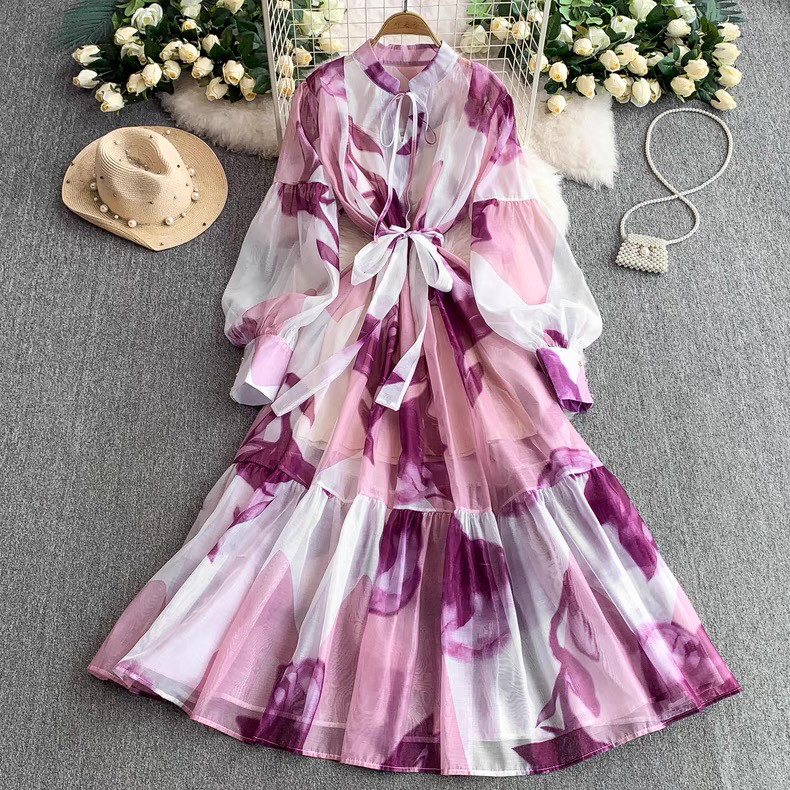 【ワンピース】5カラー フレンチレトロ 花柄ワンピース 長袖 ウエストマーク ゆったり着痩せ ロング丈 上品エレガント 万能ワンピ【SHシリーズ】