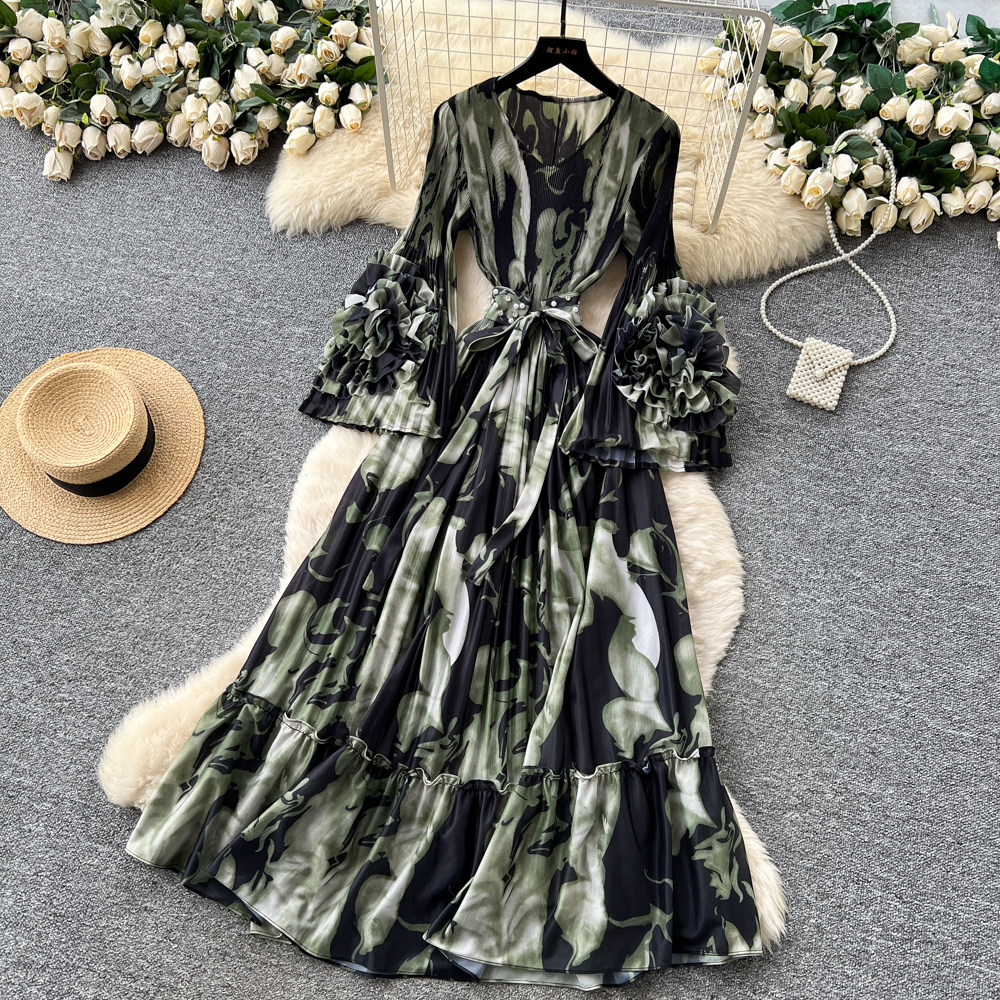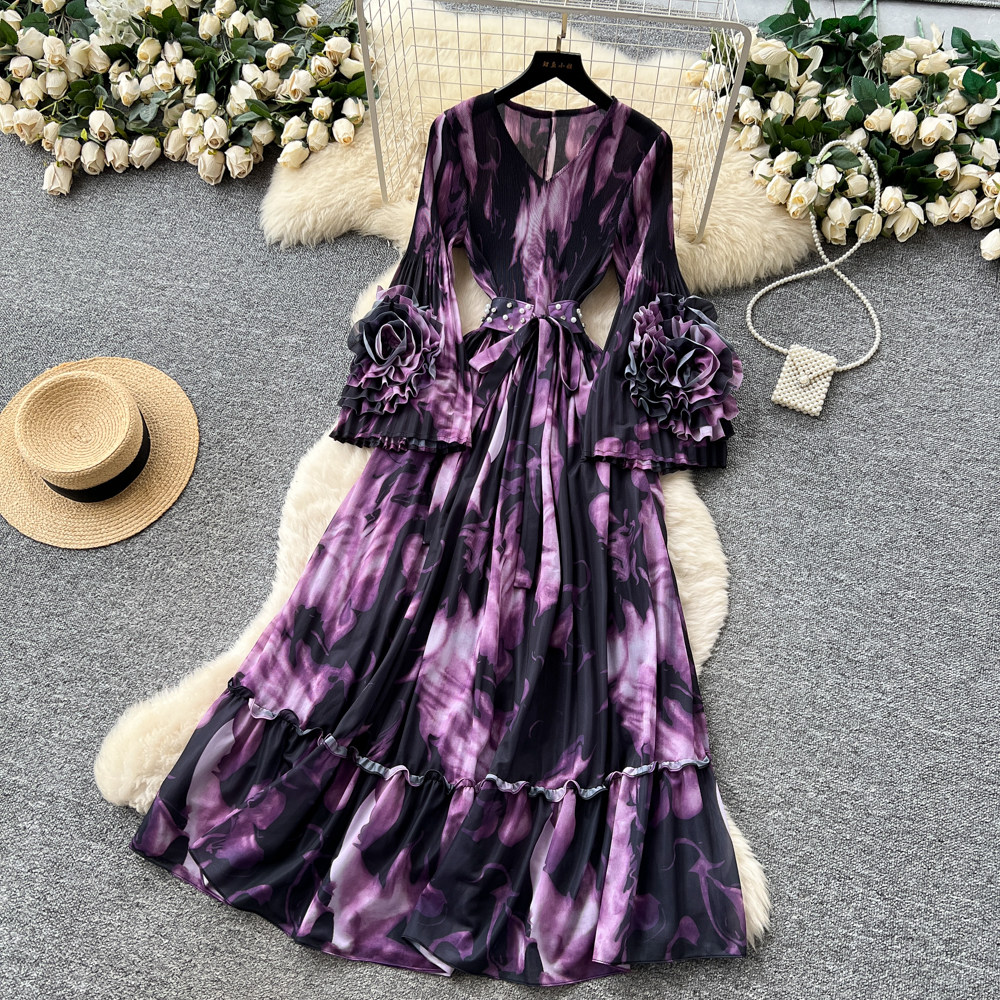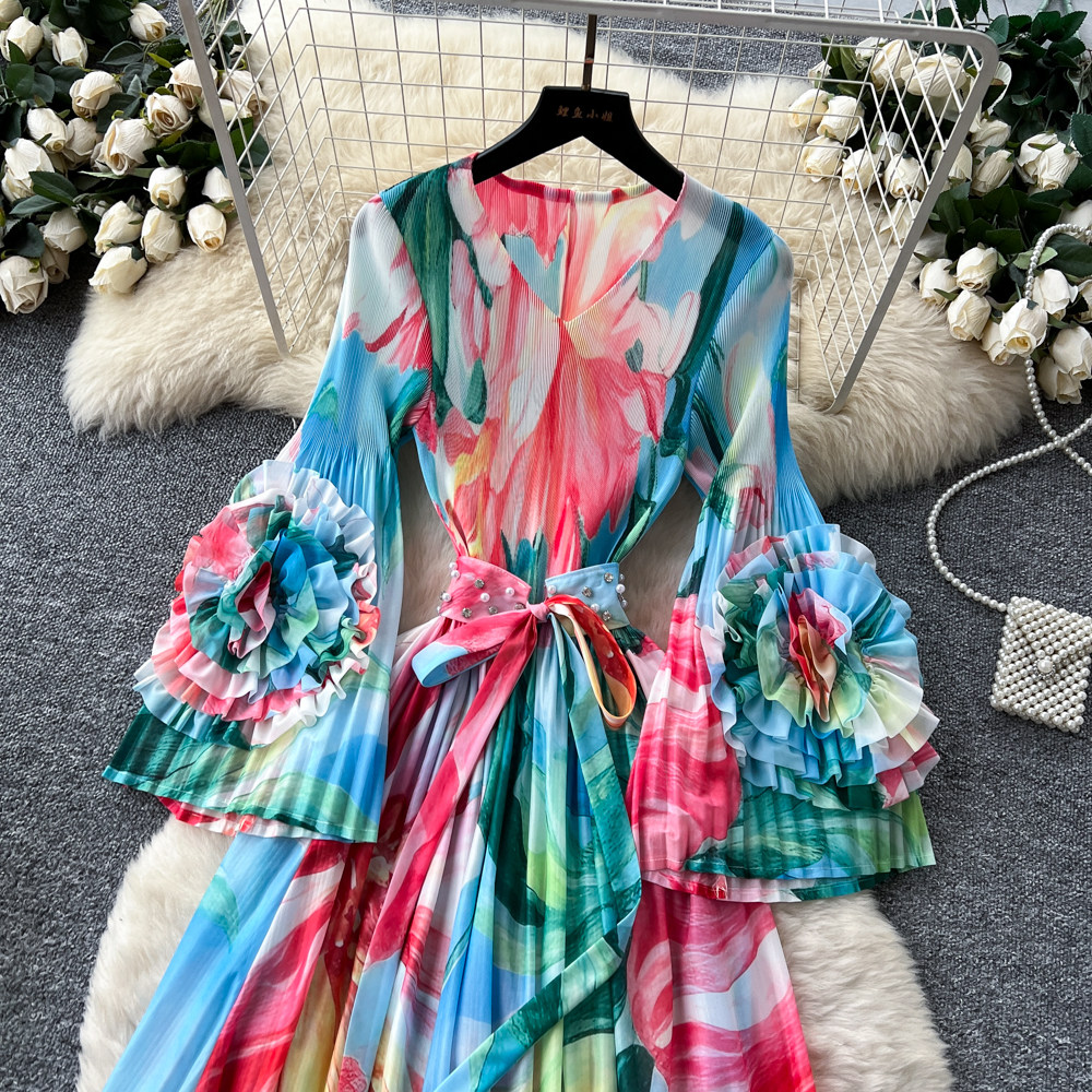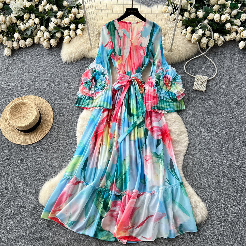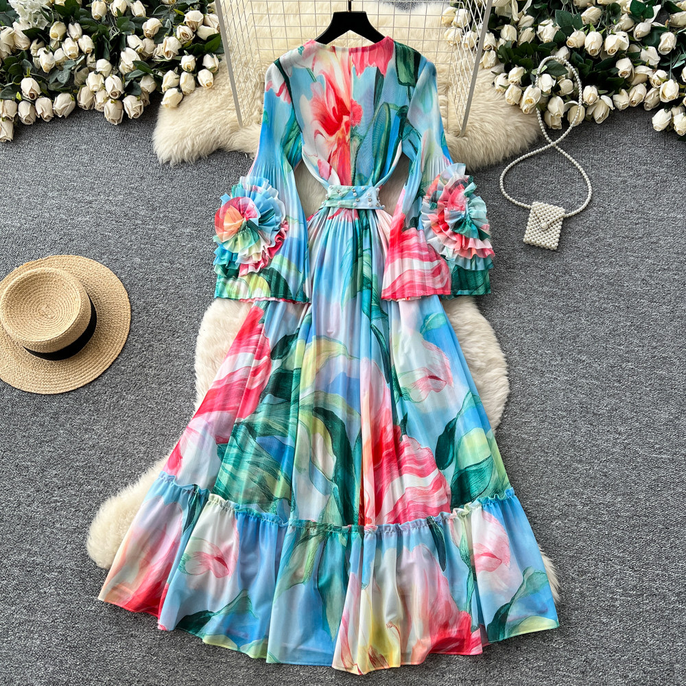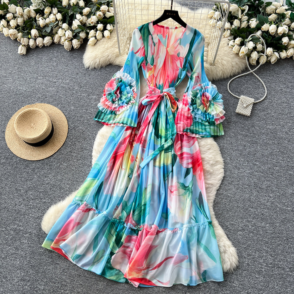 【ワンピース】フレンチ花柄ワンピース Vネック 長袖 立体フラワー フレアロング 着痩せ エレガント リゾートワンピ【SHシリーズ】