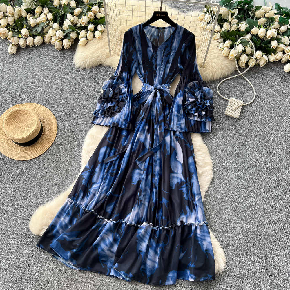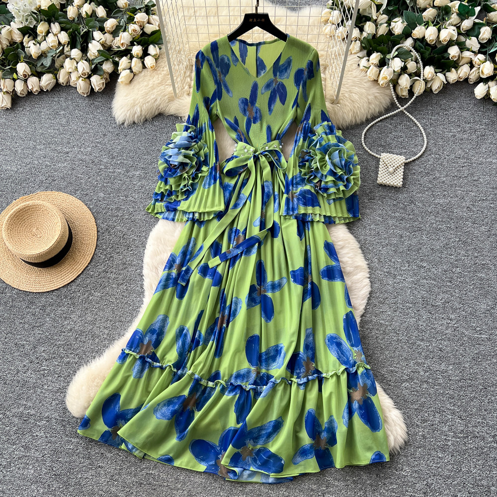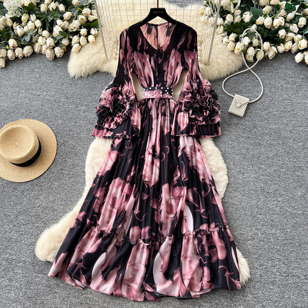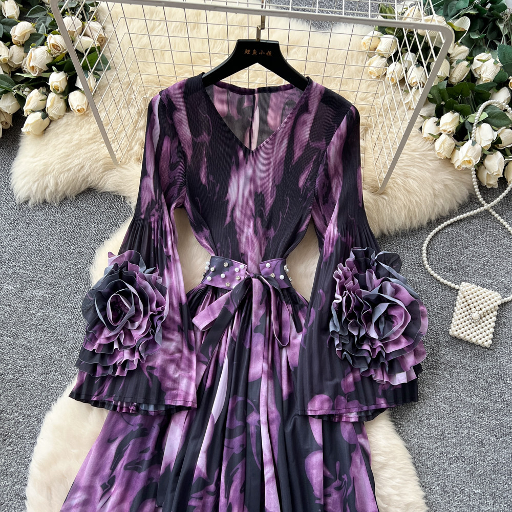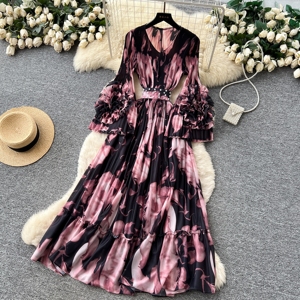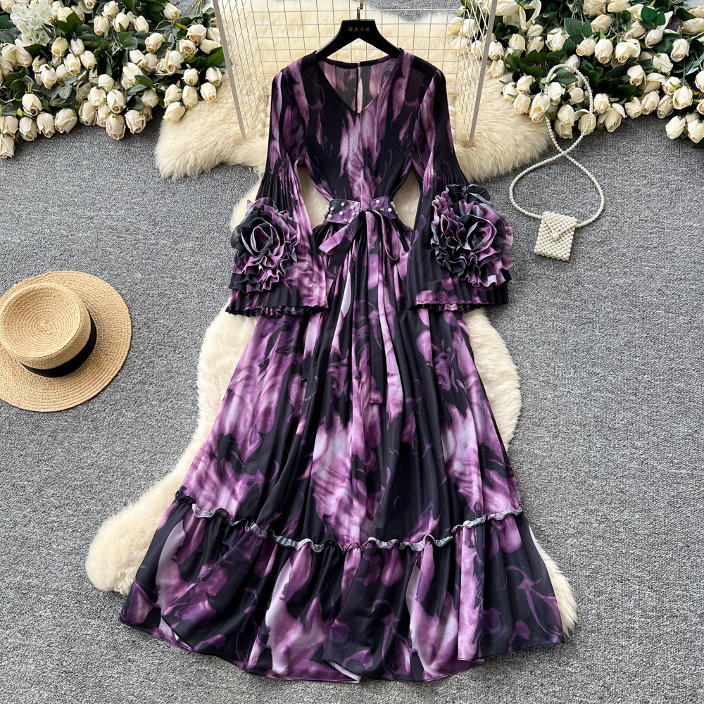 【ワンピース】フレンチ花柄ワンピース Vネック 長袖 立体フラワー フレアロング 着痩せ エレガント リゾートワンピ【SHシリーズ】
