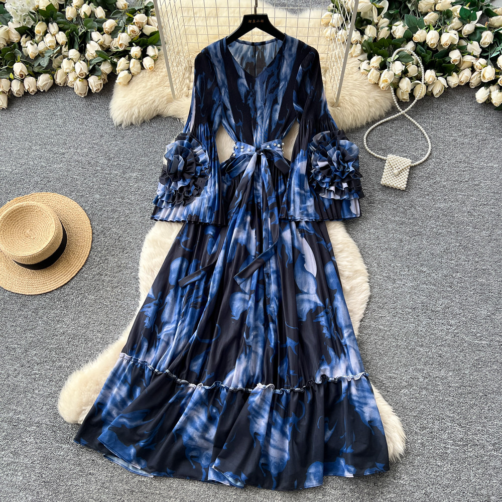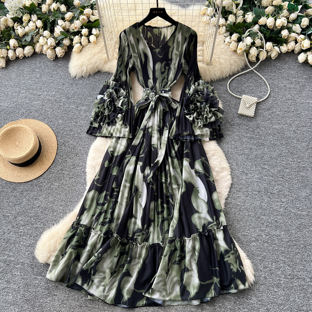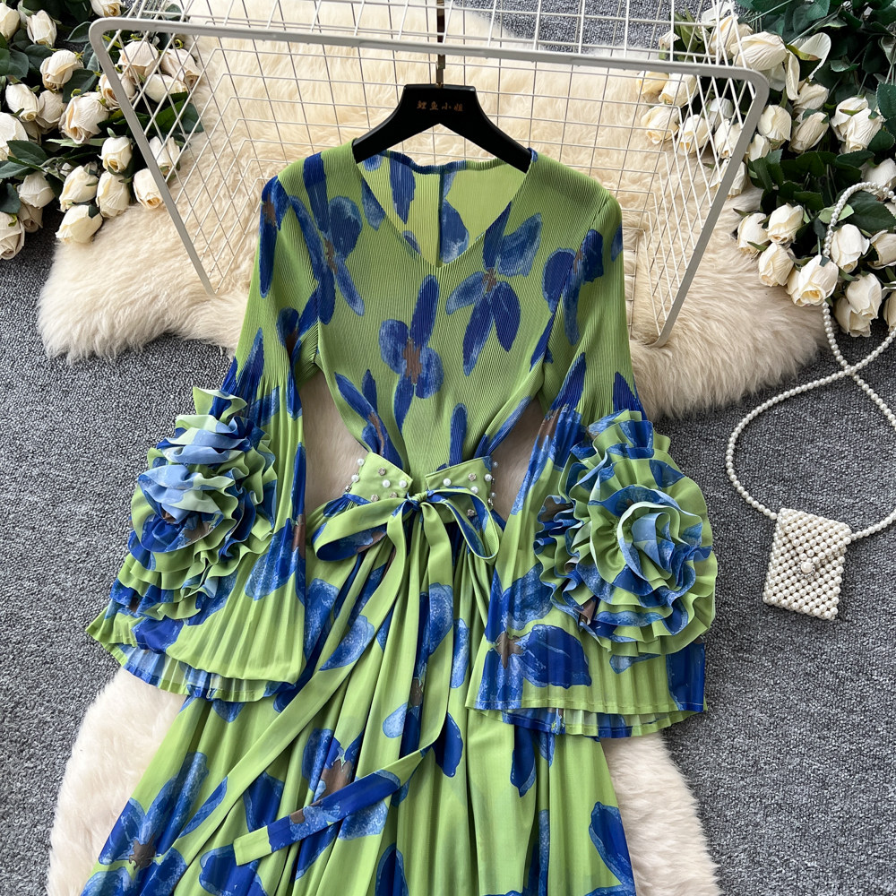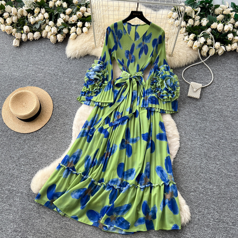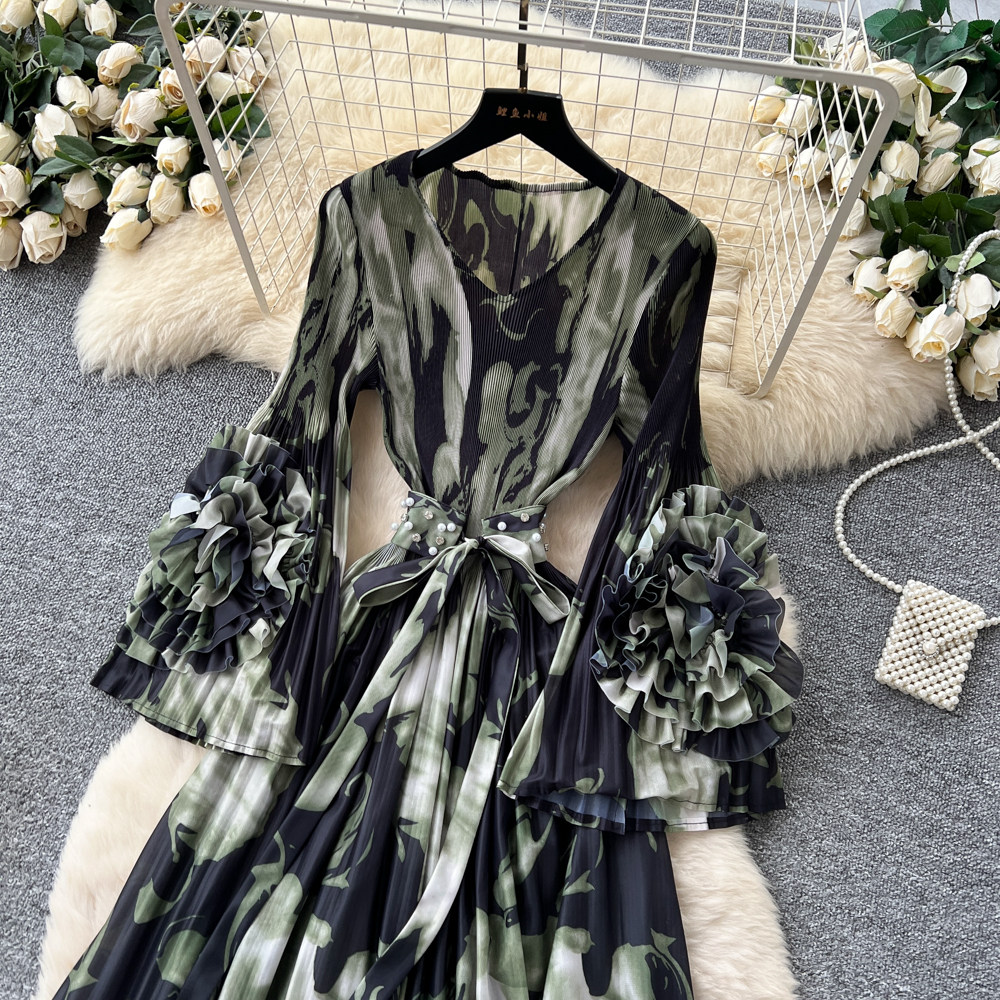 【ワンピース】フレンチ花柄ワンピース Vネック 長袖 立体フラワー フレアロング 着痩せ エレガント リゾートワンピ【SHシリーズ】