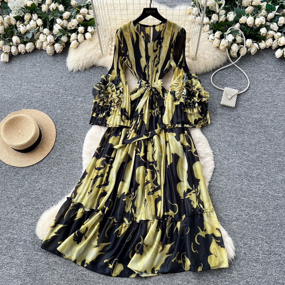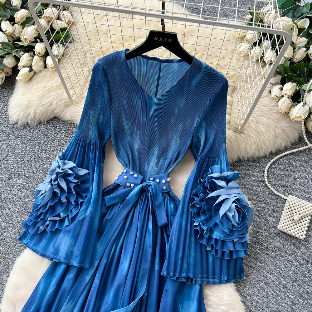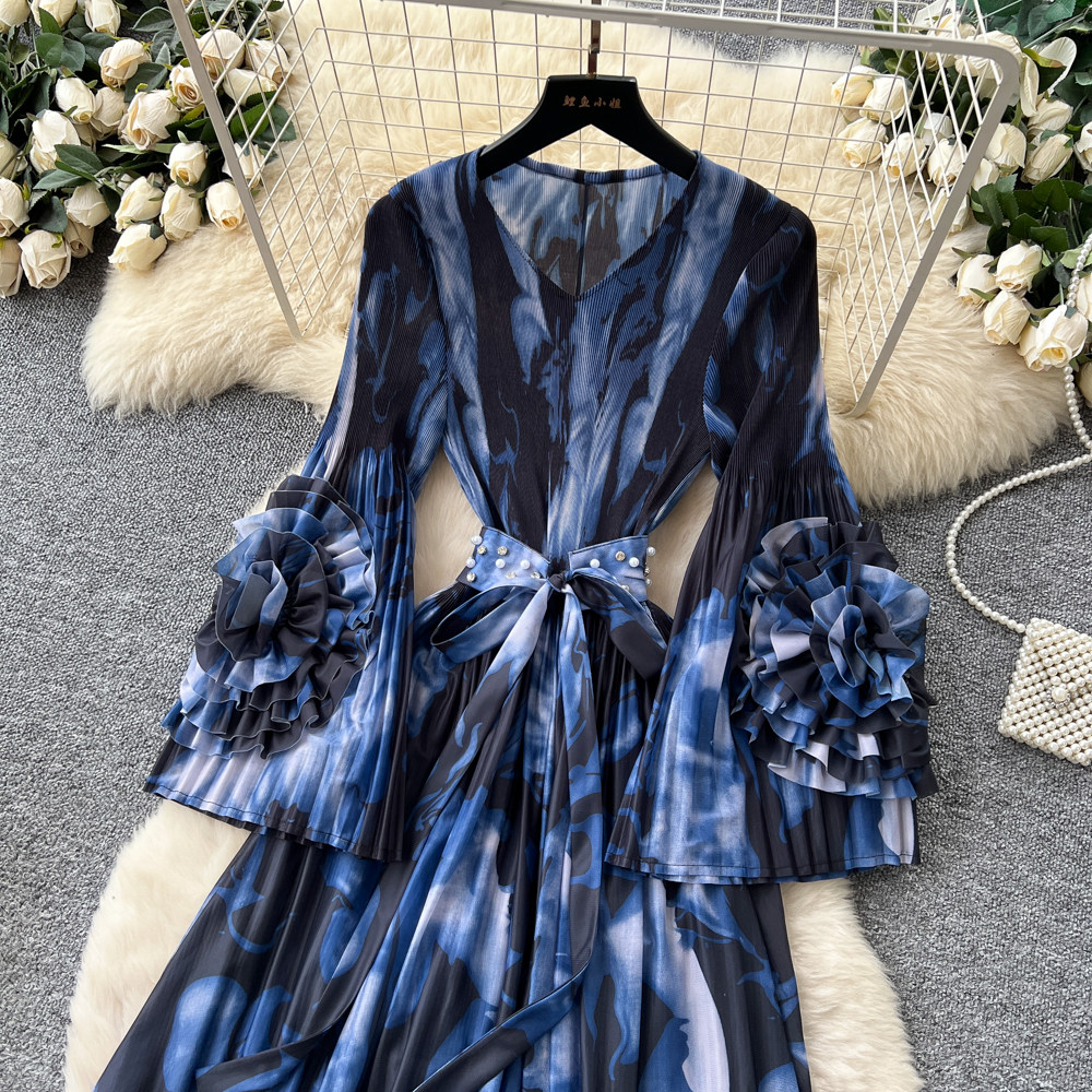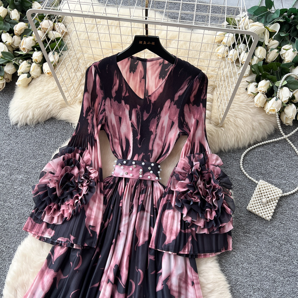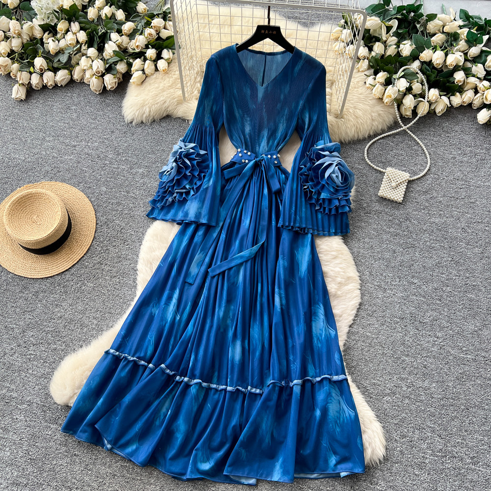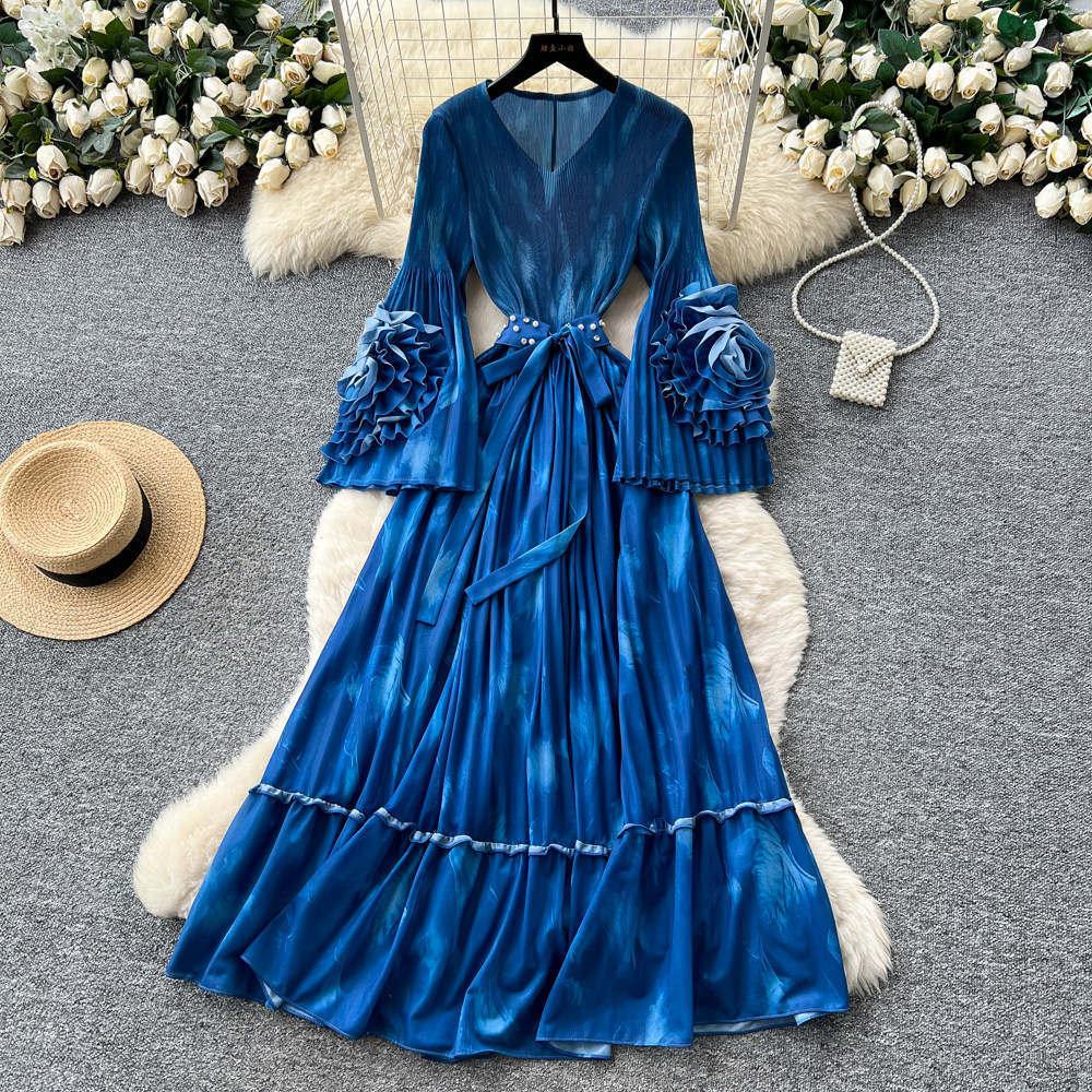 【ワンピース】フレンチ花柄ワンピース Vネック 長袖 立体フラワー フレアロング 着痩せ エレガント リゾートワンピ【SHシリーズ】