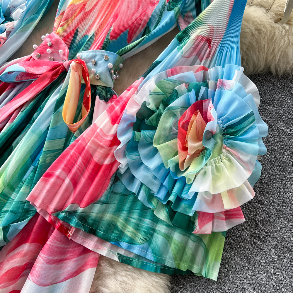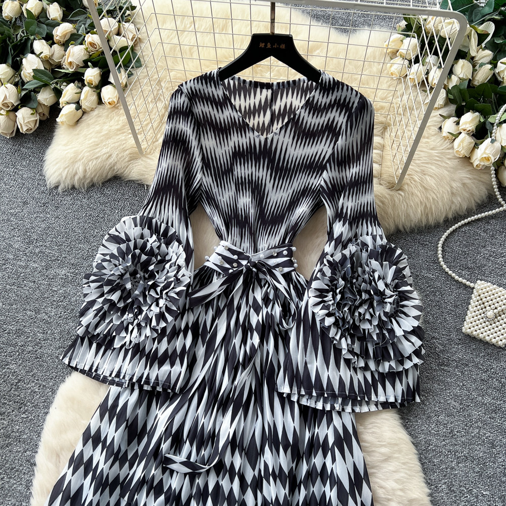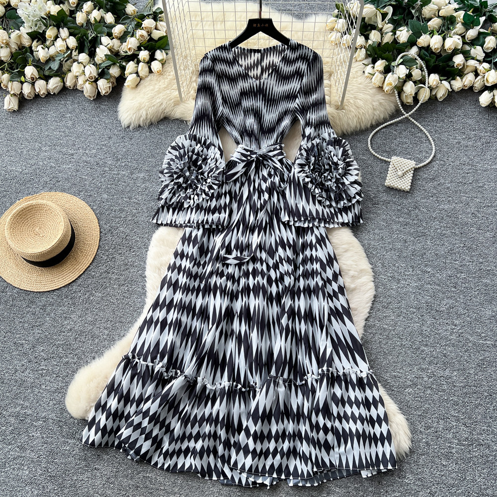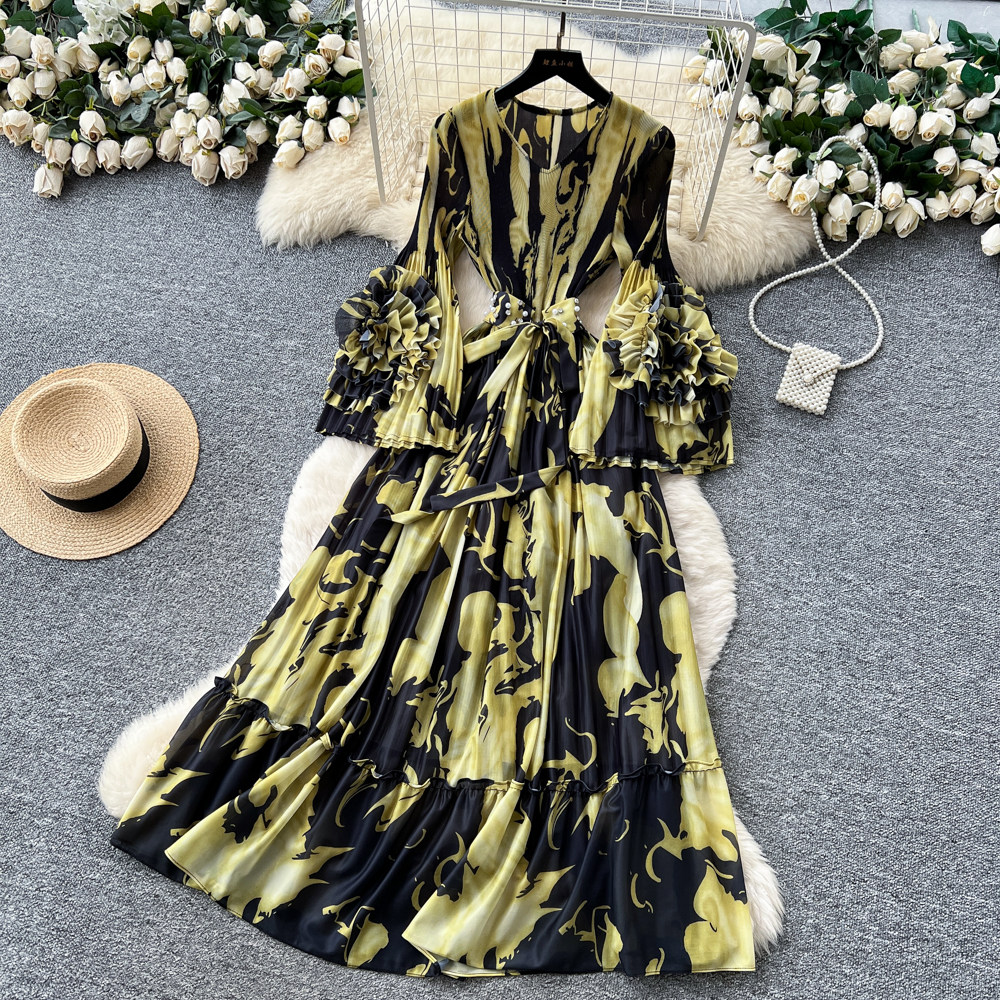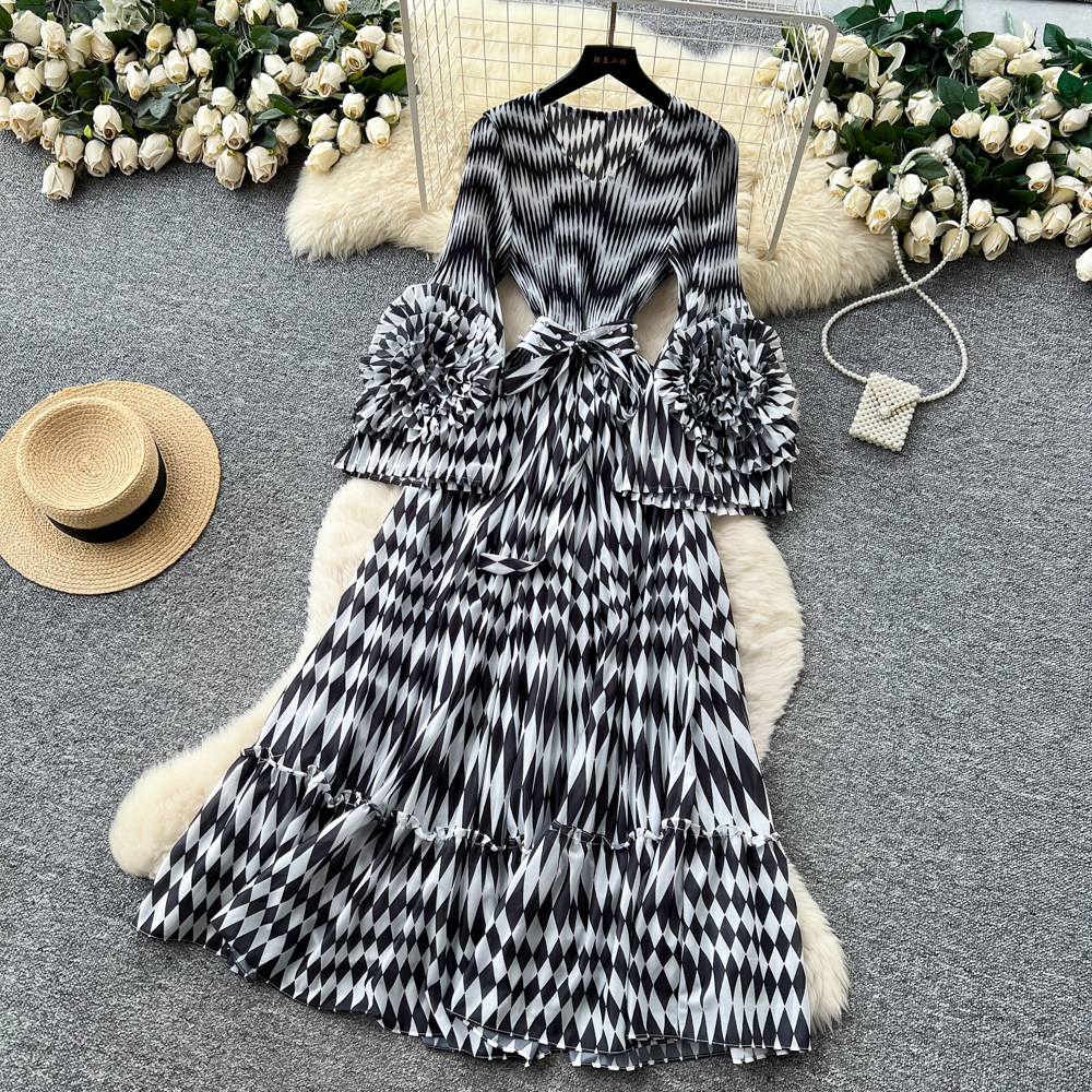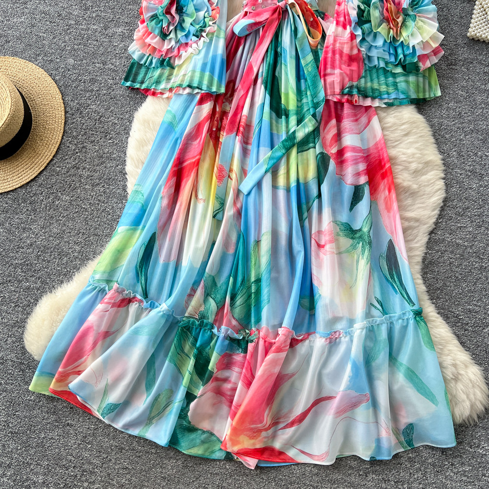 【ワンピース】フレンチ花柄ワンピース Vネック 長袖 立体フラワー フレアロング 着痩せ エレガント リゾートワンピ【SHシリーズ】