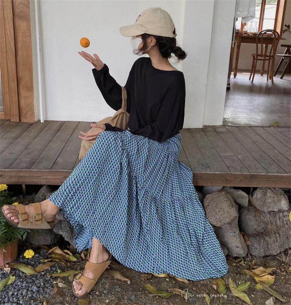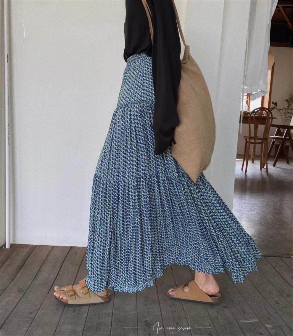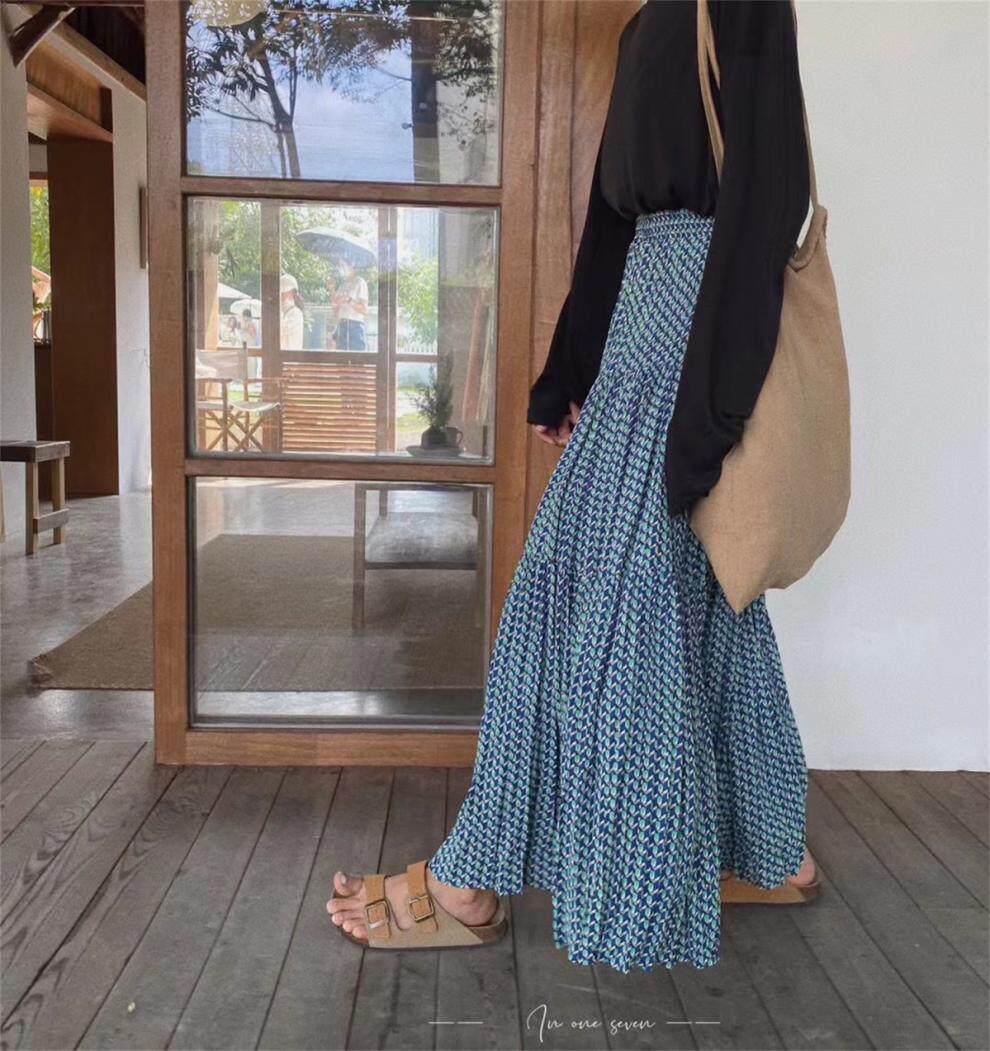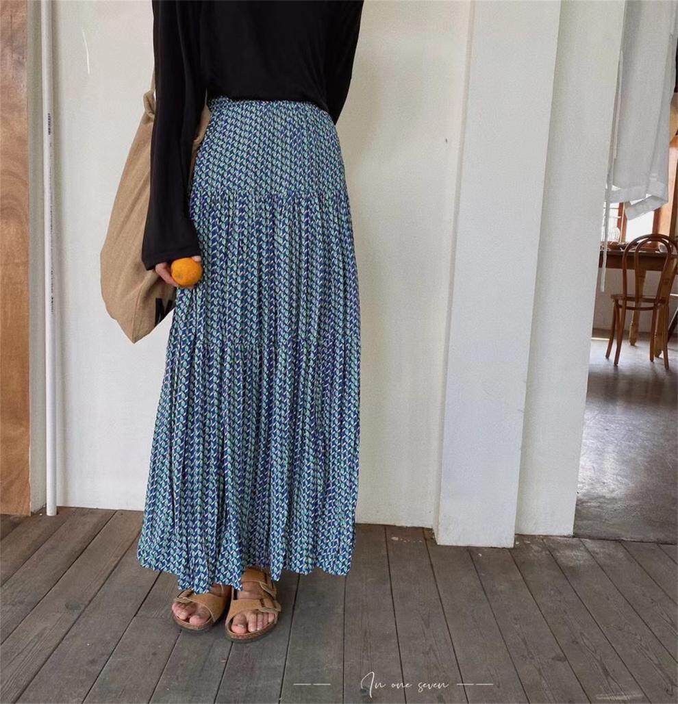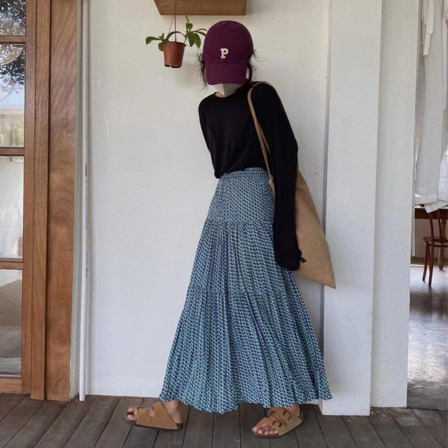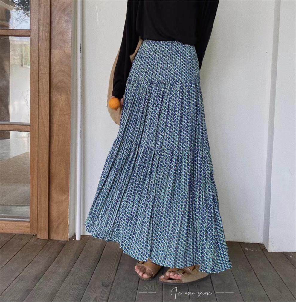 【ボトムス】ハイウエスト フラワープリーツスカート ロング丈 ゆったり 体型カバー 韓国風 おしゃれコーデ【SHシリーズ】
