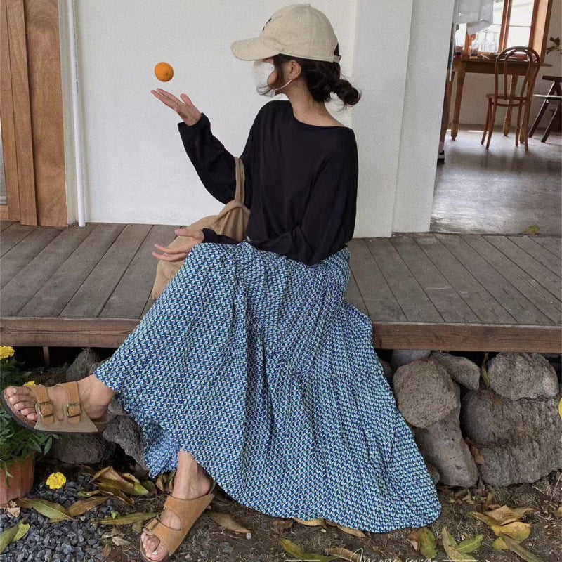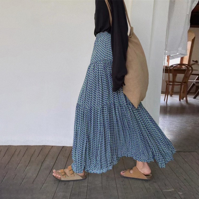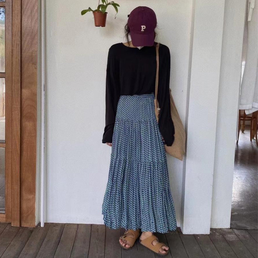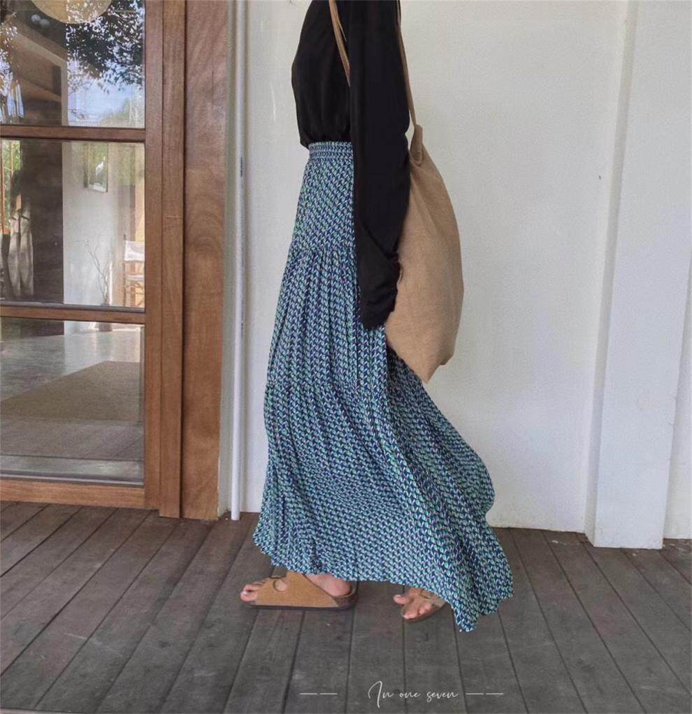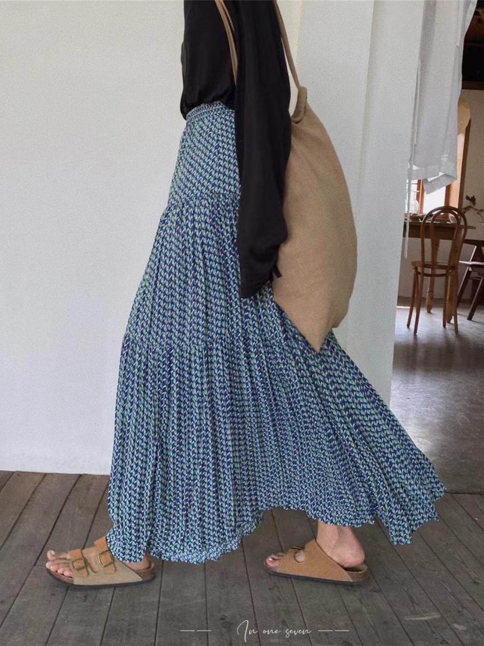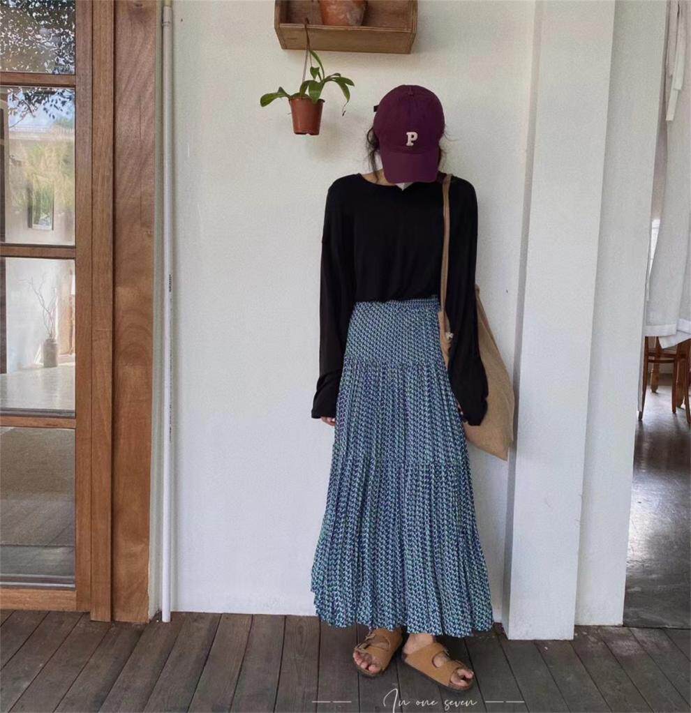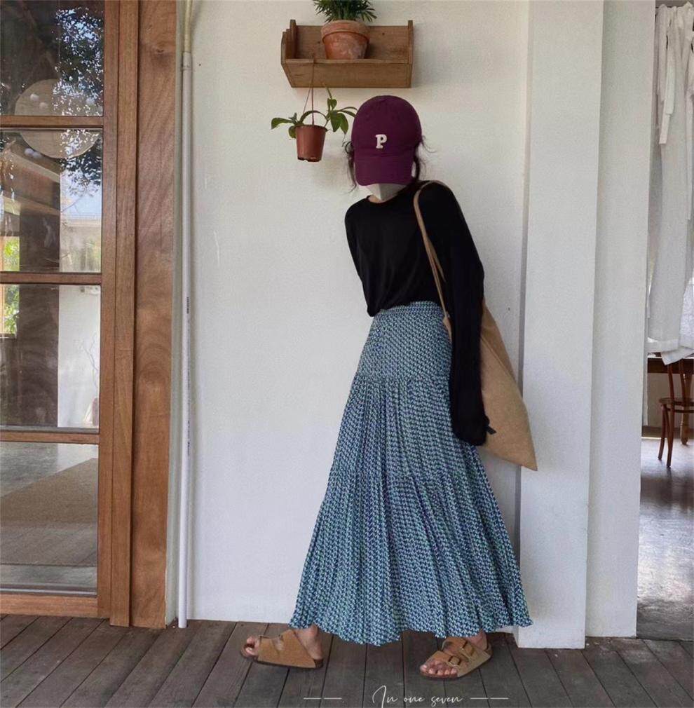 【ボトムス】ハイウエスト フラワープリーツスカート ロング丈 ゆったり 体型カバー 韓国風 おしゃれコーデ【SHシリーズ】