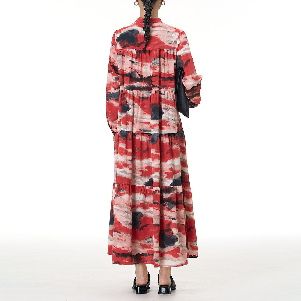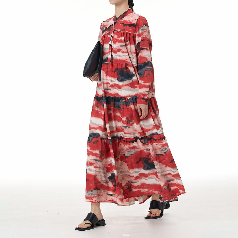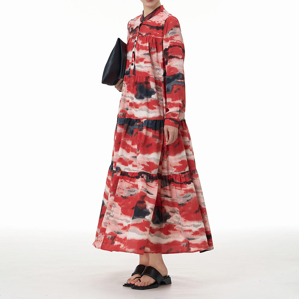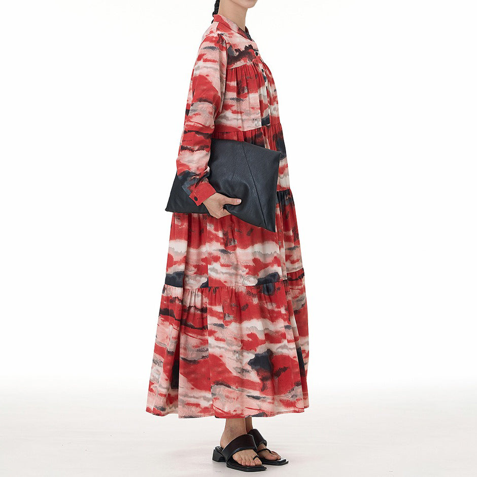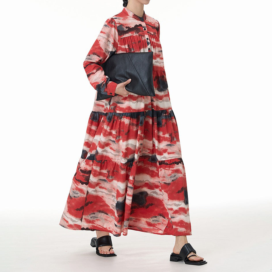 【ワンピース】ヴィンテージ風 ティアードワンピース 春夏新作 大きいサイズ レディース ルーズシルエット 長袖 着痩せ効果 バカンス・お出かけ向け ロングワンピース【SHシリーズ】