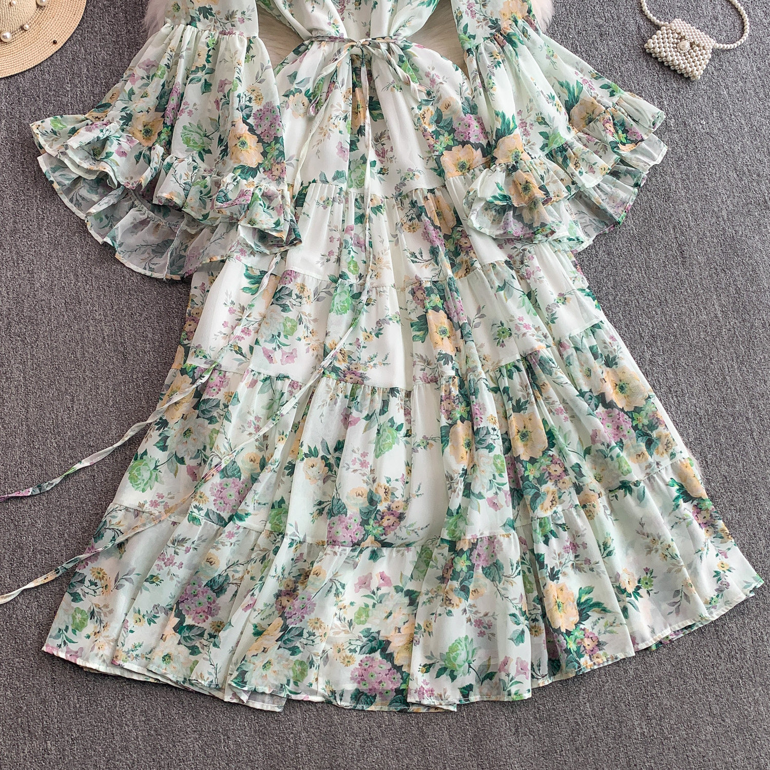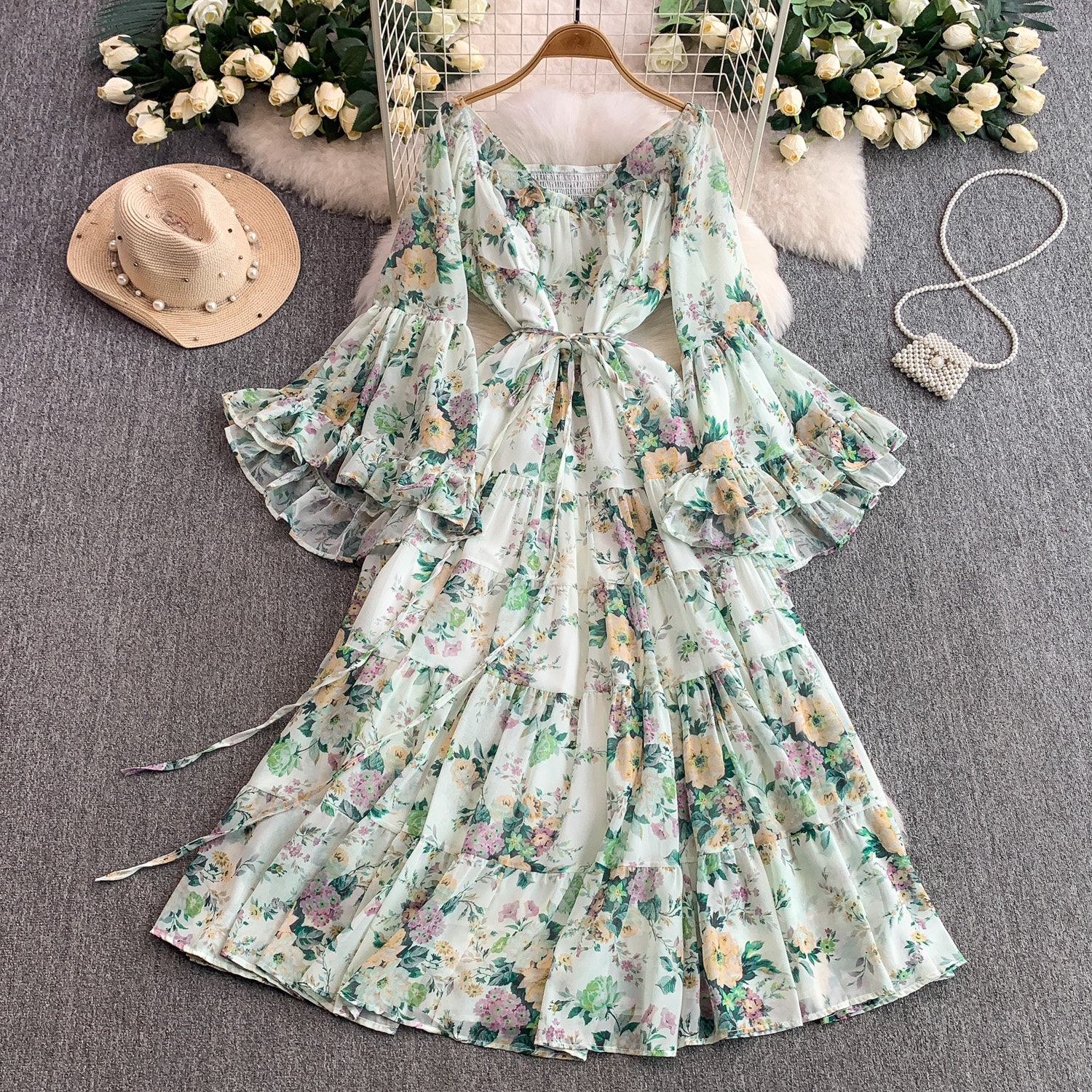 【ワンピース】褒められ確定!フレンチ小衆 長袖 プリントロングワンピース|シフォン&ベルスリーブ【SHシリーズ】