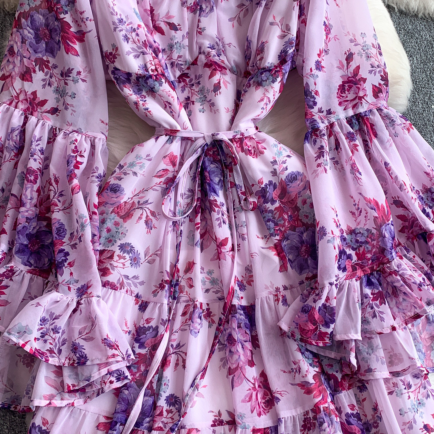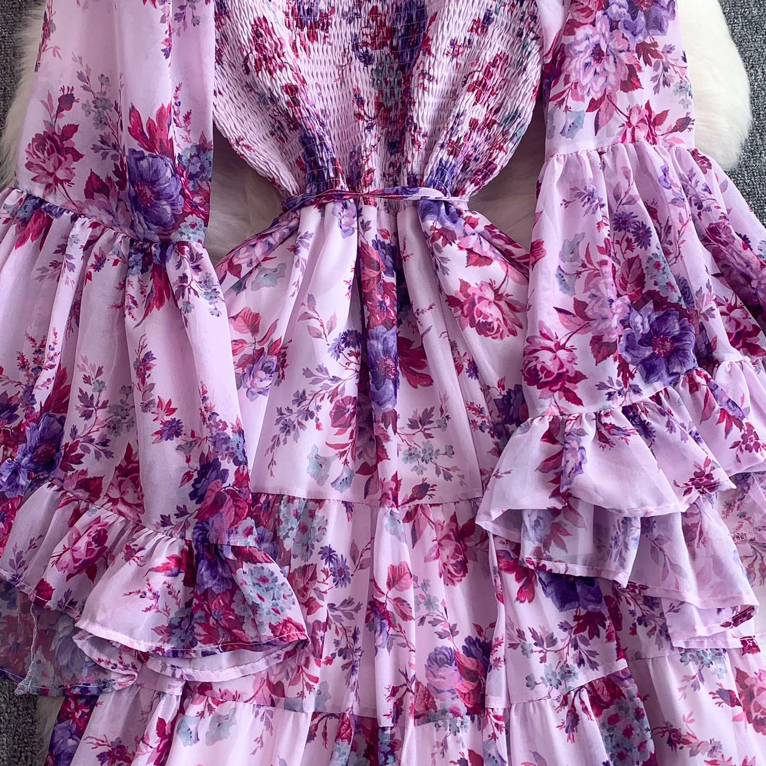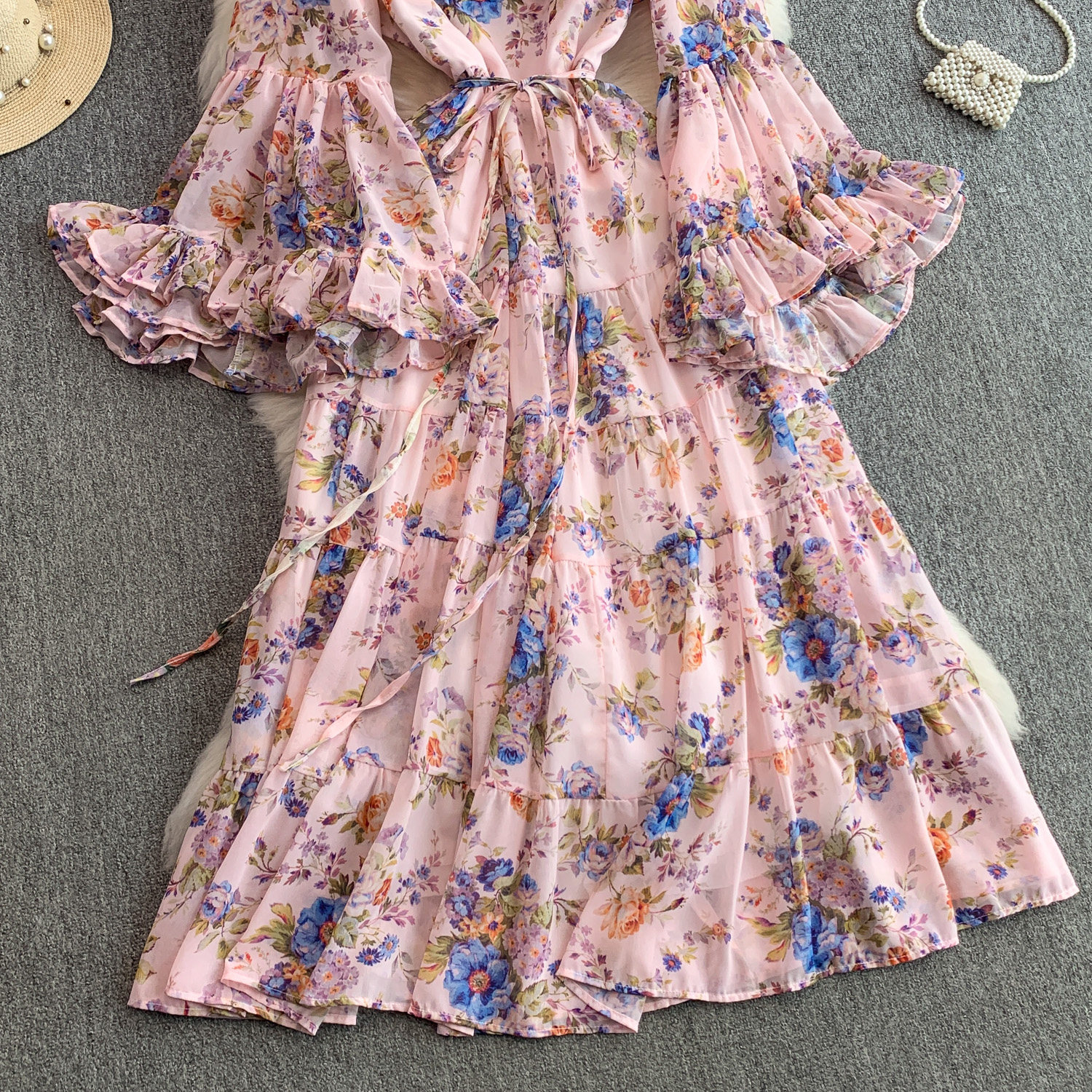 【商品名】【ワンピース】褒められ確定!フレンチ小衆 長袖 プリントロングワンピース|シフォン&ベルスリーブ【SHシリーズ】