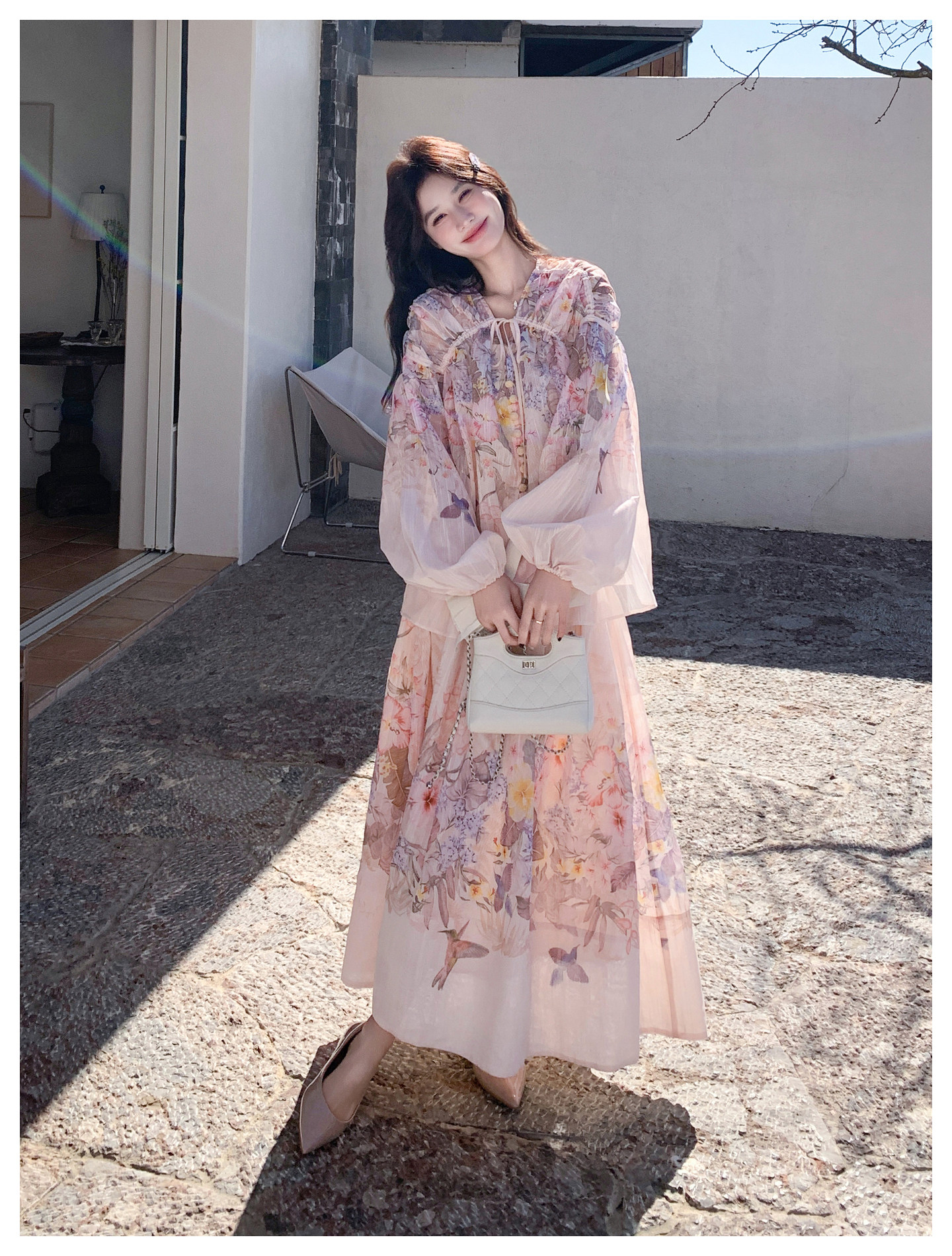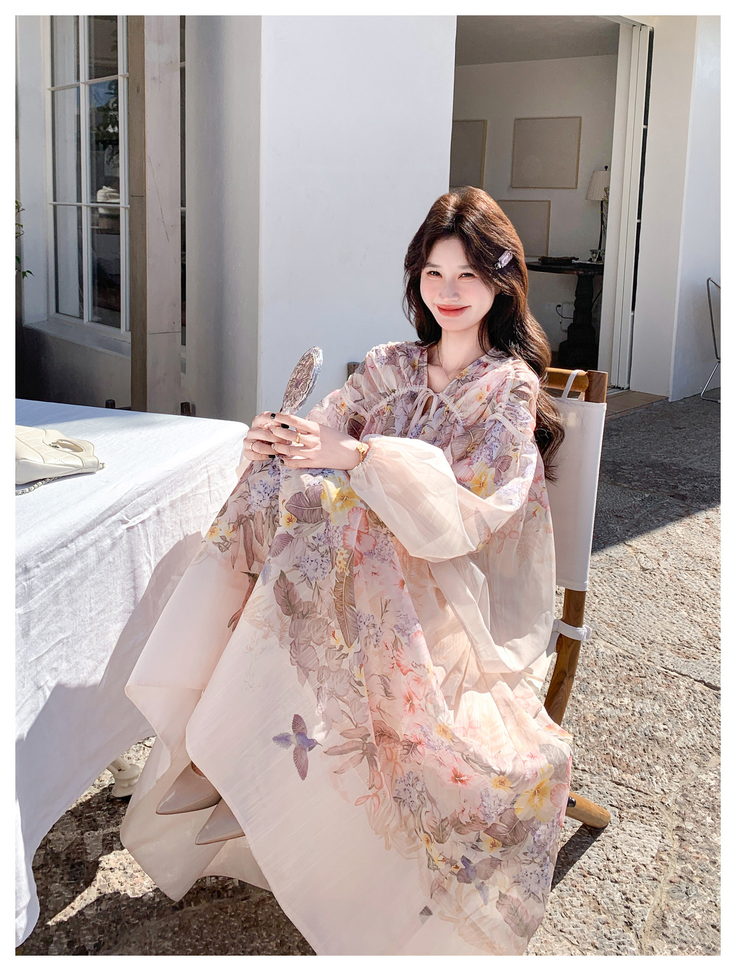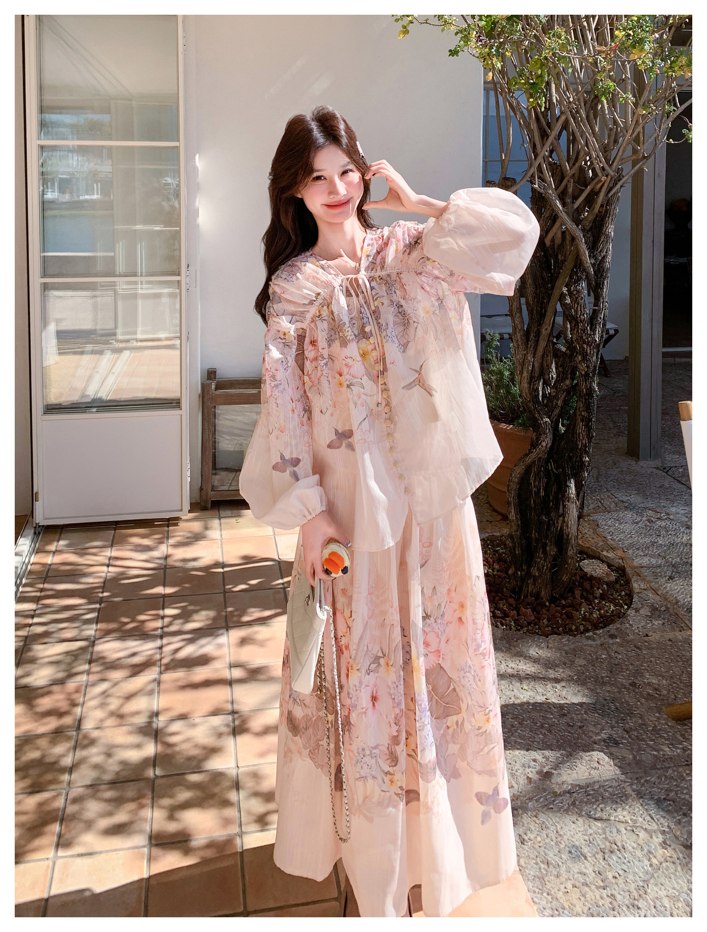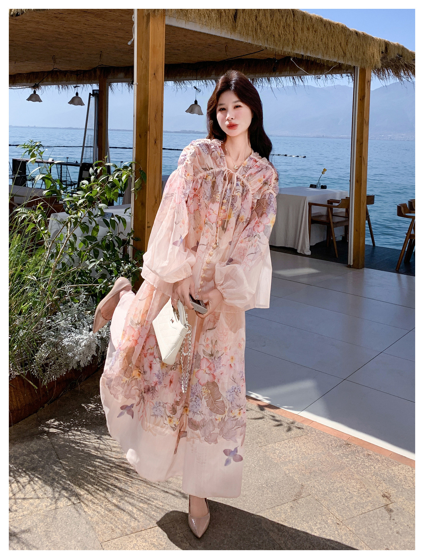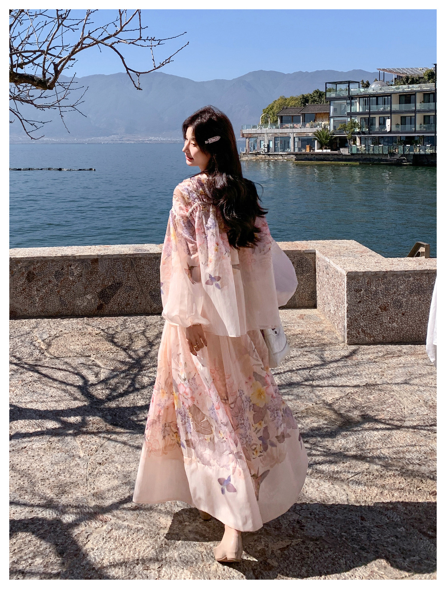 【商品名】2点セット!【セットアップ】リゾートバタフライプリント 2点セット レディース パフスリーブ UVカットシャツ + ハイウエスト フレアスカート 夏 セットアップ【SHシリーズ】