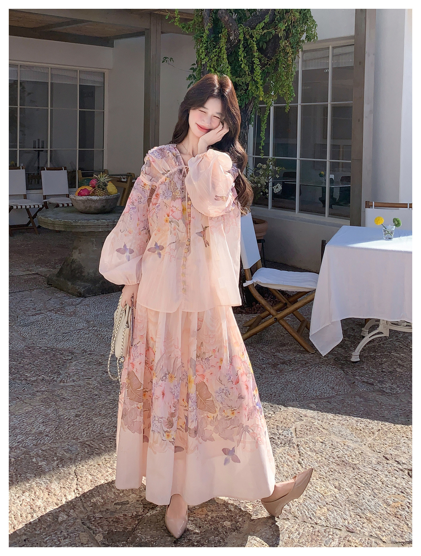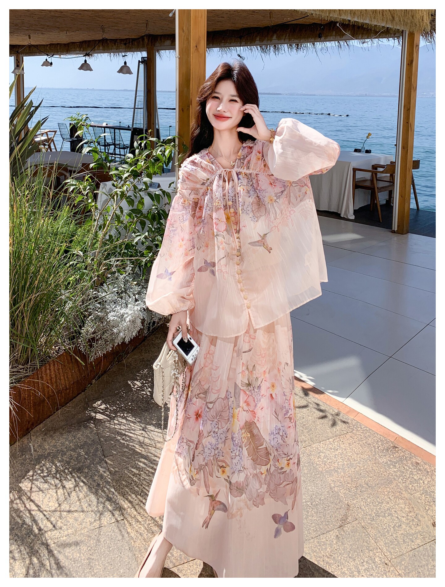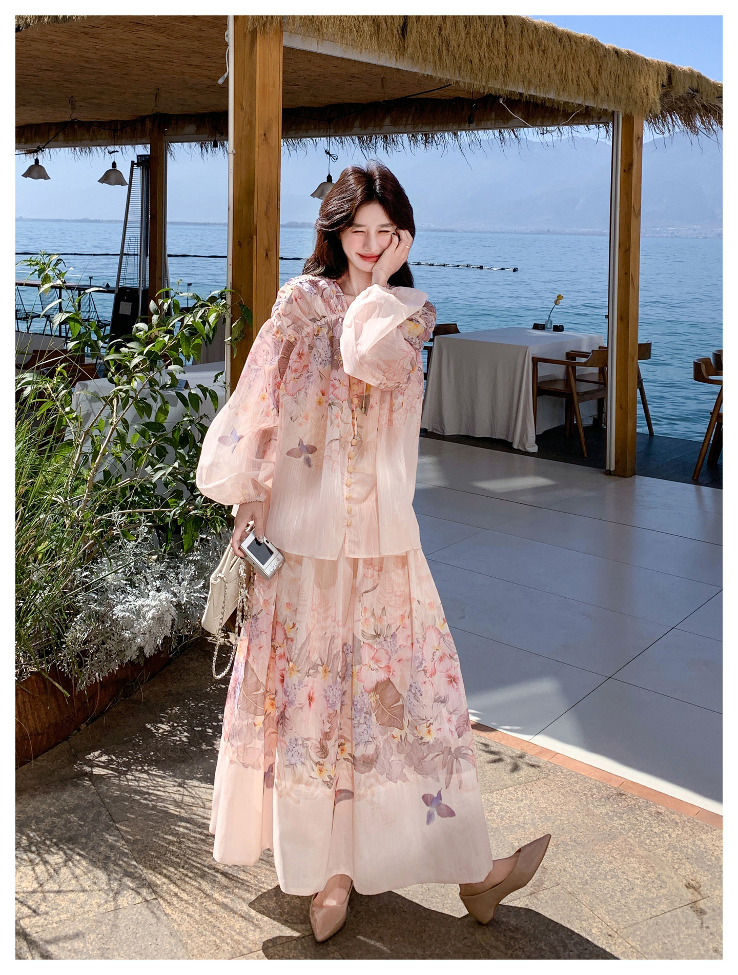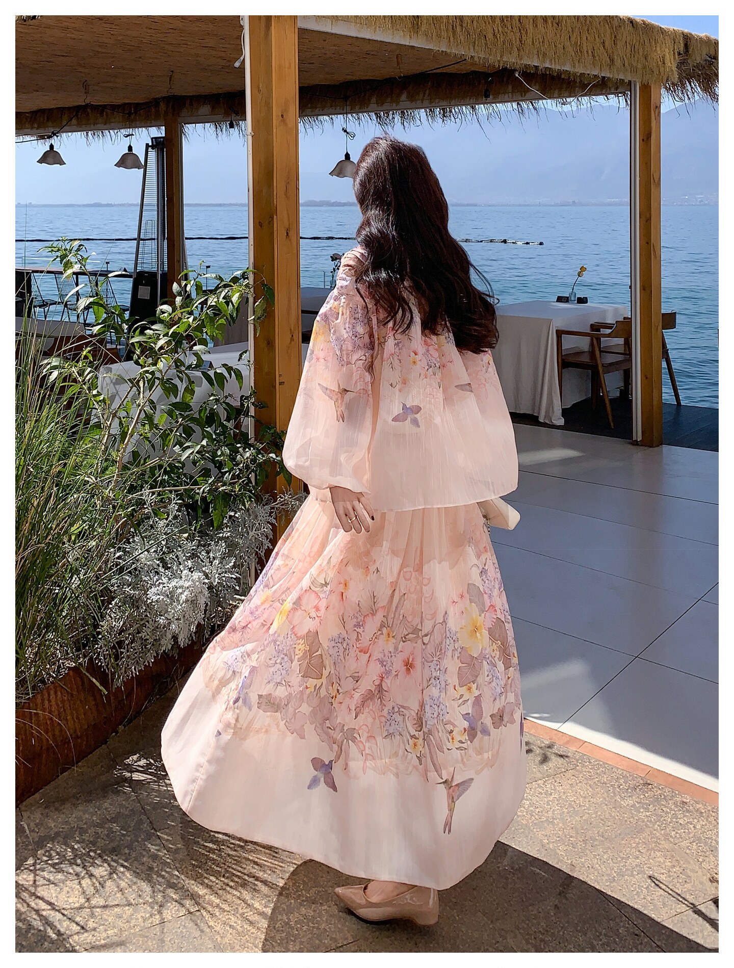 2点セット!【セットアップ】リゾートバタフライプリント 2点セット レディース パフスリーブ UVカットシャツ + ハイウエスト フレアスカート 夏 セットアップ【SHシリーズ】
