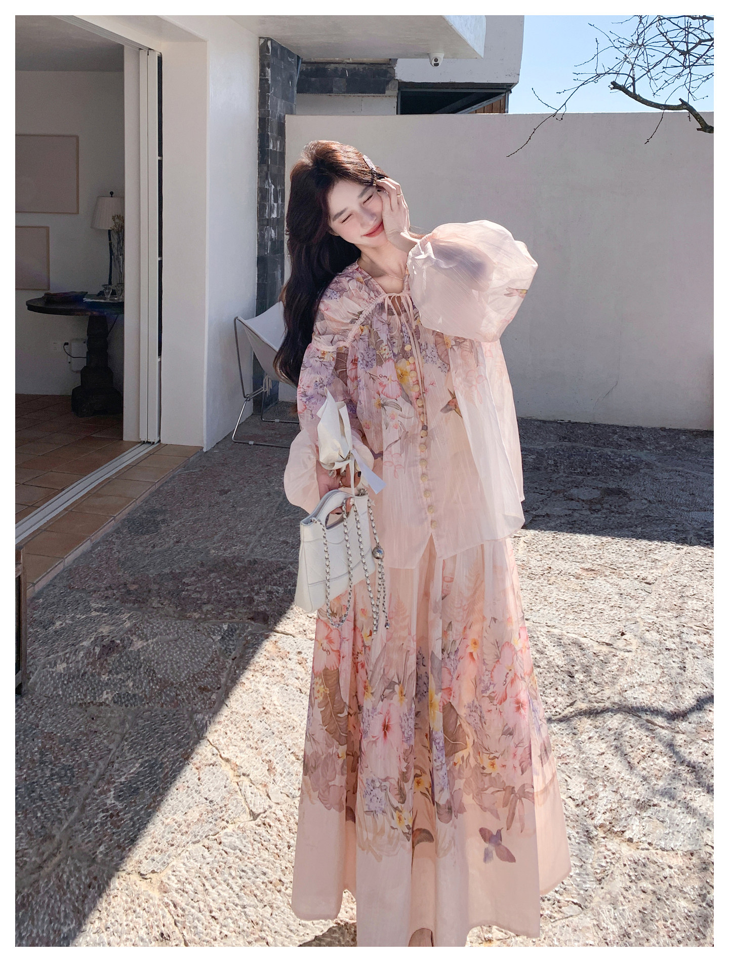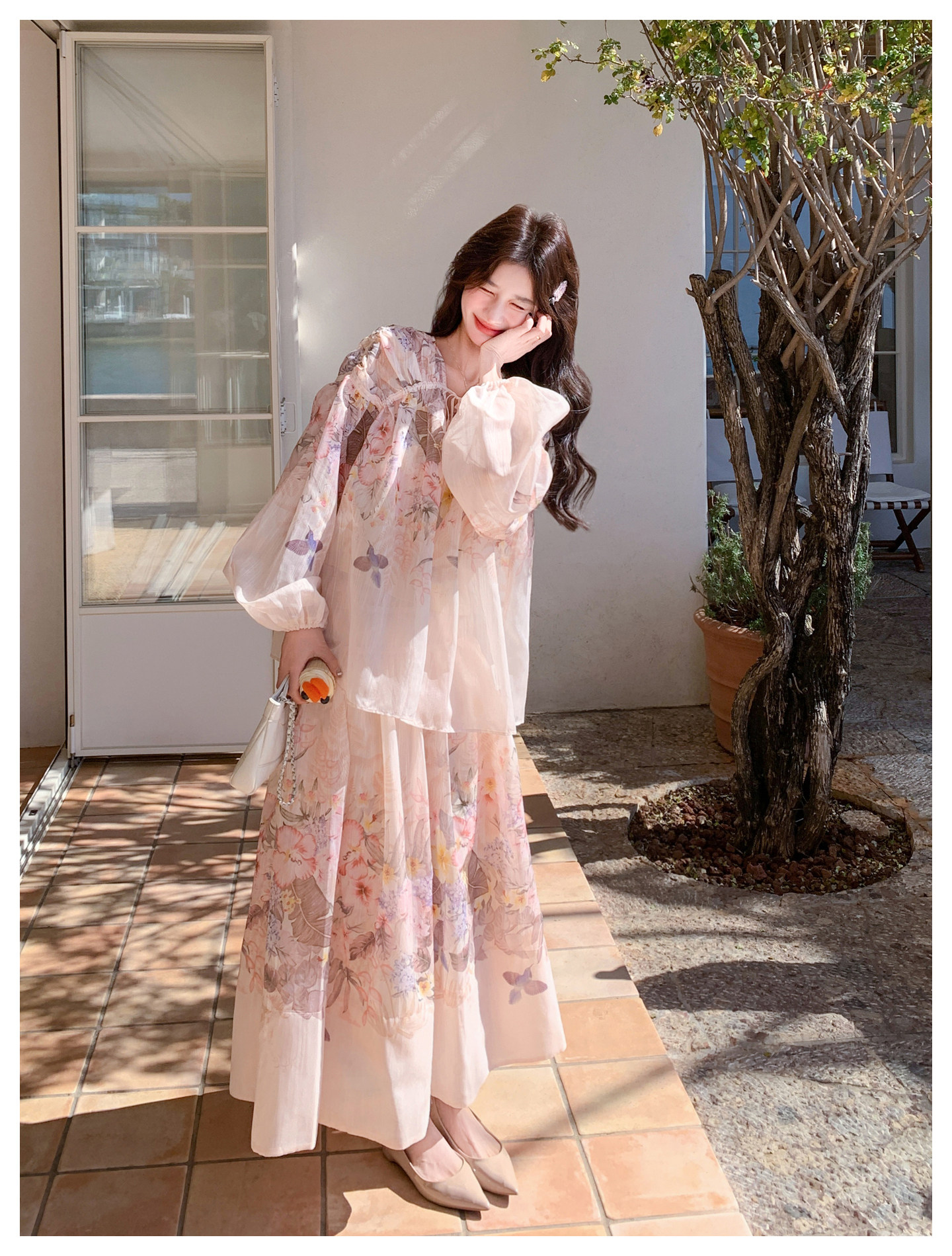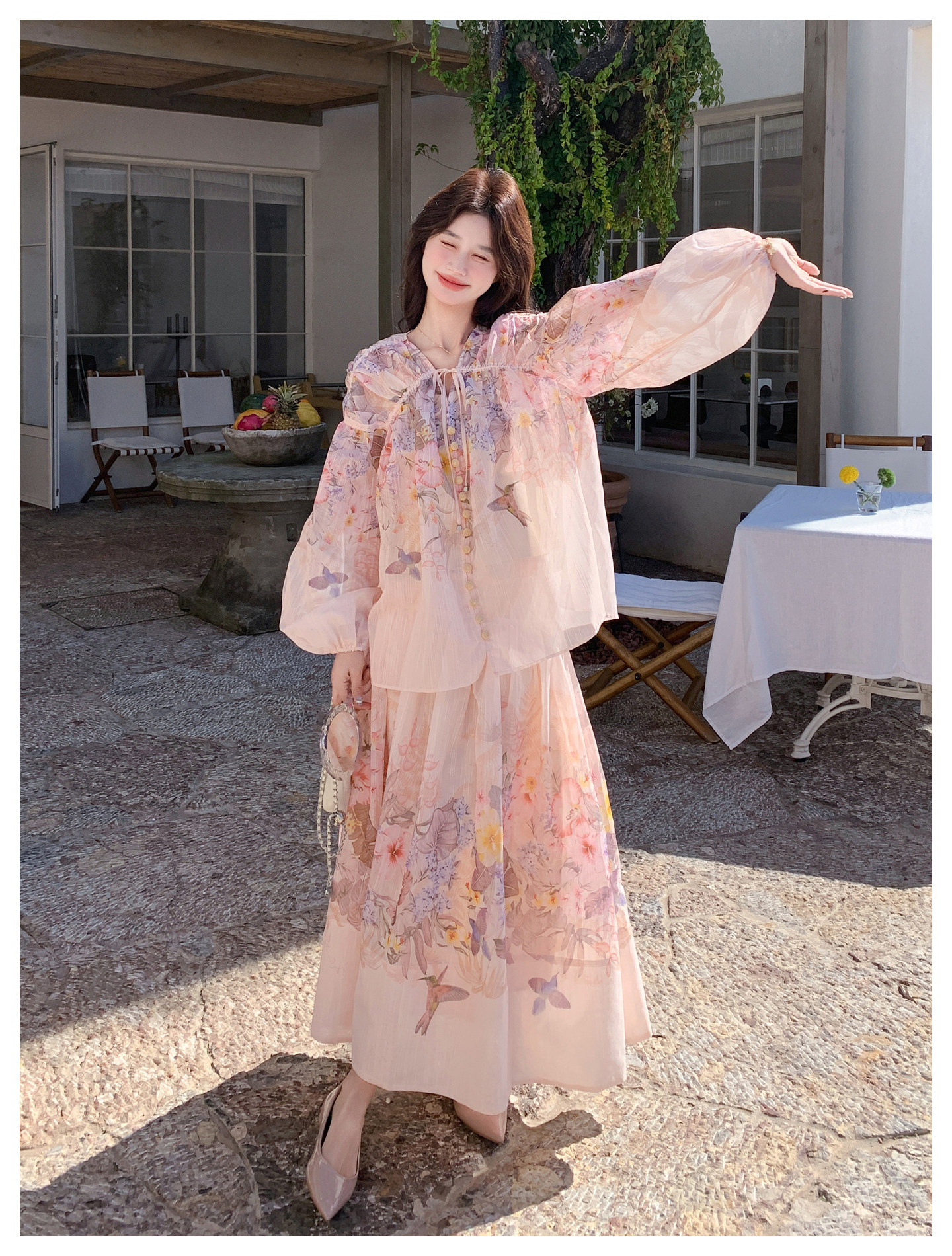 2点セット!【セットアップ】リゾートバタフライプリント 2点セット レディース パフスリーブ UVカットシャツ + ハイウエスト フレアスカート 夏 セットアップ【SHシリーズ】