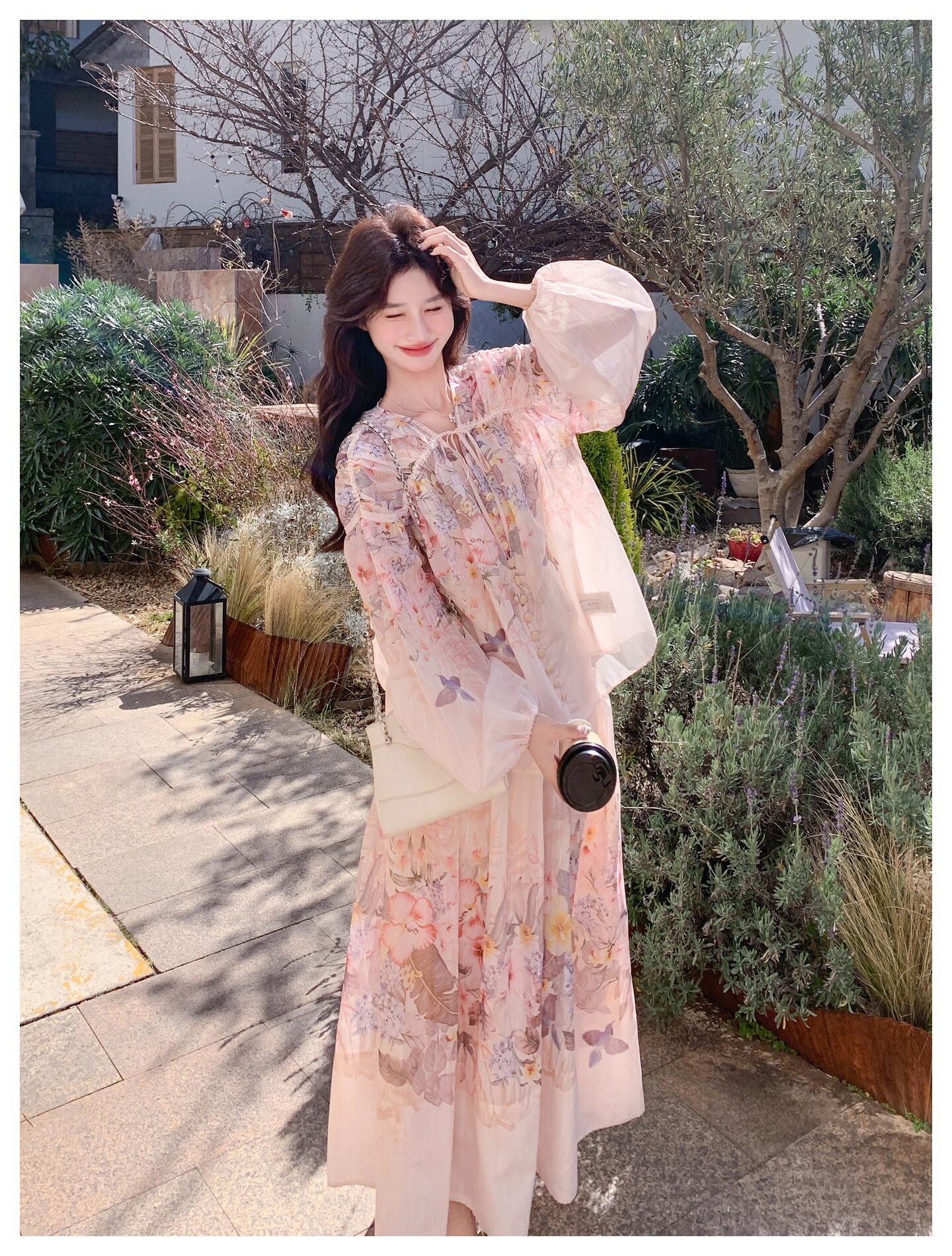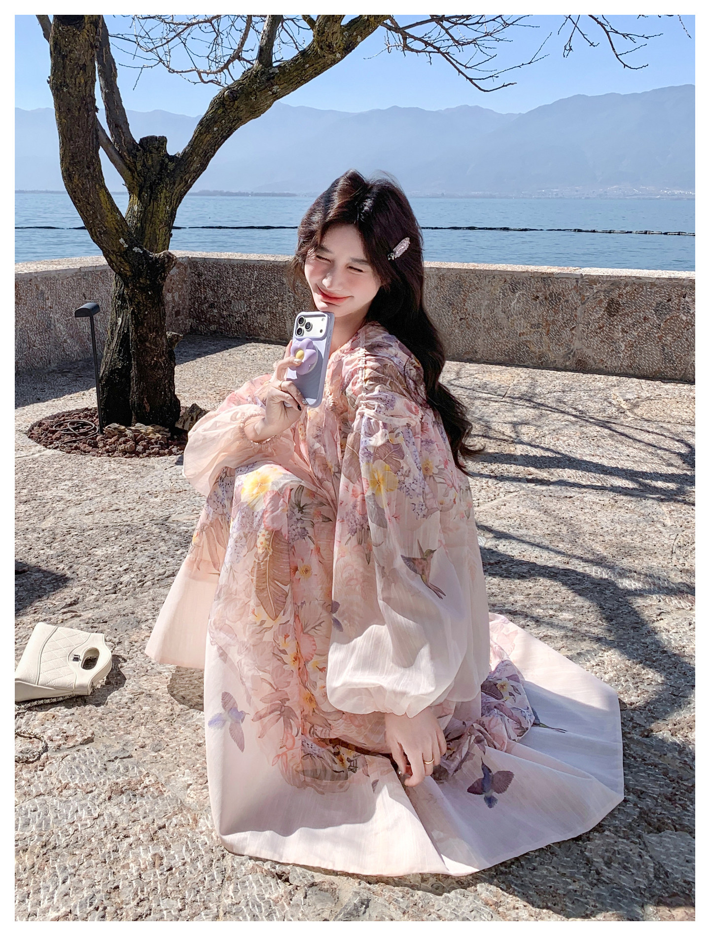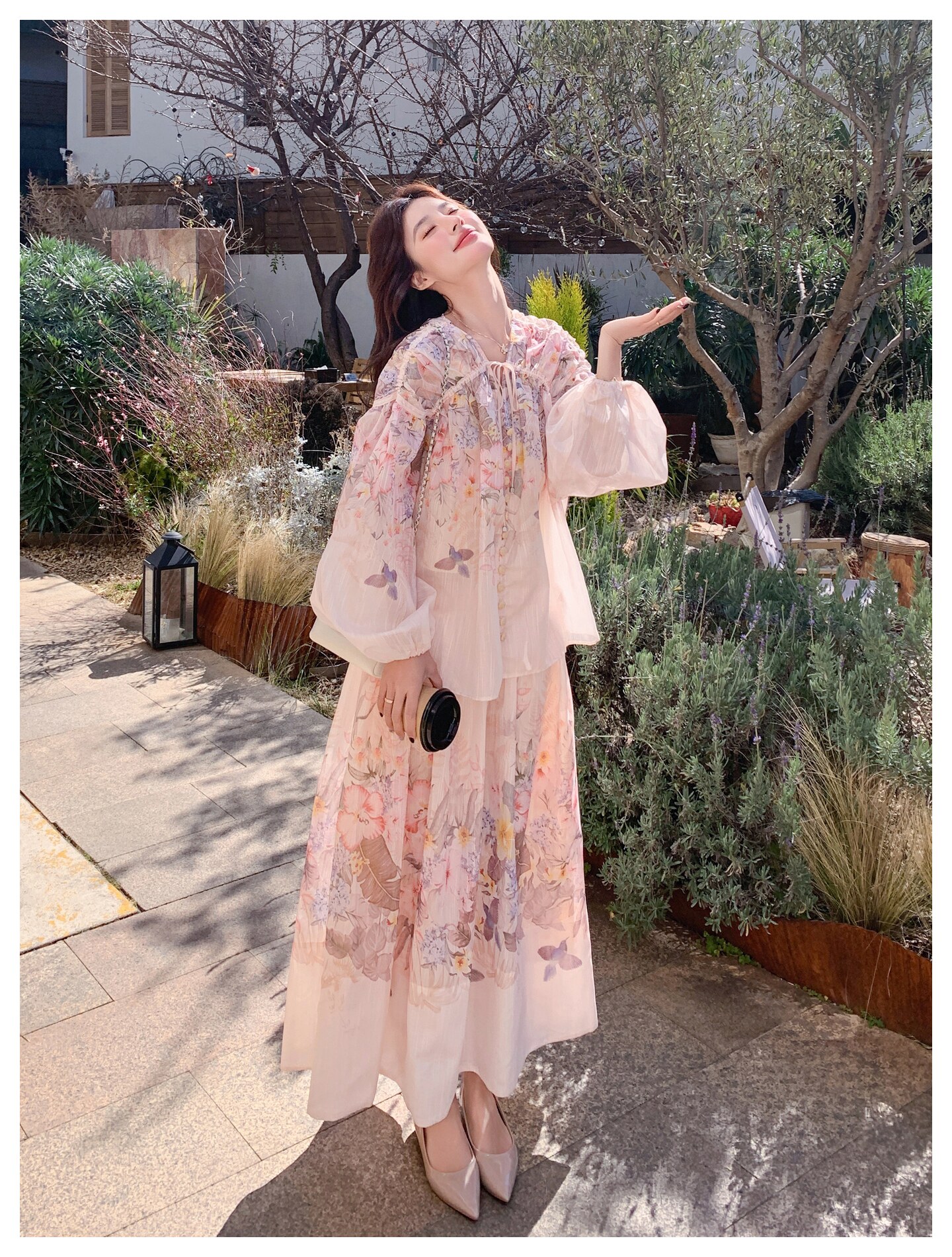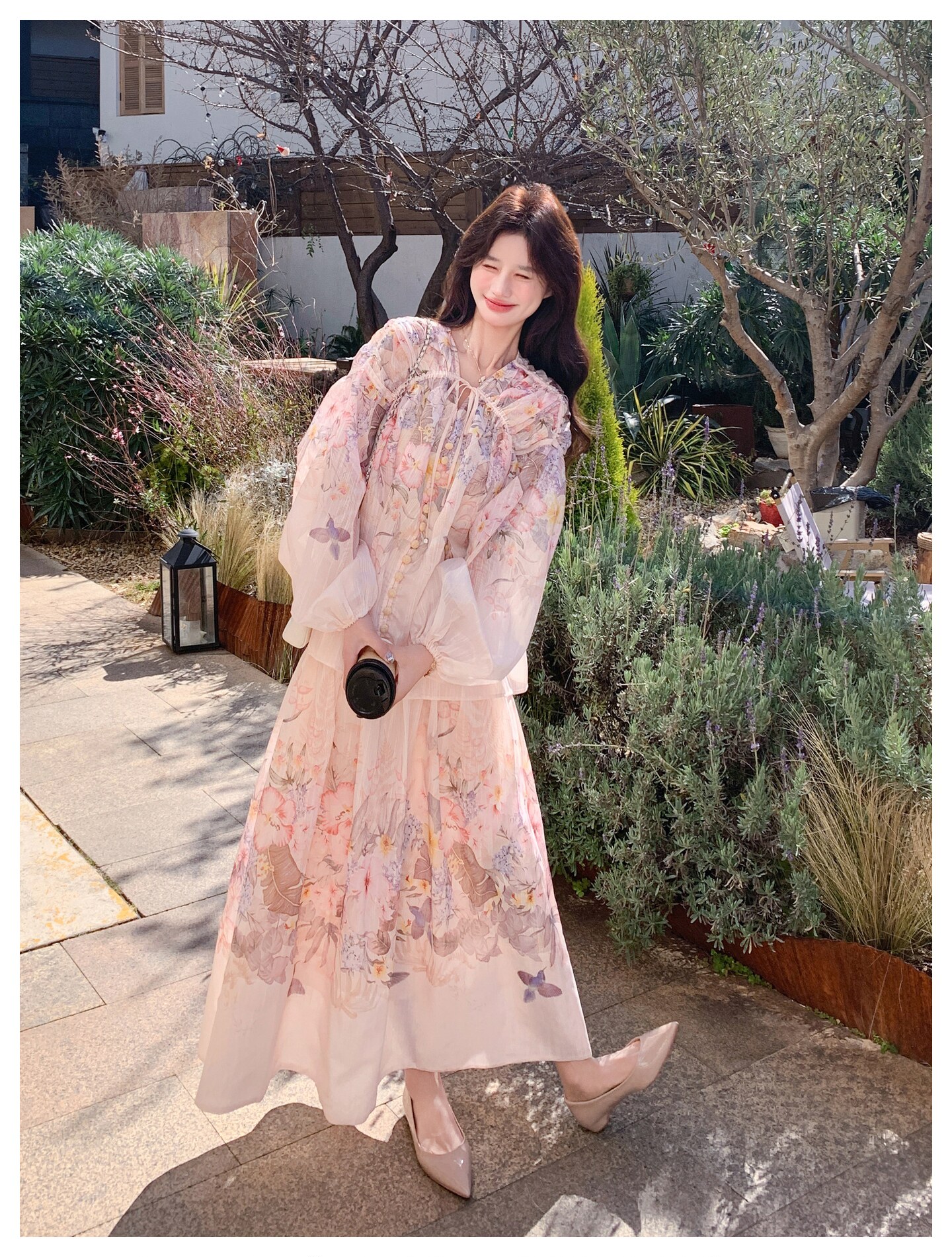2点セット!【セットアップ】リゾートバタフライプリント 2点セット レディース パフスリーブ UVカットシャツ + ハイウエスト フレアスカート 夏 セットアップ【SHシリーズ】