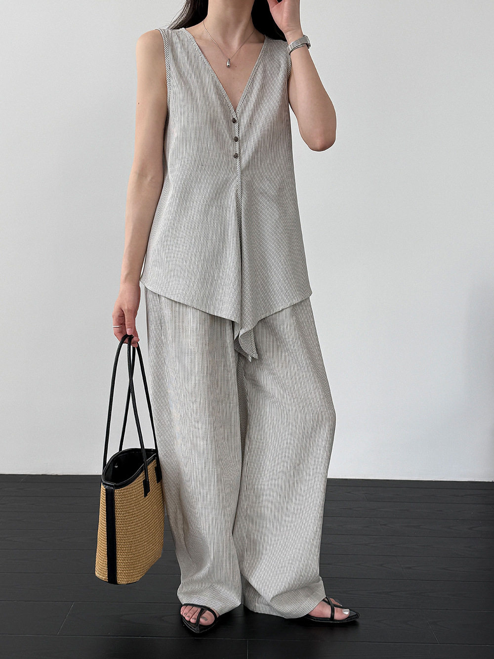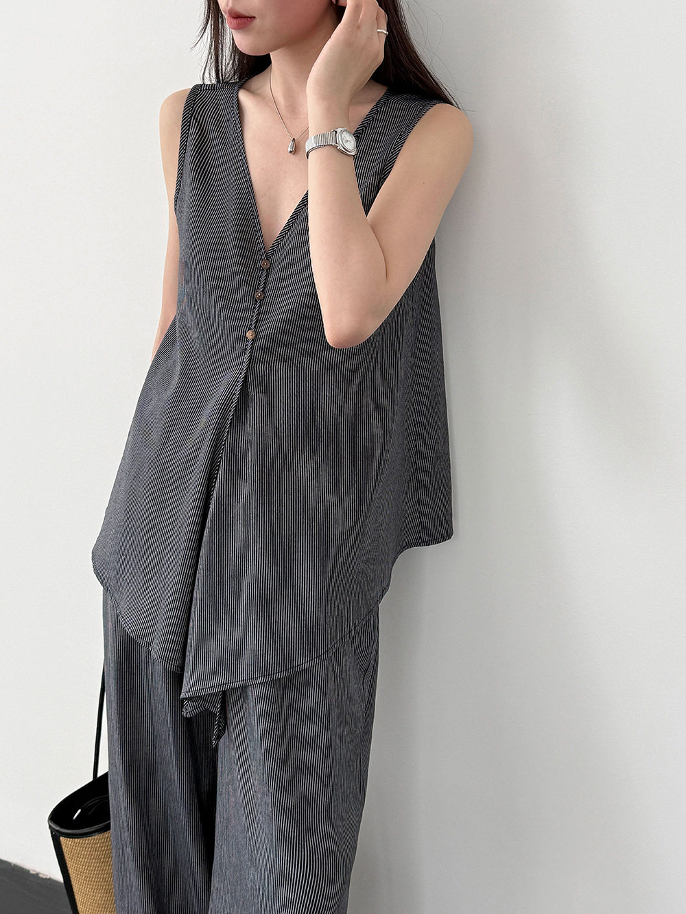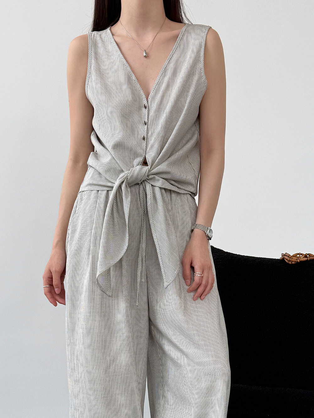 【セットアップ】テンセル×リネン ノースリーブ ストライプトップス + カジュアルロングパンツ 2点上下セット 【JZシリーズ】
