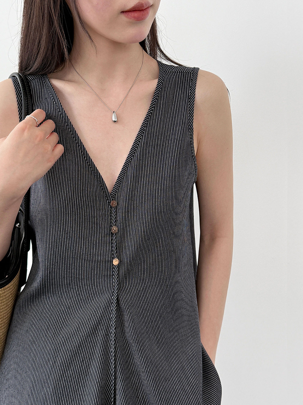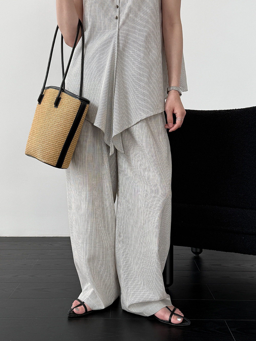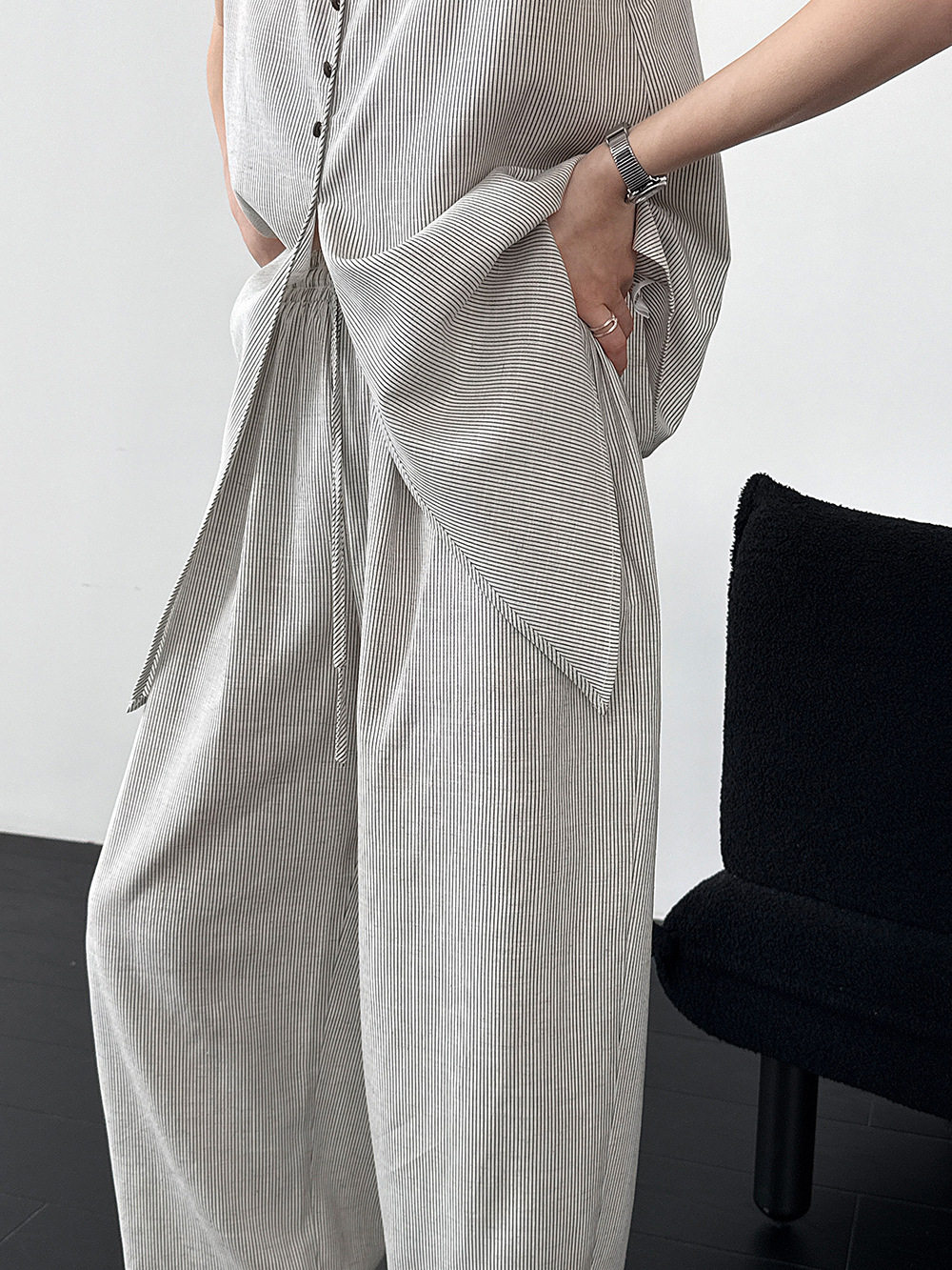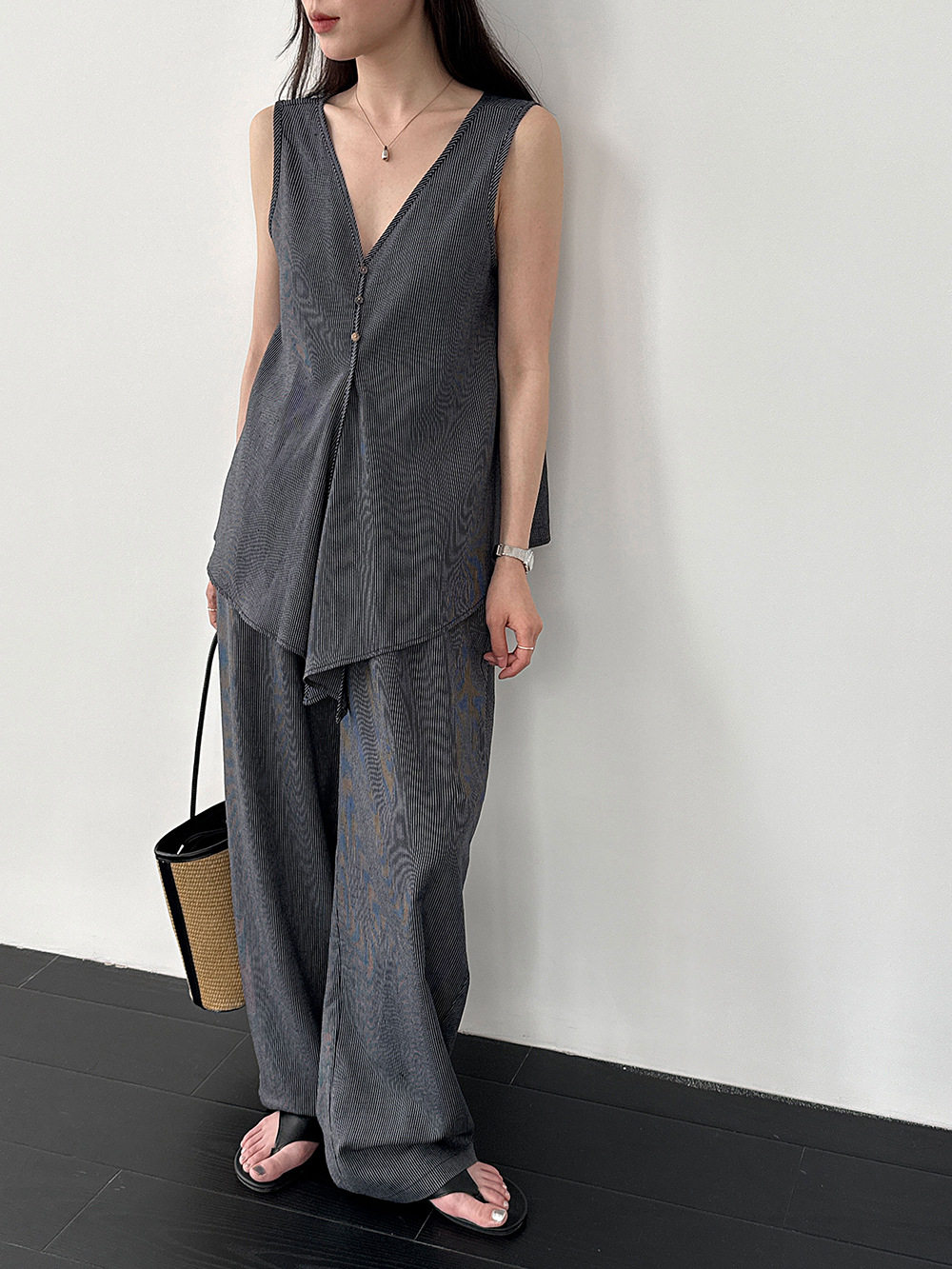 【セットアップ】テンセル×リネン ノースリーブ ストライプトップス + カジュアルロングパンツ 2点上下セット 【JZシリーズ】