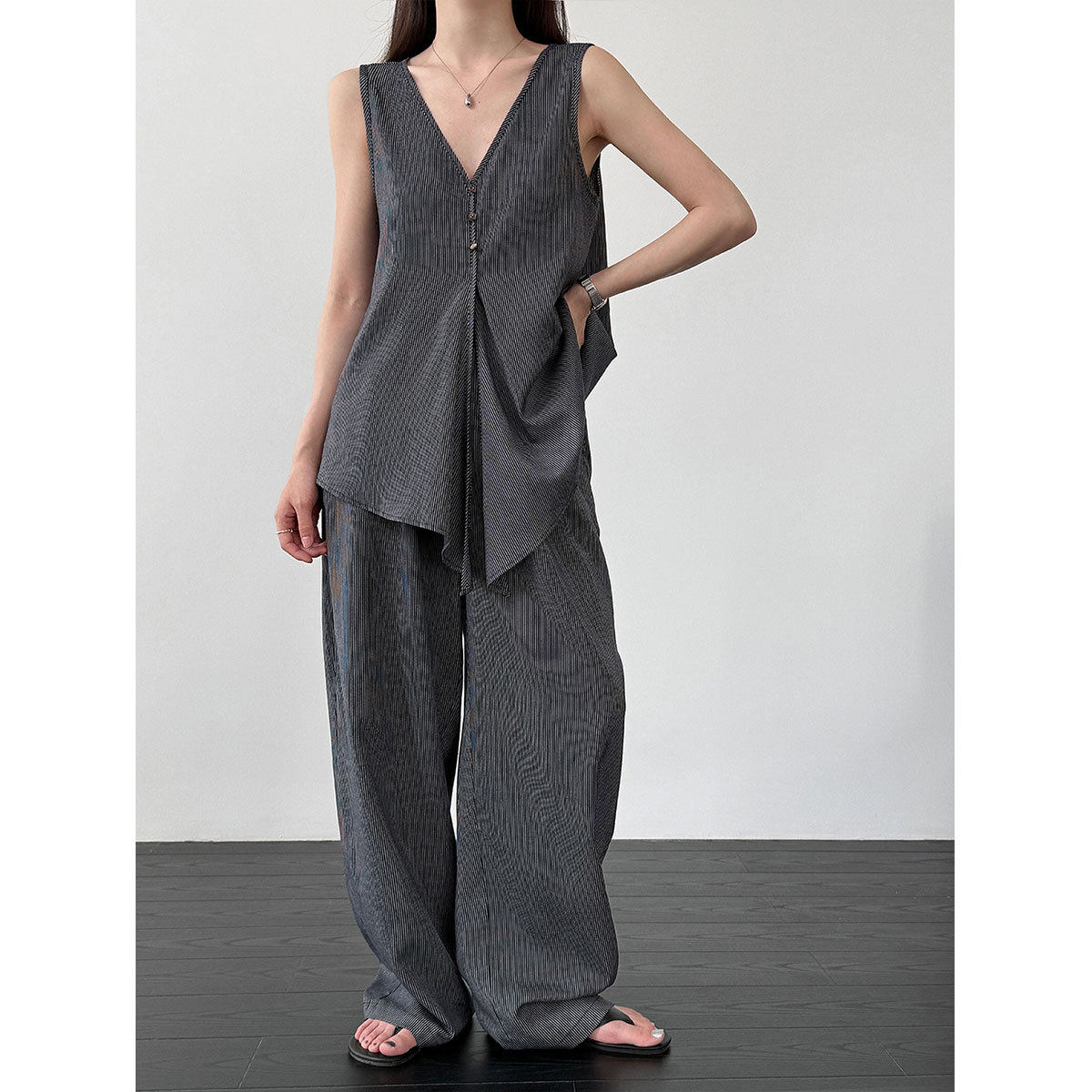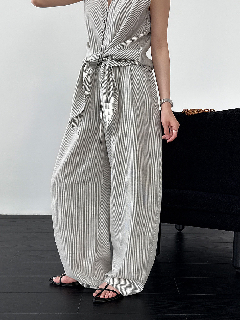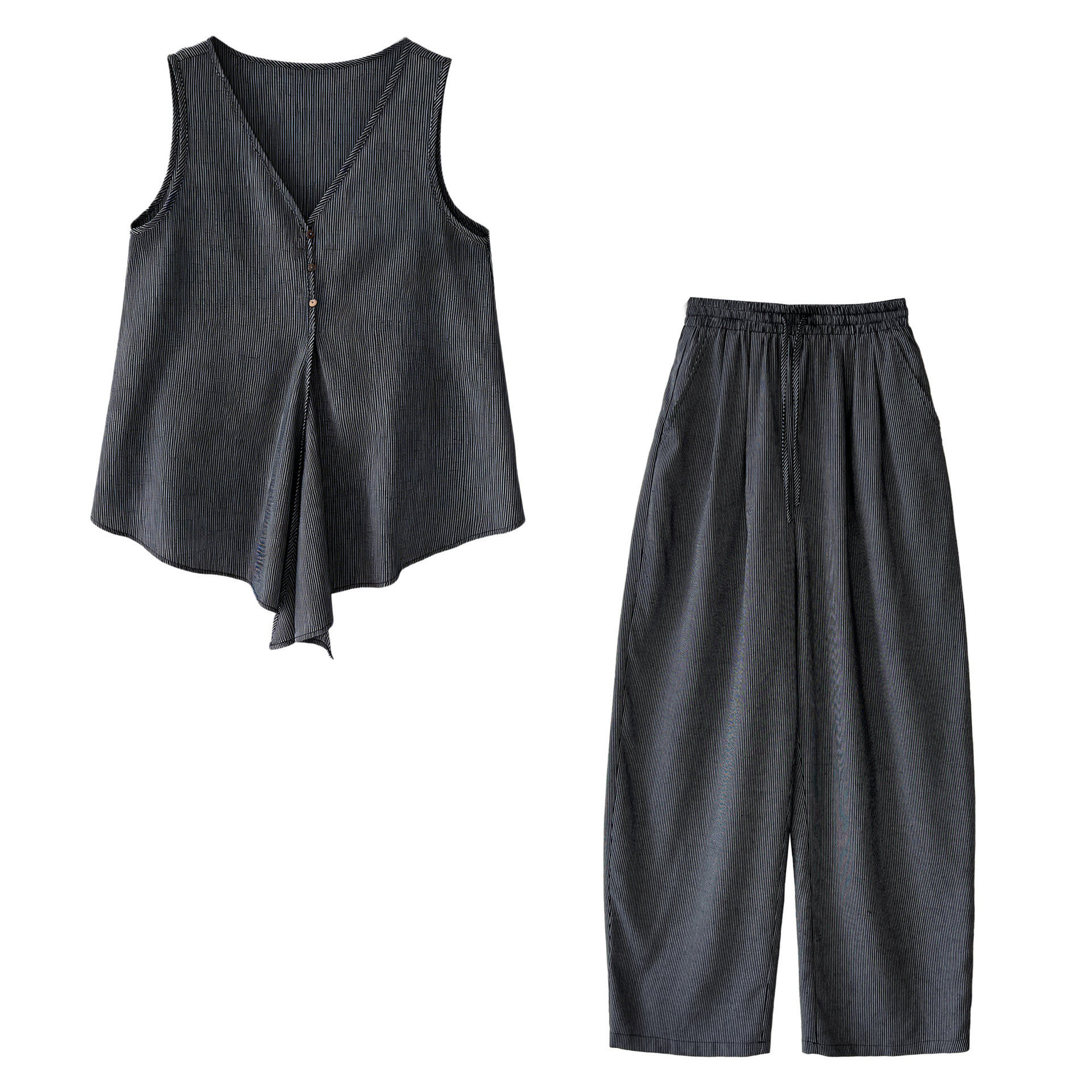 【商品名】【セットアップ】テンセル×リネン ノースリーブ ストライプトップス + カジュアルロングパンツ 2点上下セット 【JZシリーズ】