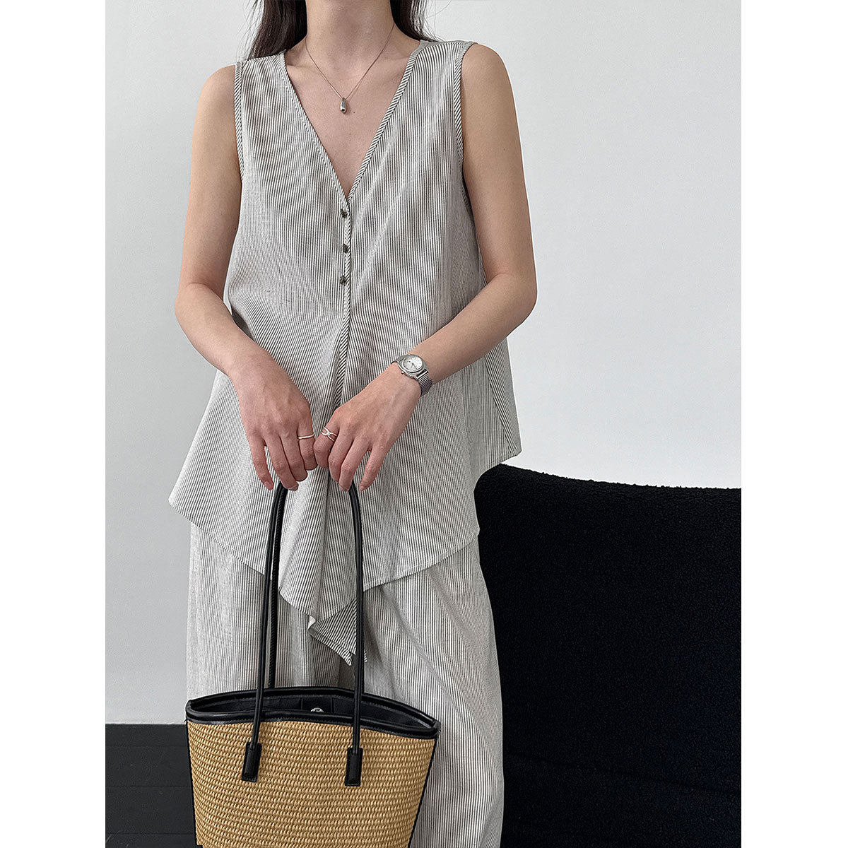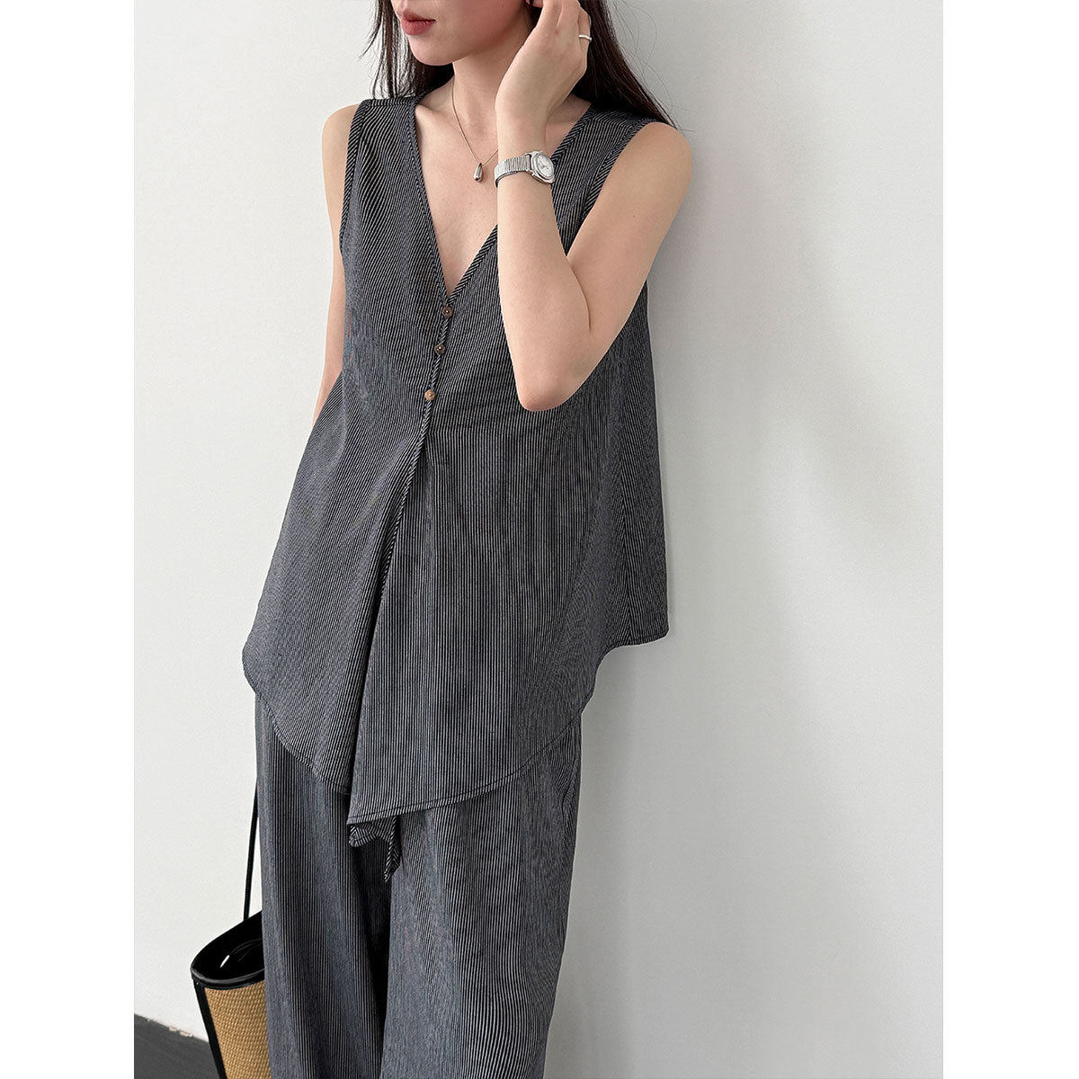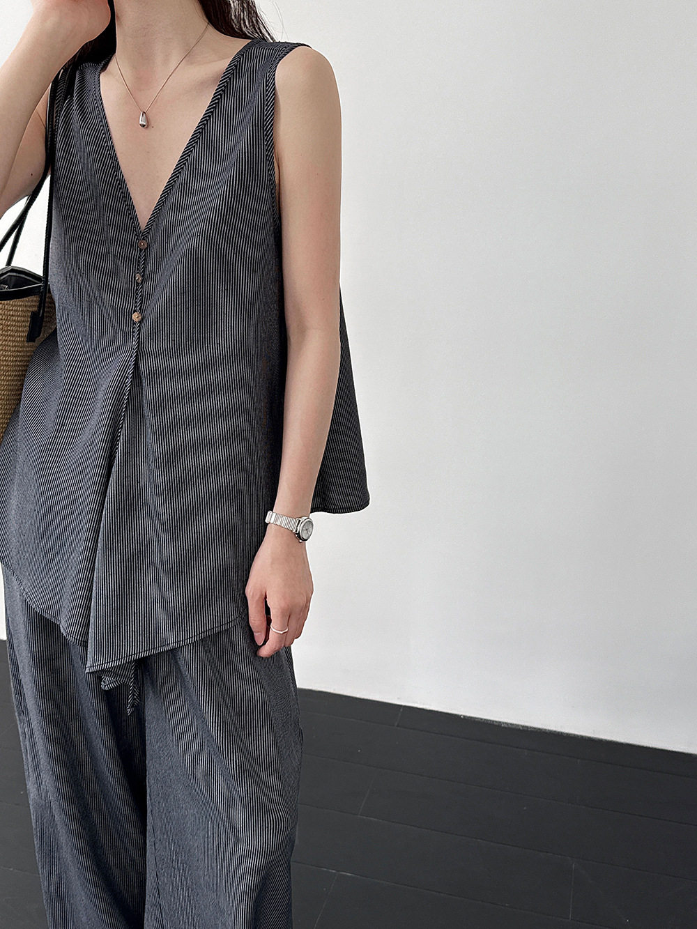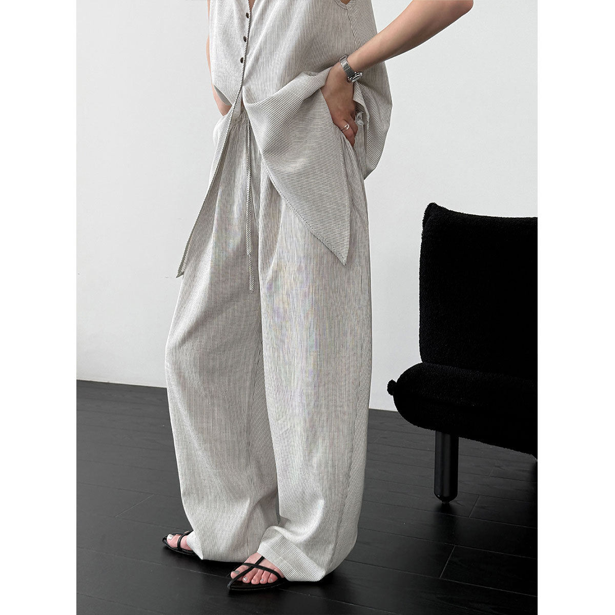 【商品名】【セットアップ】テンセル×リネン ノースリーブ ストライプトップス + カジュアルロングパンツ 2点上下セット 【JZシリーズ】