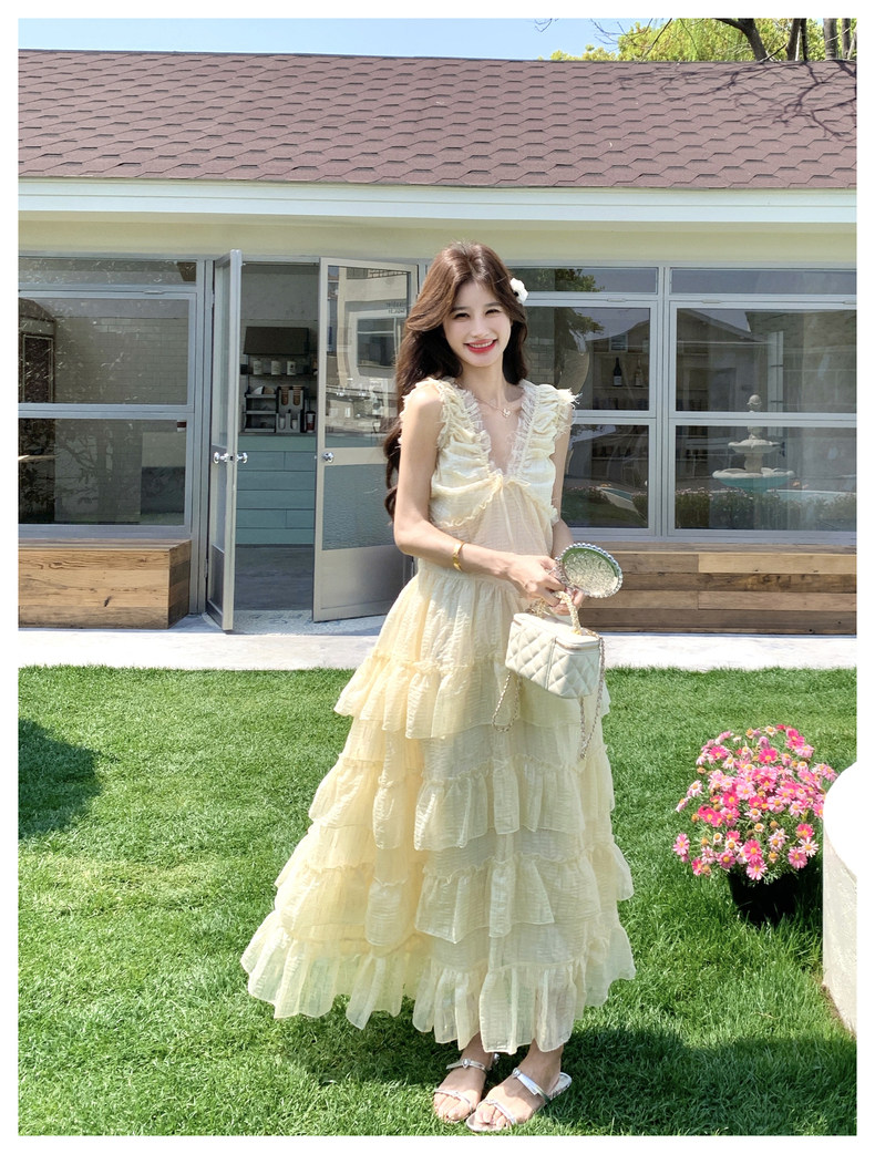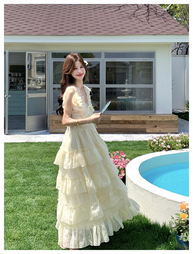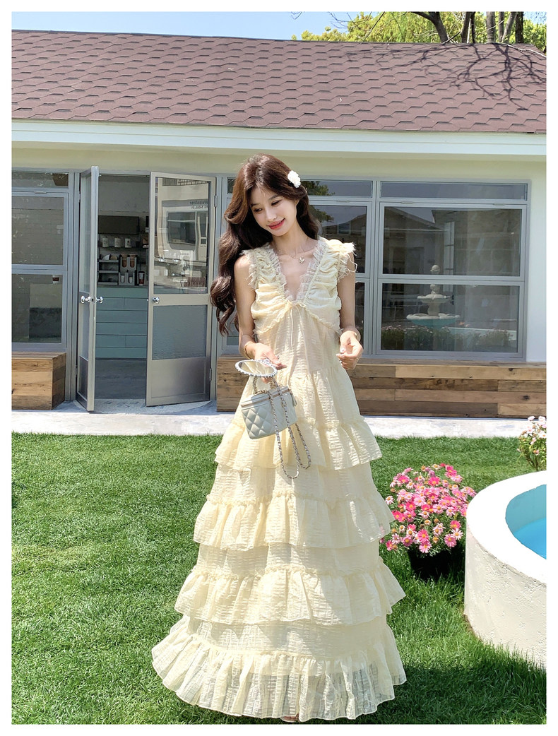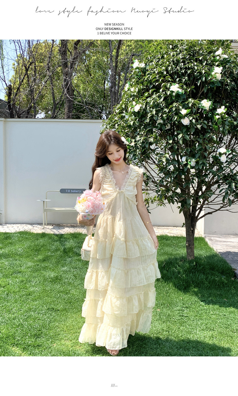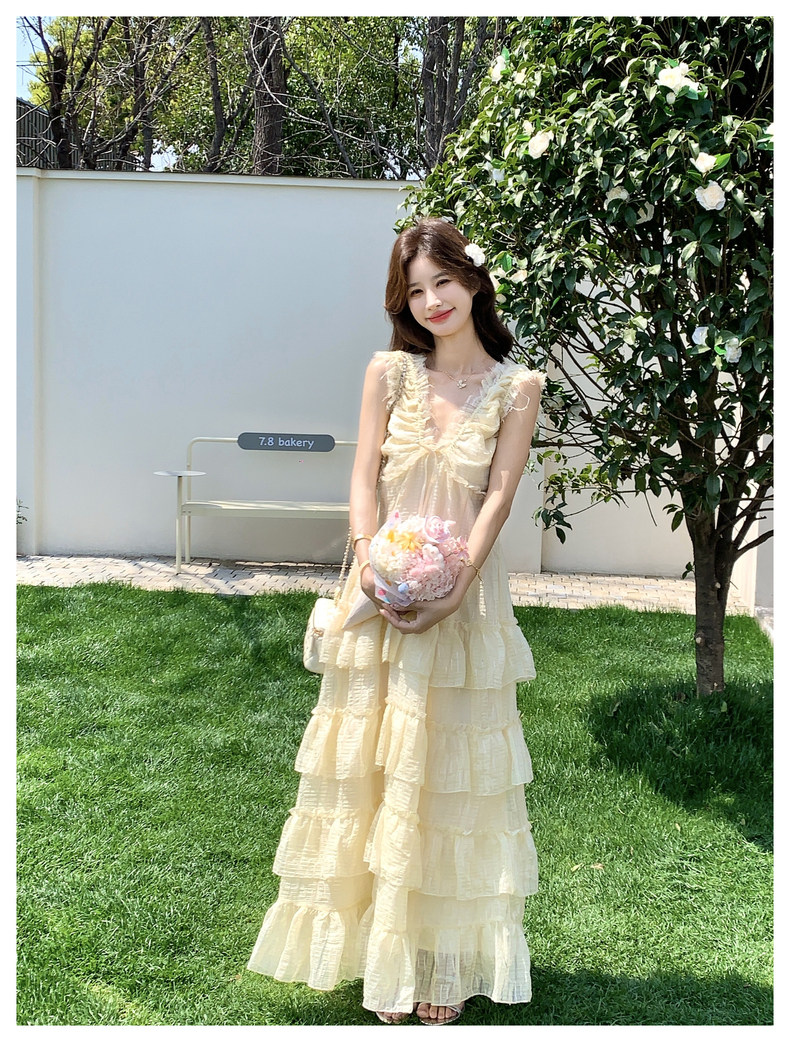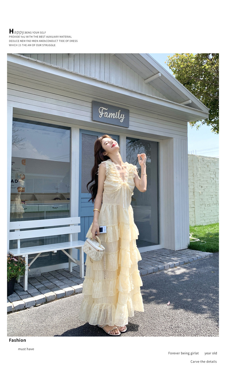 【ワンピース】夏新作 ノースリーブ ティアードワンピース ミルク系 やさしい雰囲気 若見え ロングドレス【SHシリーズ】