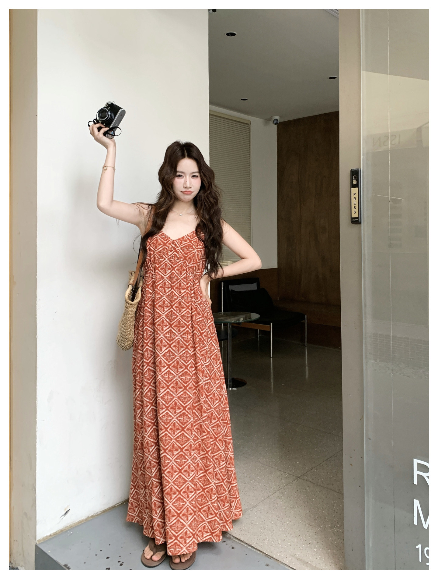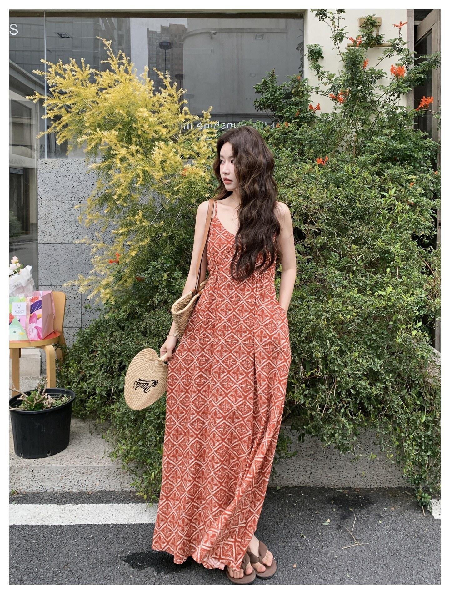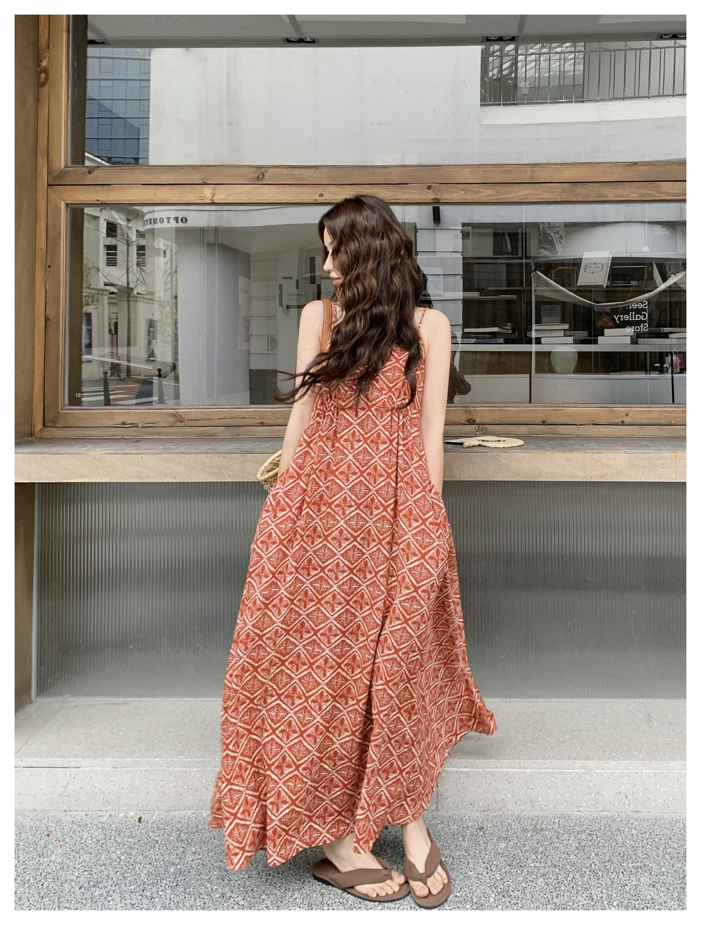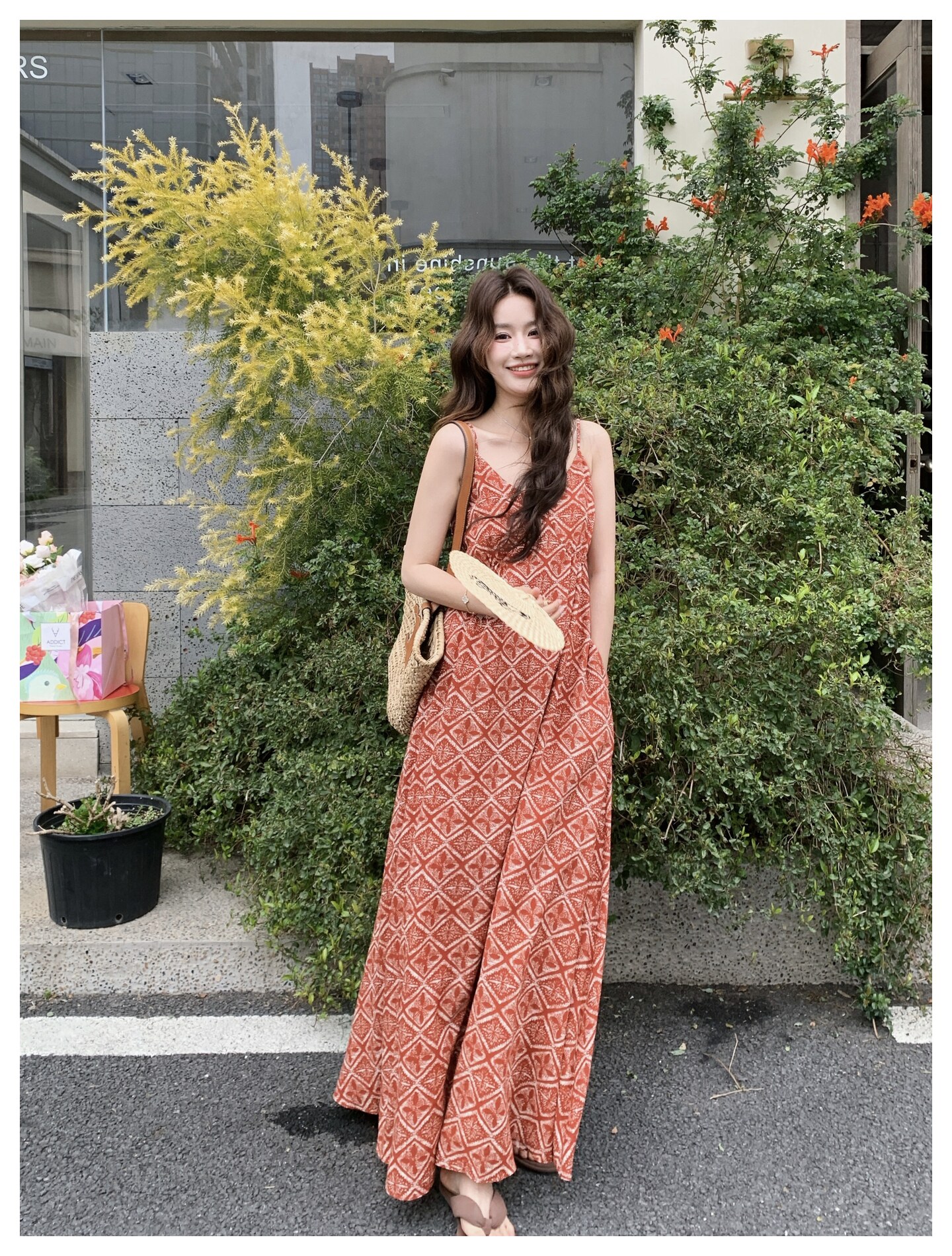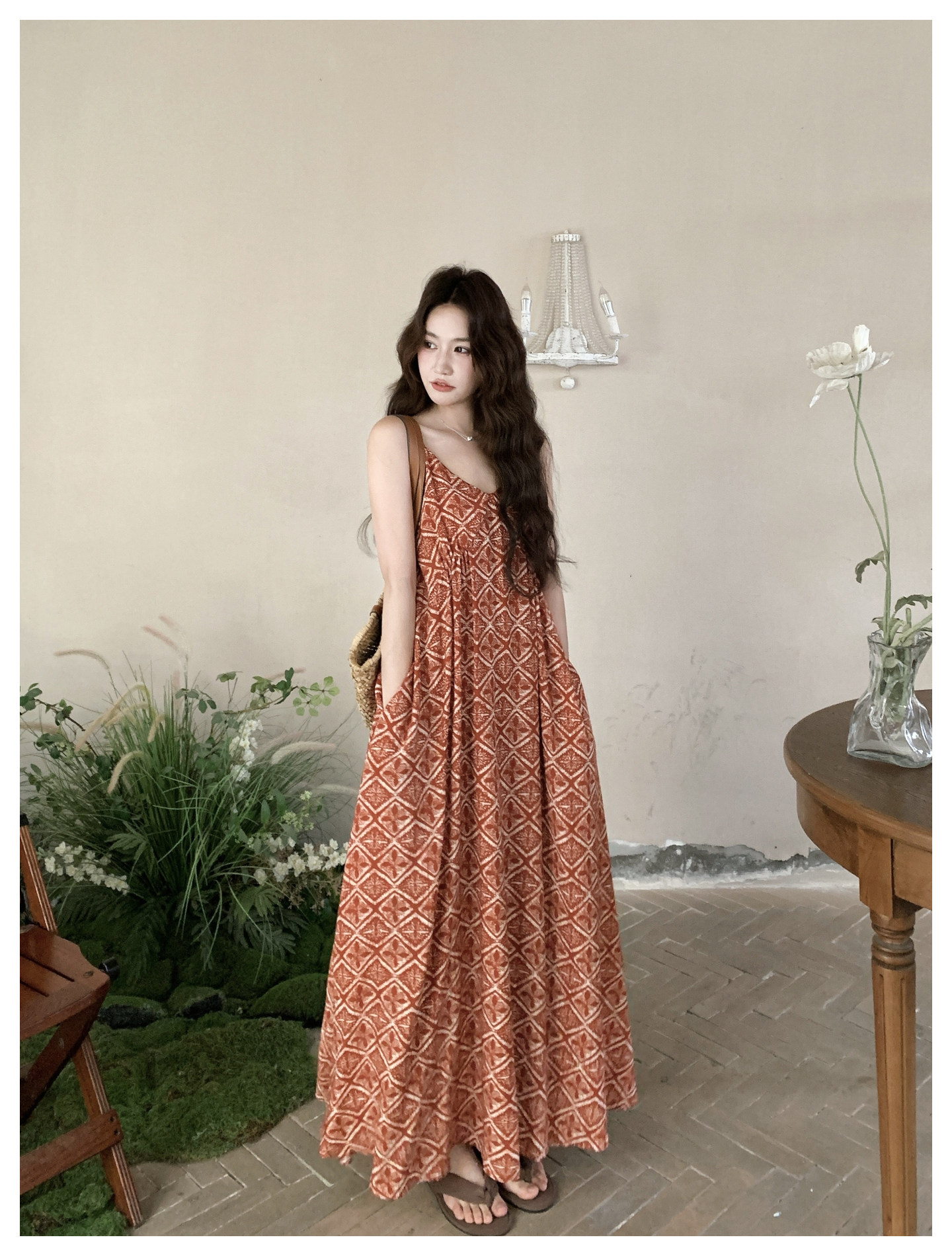 【商品名】【ワンピース】夏新作 レッド 幾何柄 キャミワンピース ボヘミアン風 海辺 旅行 リゾート 着痩せ リラックス ロング丈【SHシリーズ】