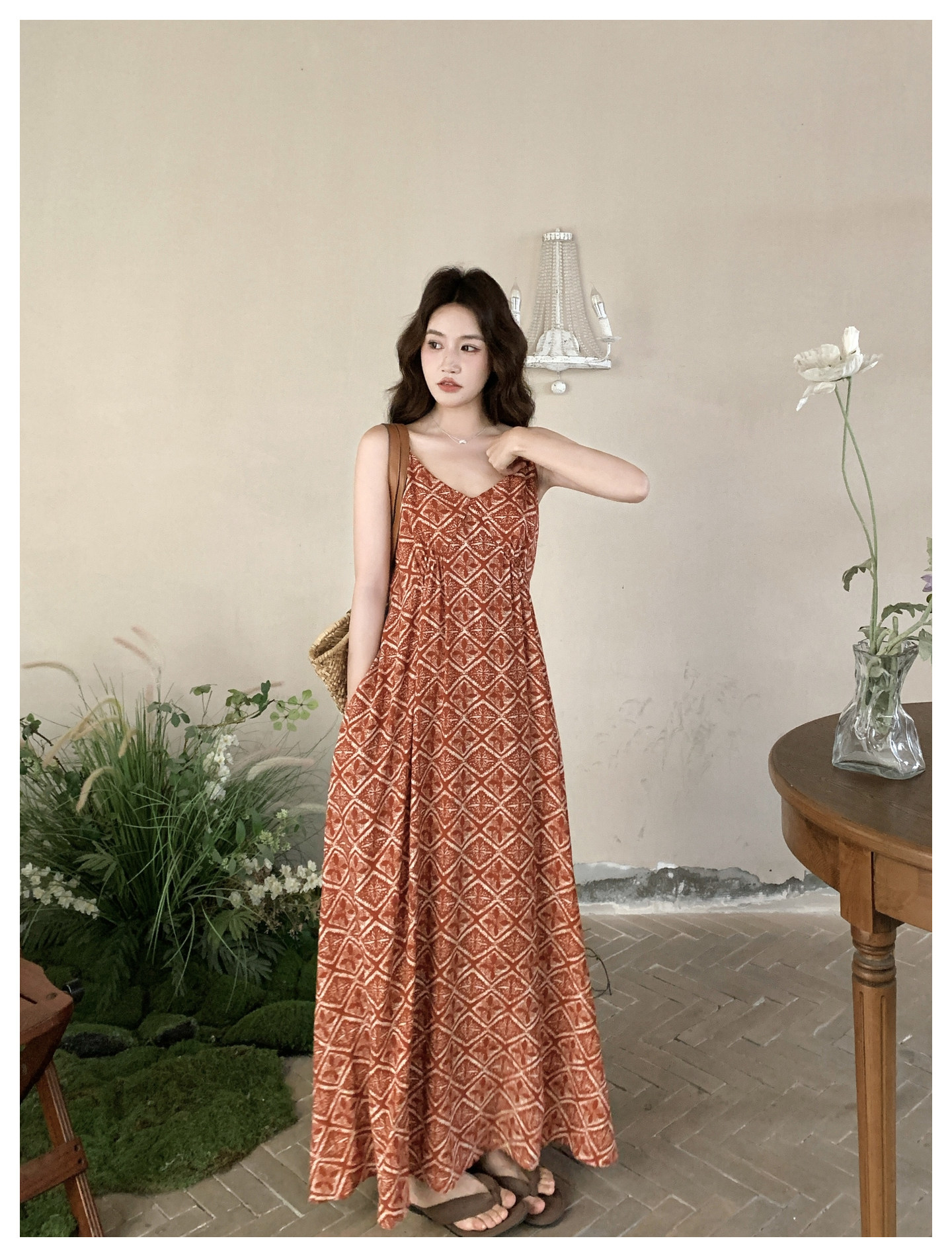 【ワンピース】夏新作 レッド 幾何柄 キャミワンピース ボヘミアン風 海辺 旅行 リゾート 着痩せ リラックス ロング丈【SHシリーズ】
