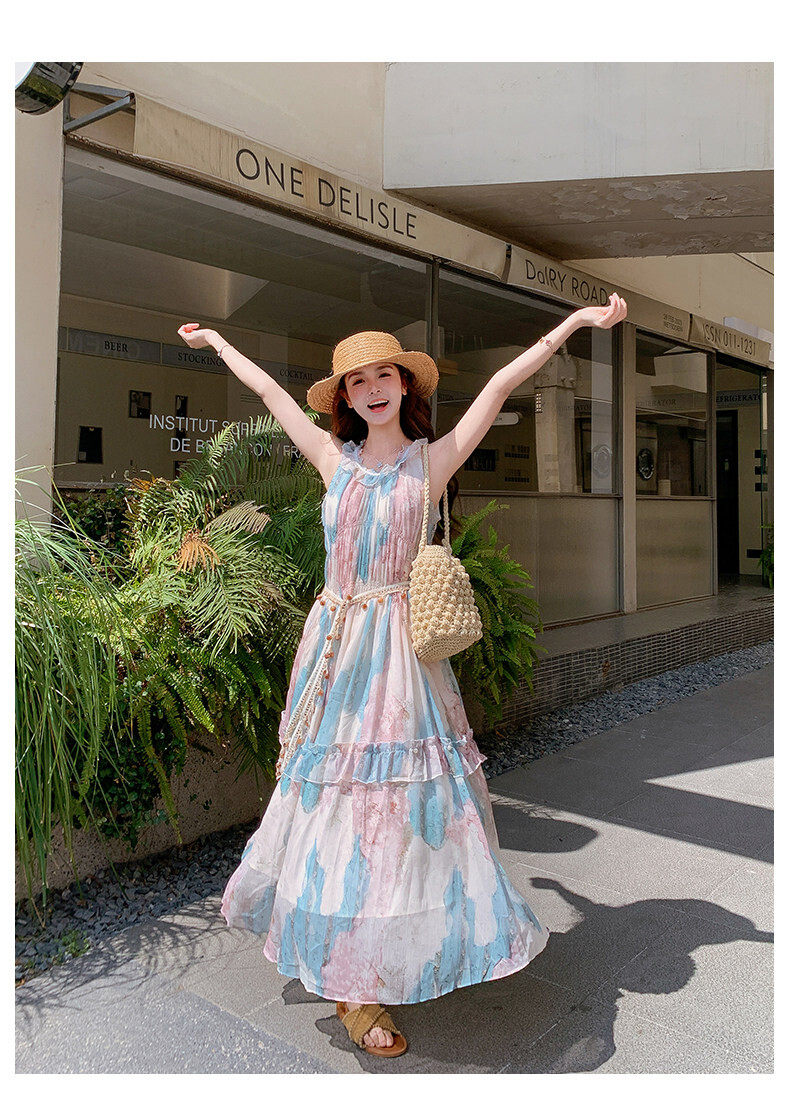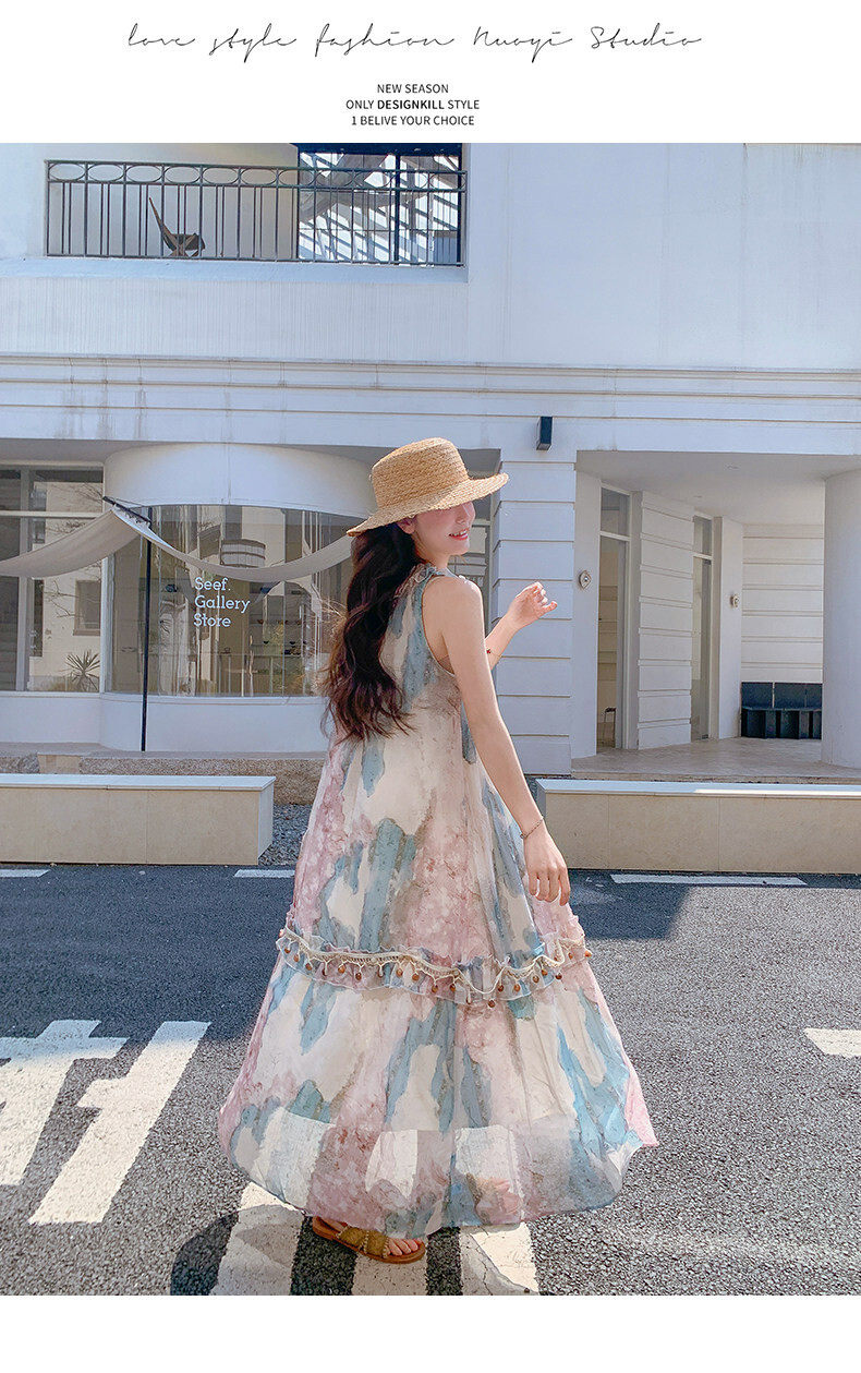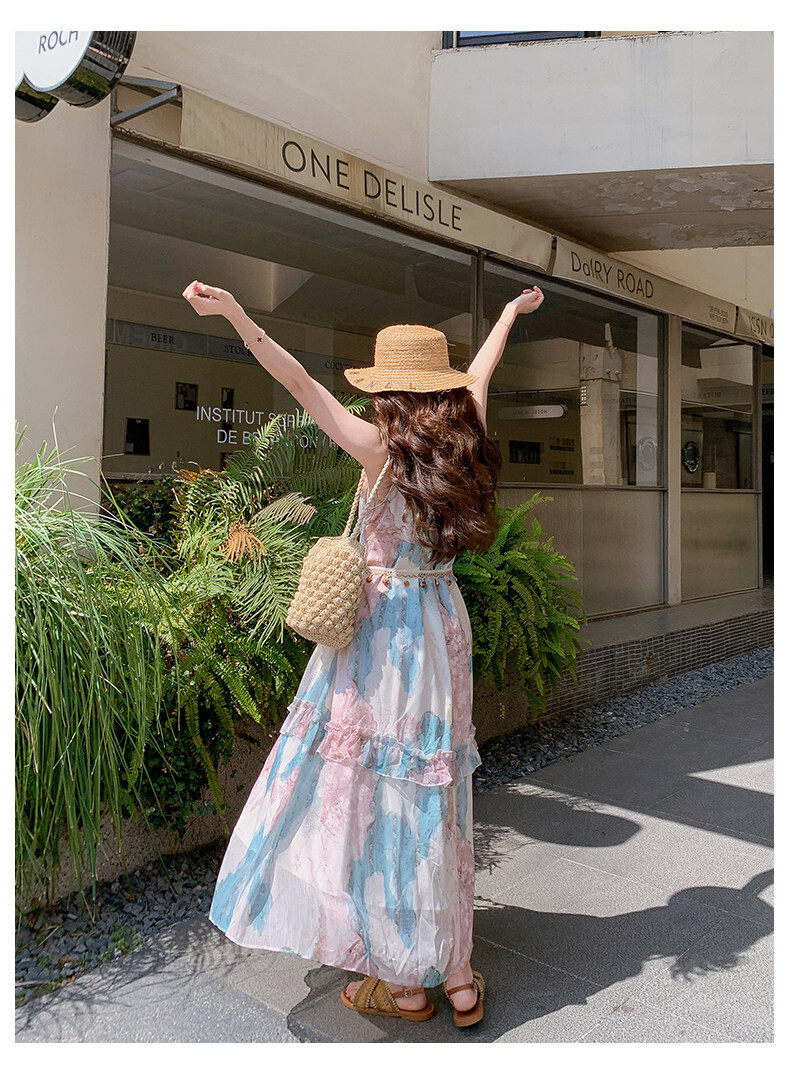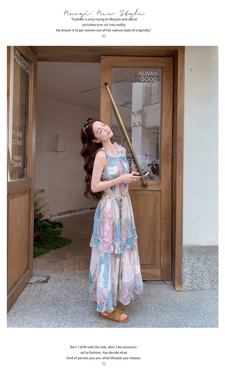 【ワンピース】花柄 ホルターネック ロング丈 ノースリーブワンピース 細見え 体型カバー 上品 リゾート 海外旅行 ビーチコーデ【SHシリーズ】