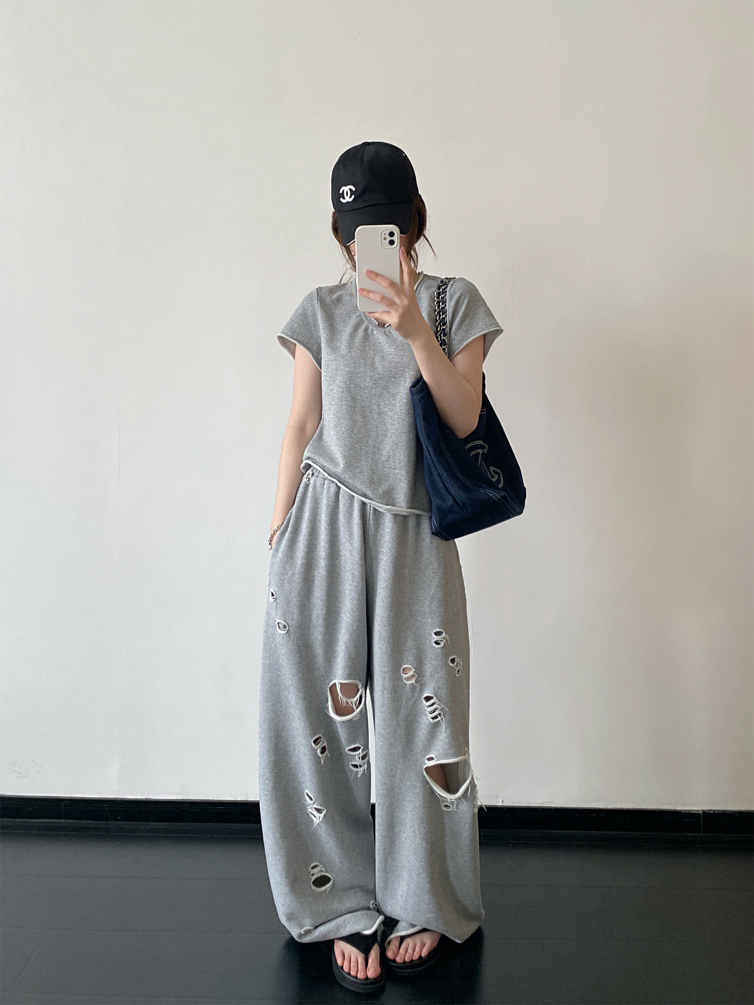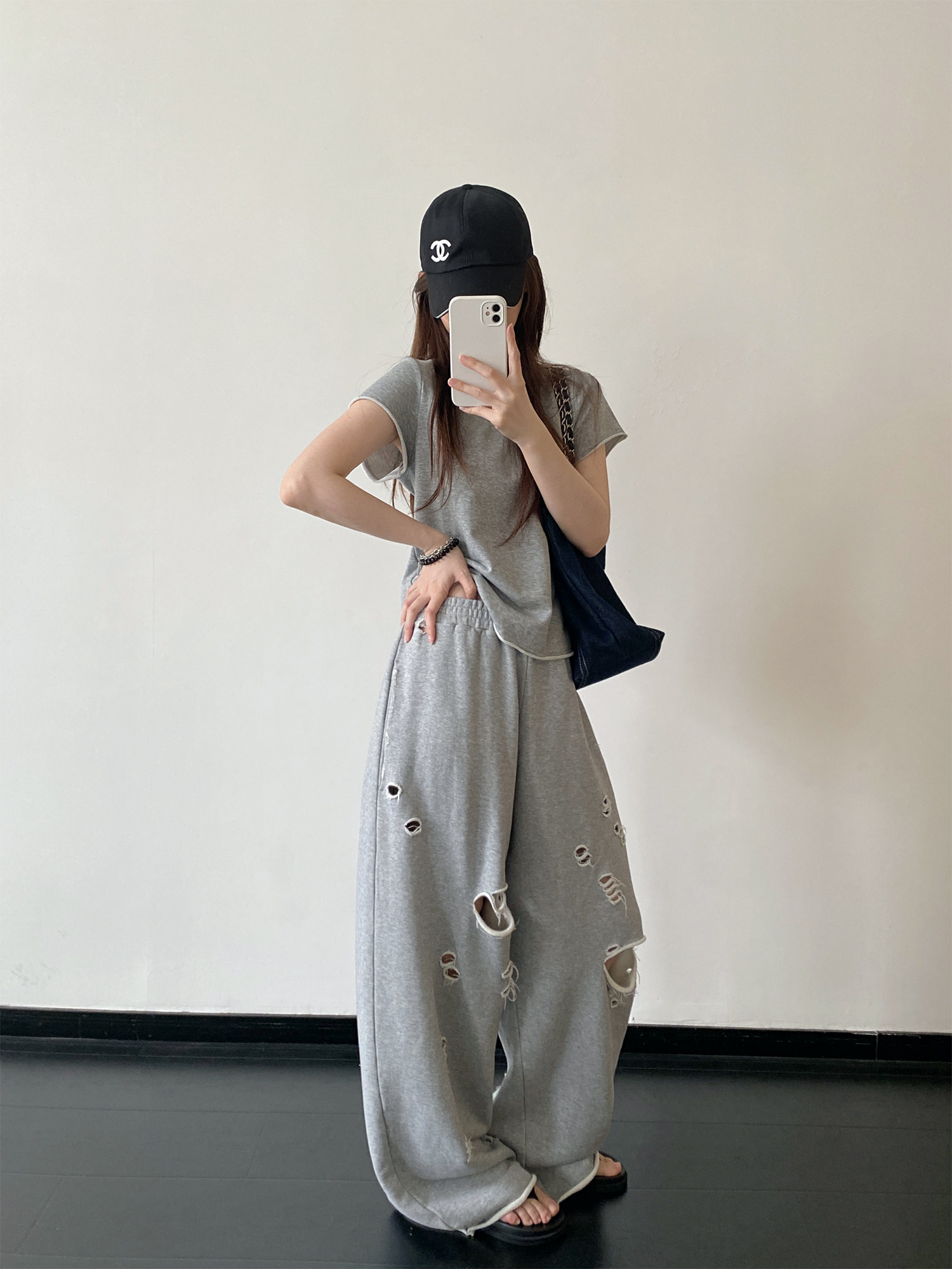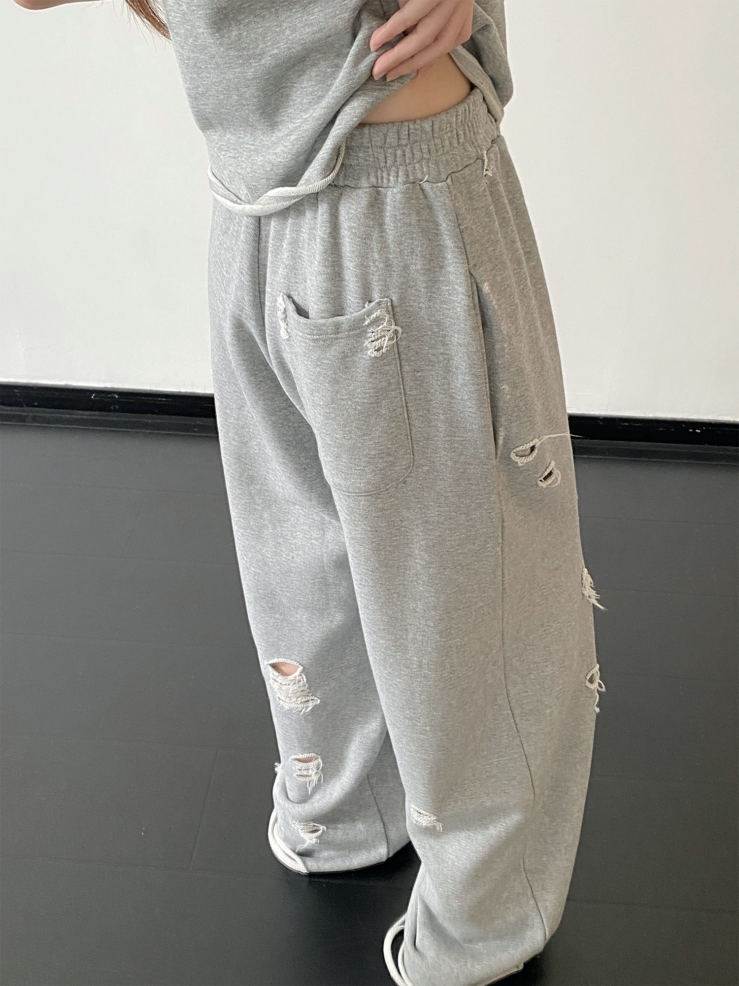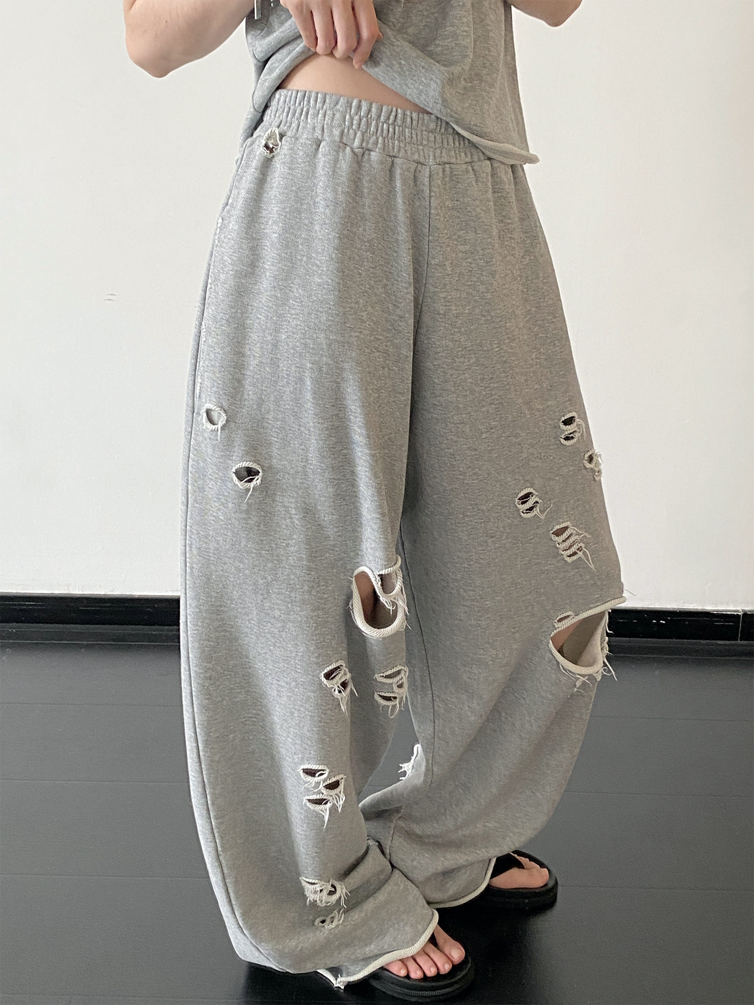 【セットアップ】【単品注文】春夏 半袖Tシャツ+ワイドパンツ 上下セット グレー ルーズフィット ダメージ風 カジュアル スポーツミックス リラックスコーデ【FCシリーズ】