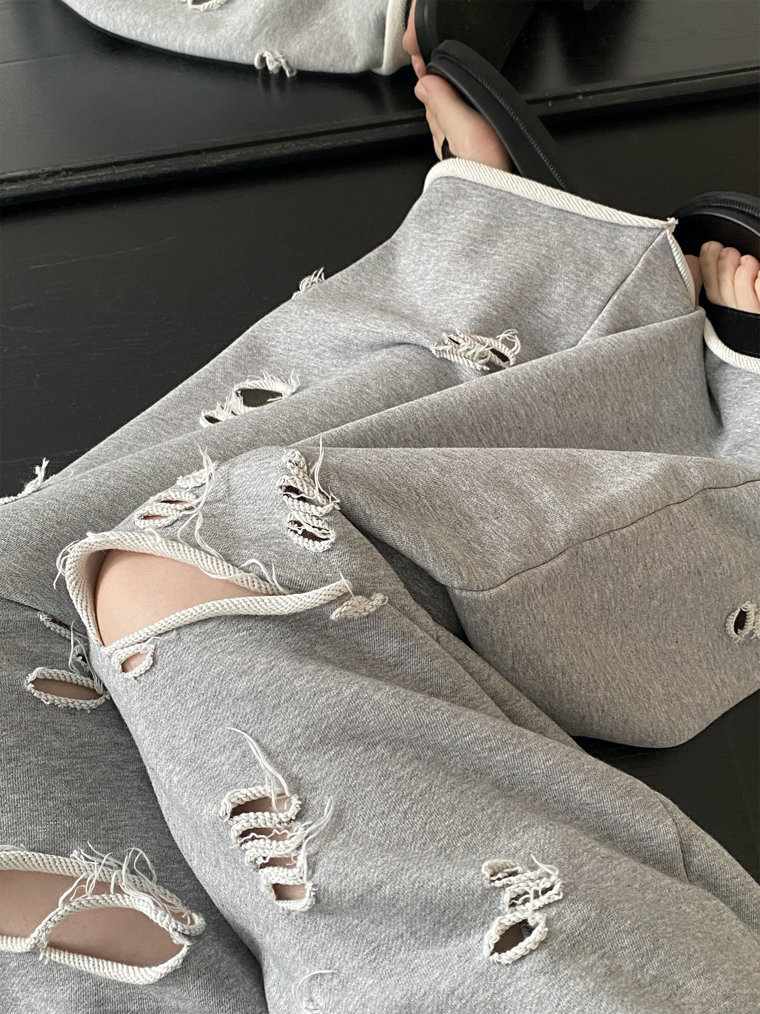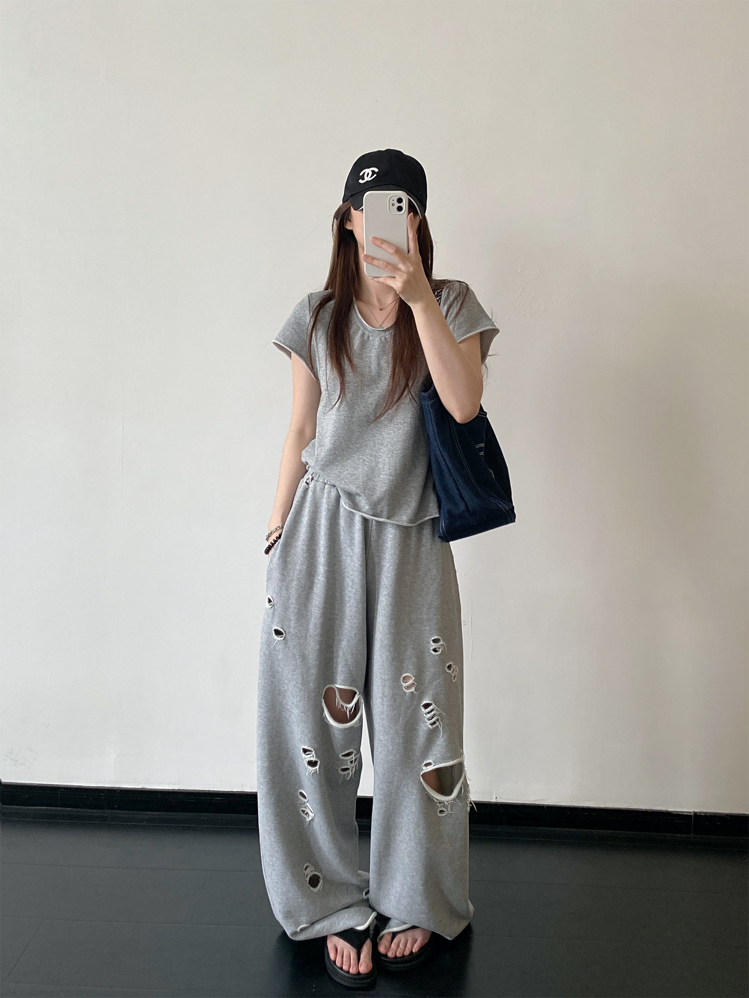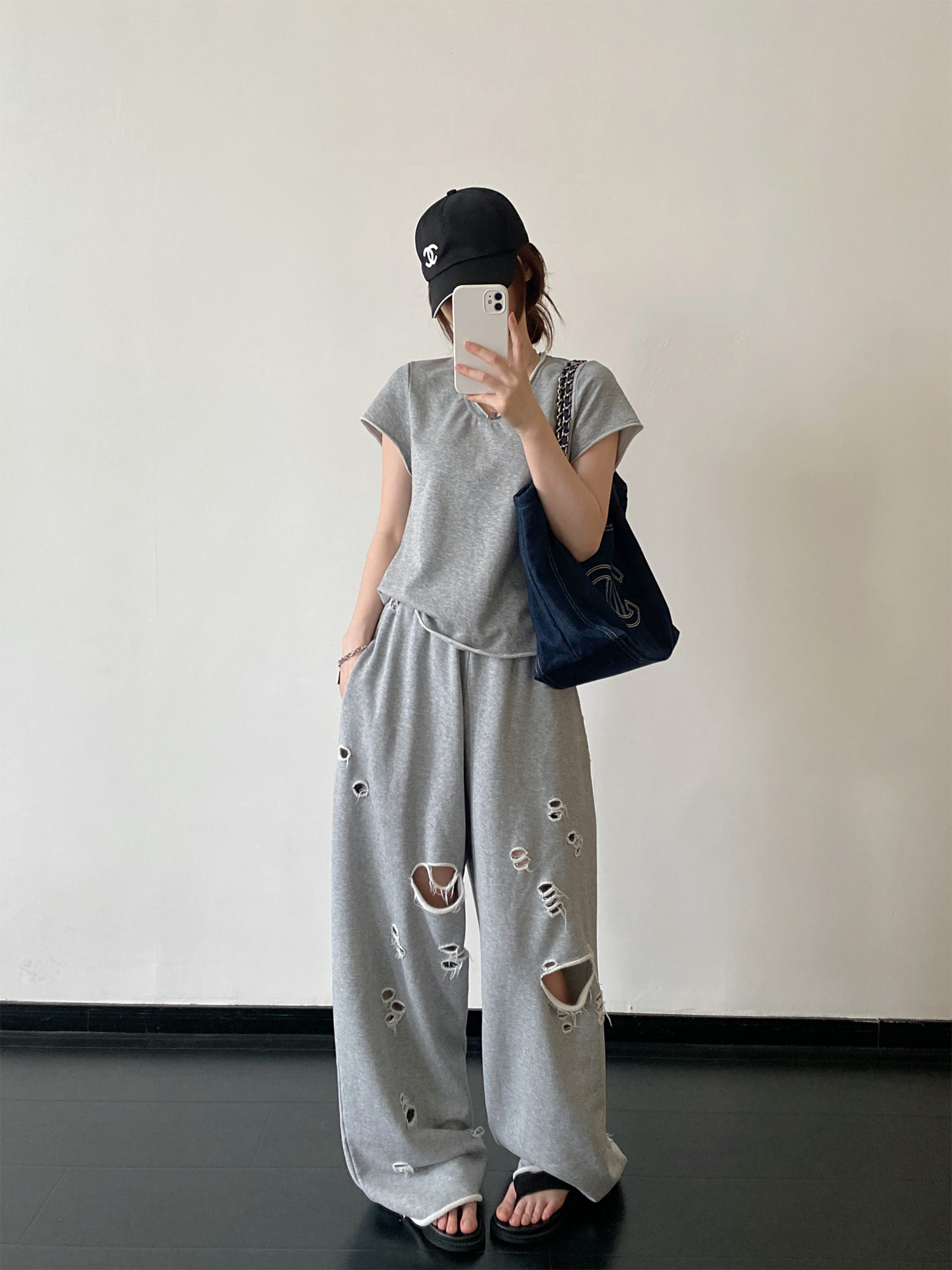 【セットアップ】【単品注文】春夏 半袖Tシャツ+ワイドパンツ 上下セット グレー ルーズフィット ダメージ風 カジュアル スポーツミックス リラックスコーデ【FCシリーズ】