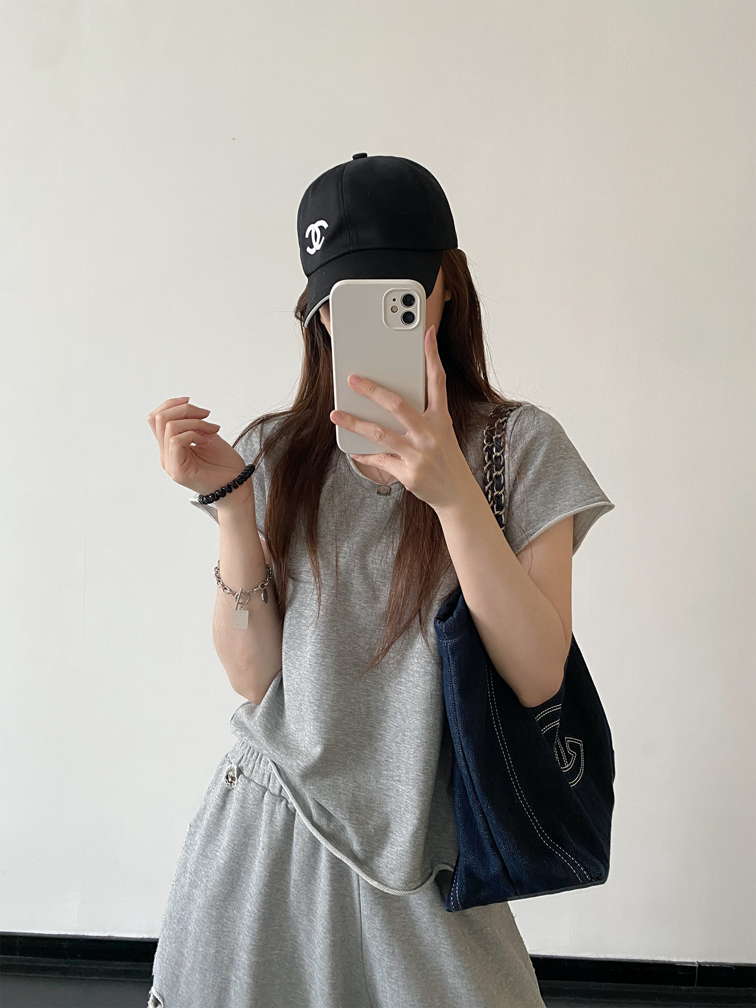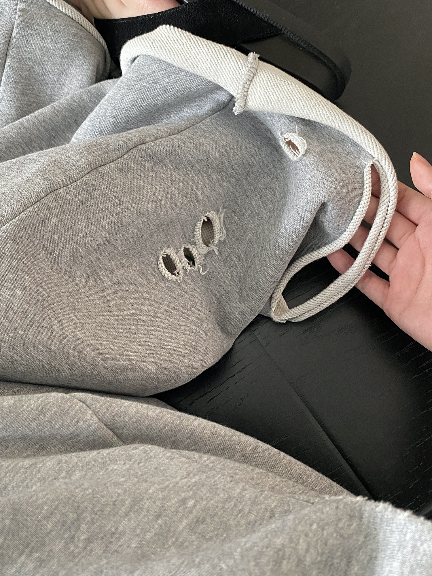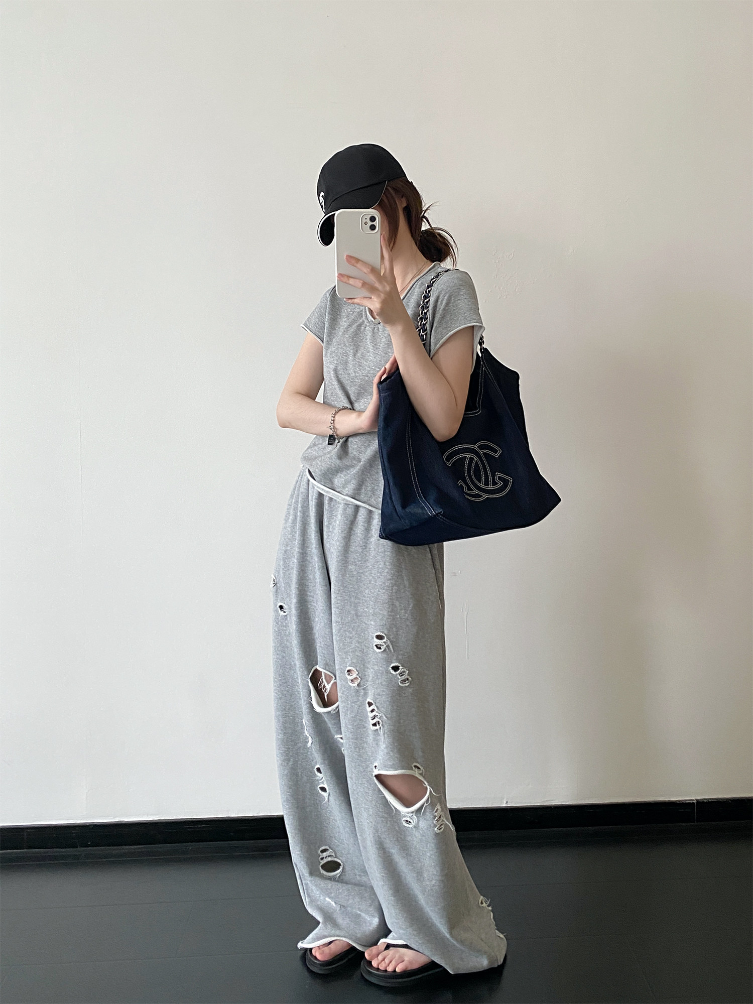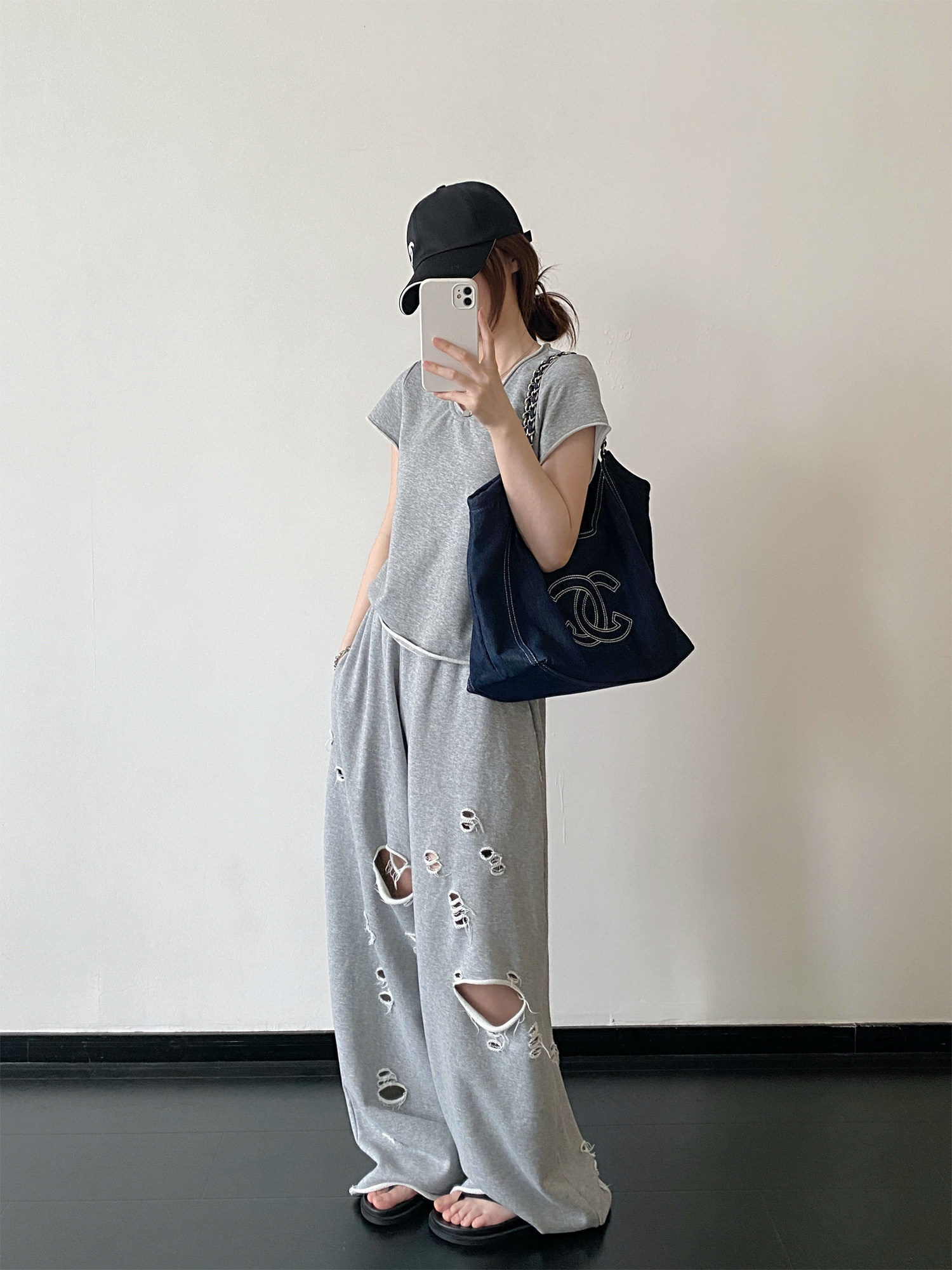 【セットアップ】【単品注文】春夏 半袖Tシャツ+ワイドパンツ 上下セット グレー ルーズフィット ダメージ風 カジュアル スポーツミックス リラックスコーデ【FCシリーズ】