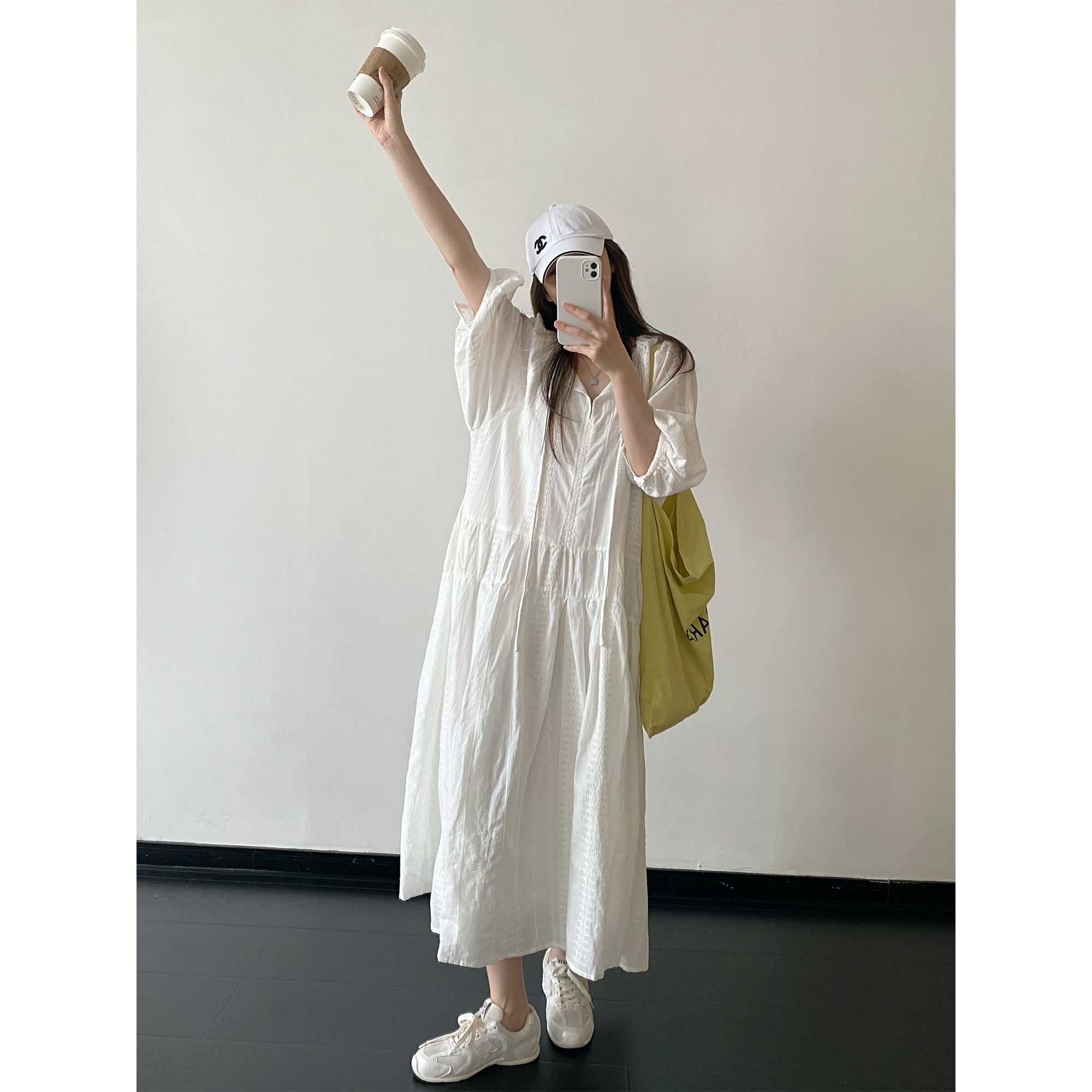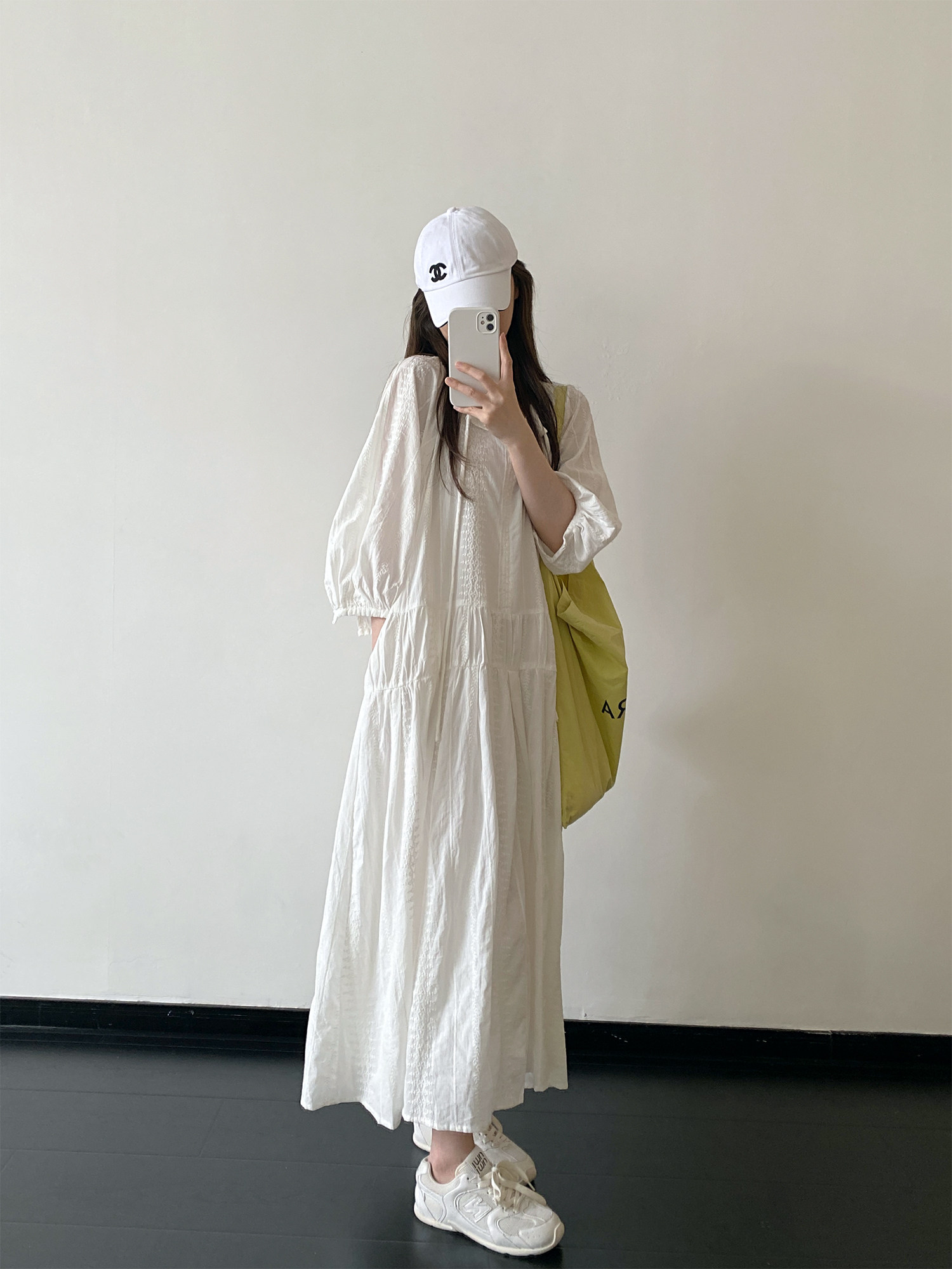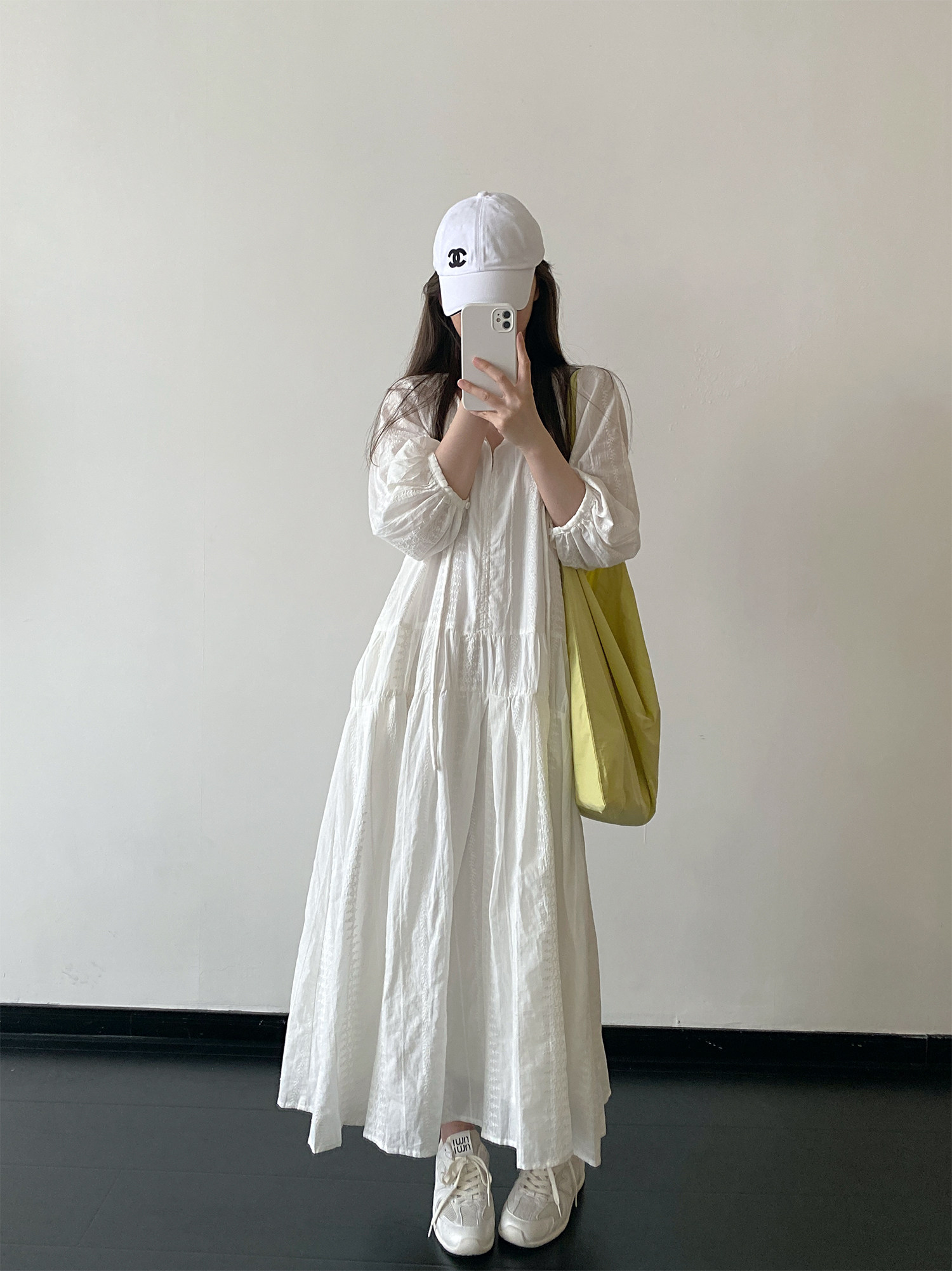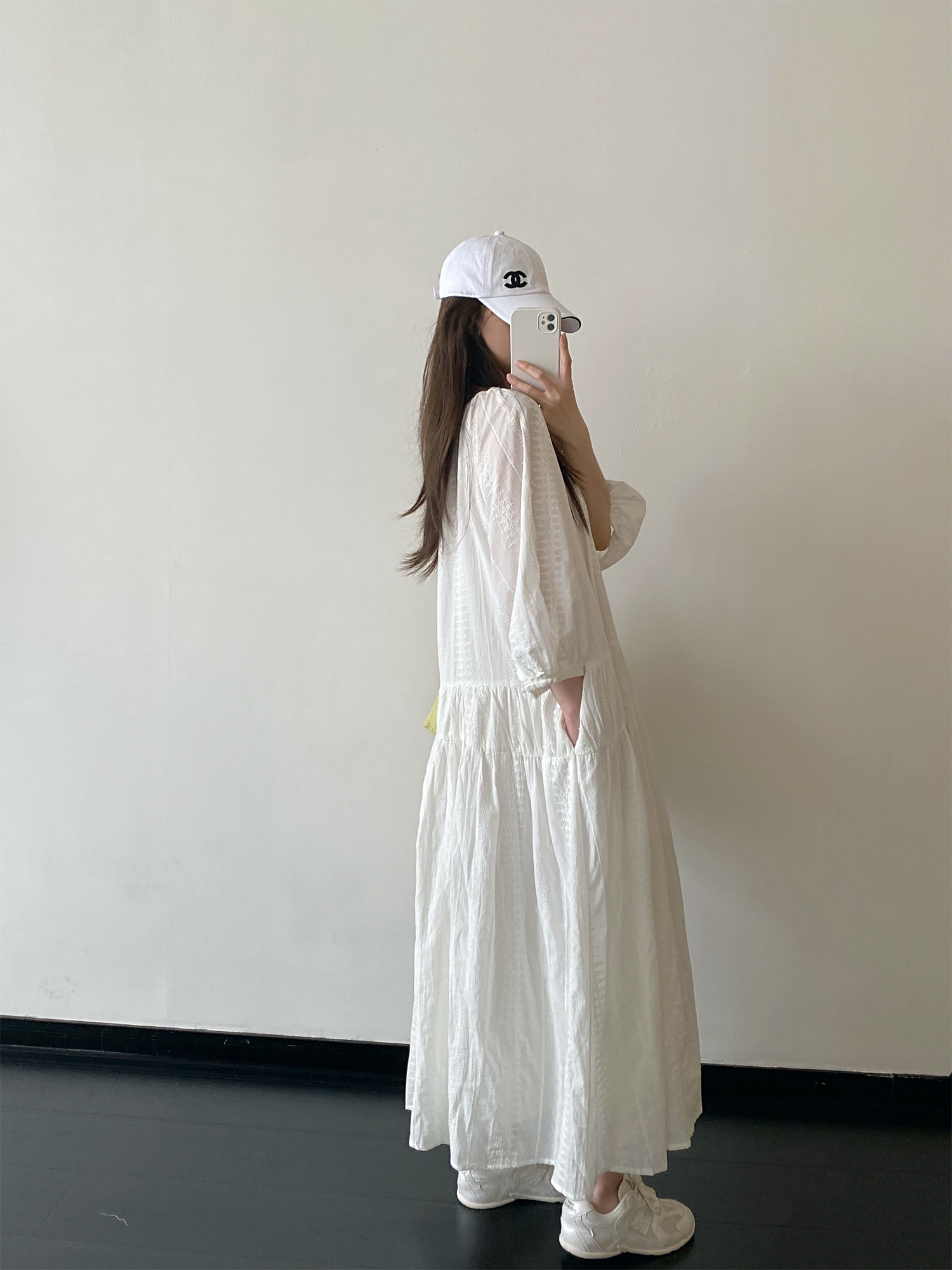 【商品名】【ワンピース】レディース ホワイト 長袖 ワンピース フレンチリゾート レースアップ デザイン ロングワンピース テクスチャー素材 上品 きれいめ 夏【FCシリーズ】