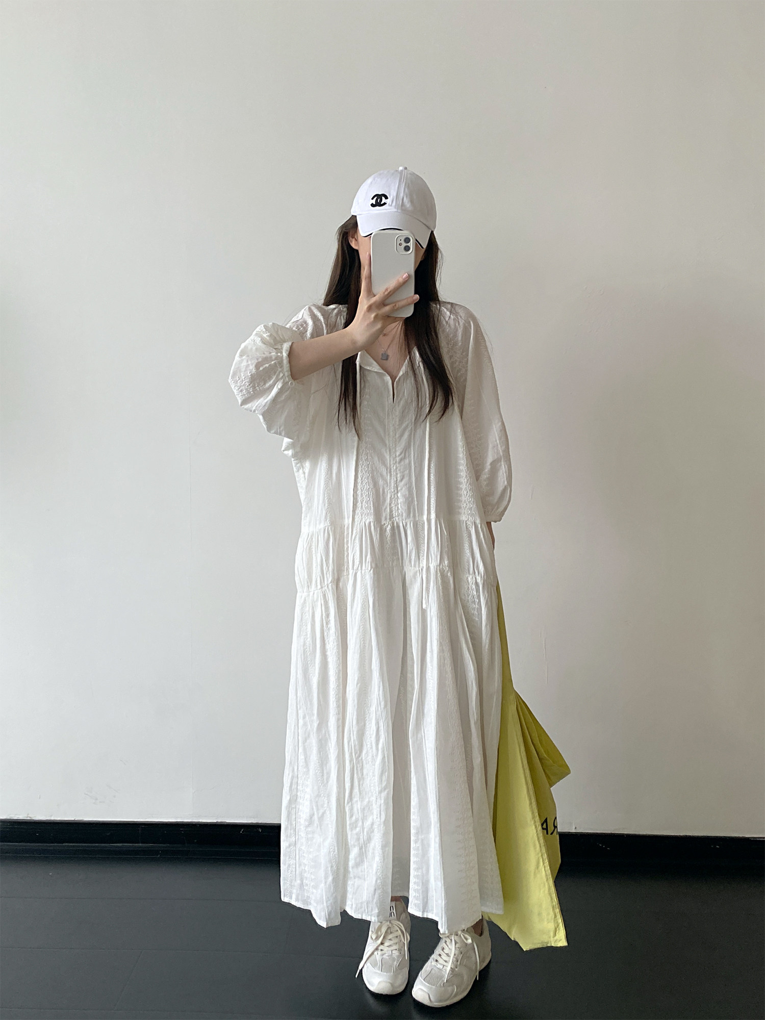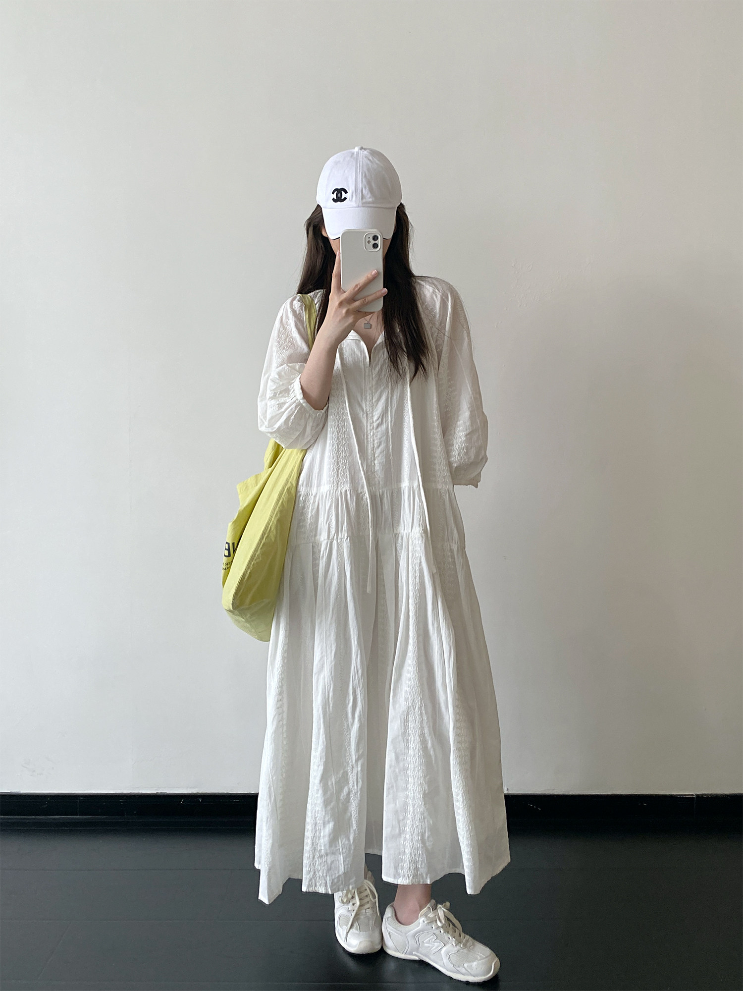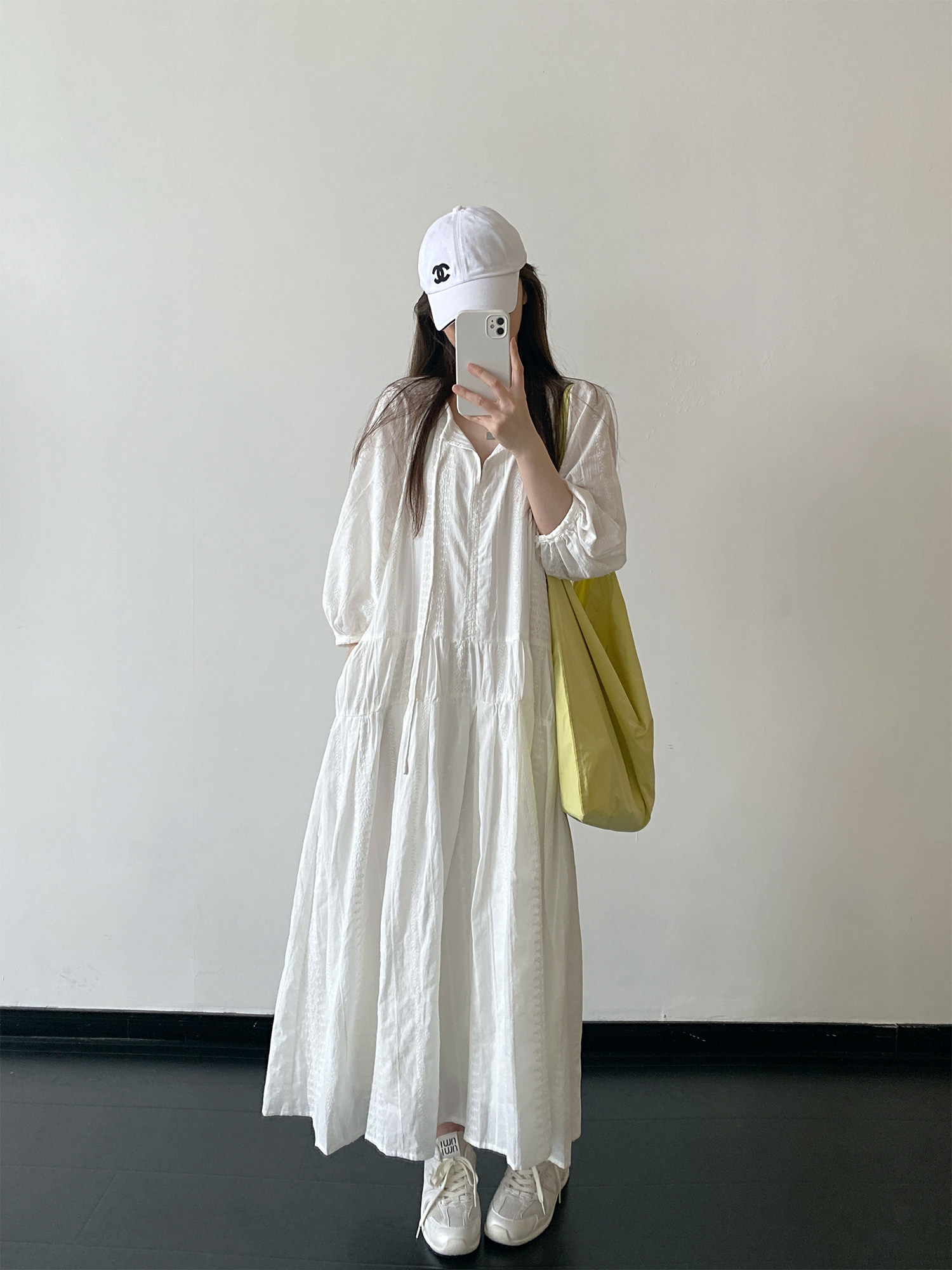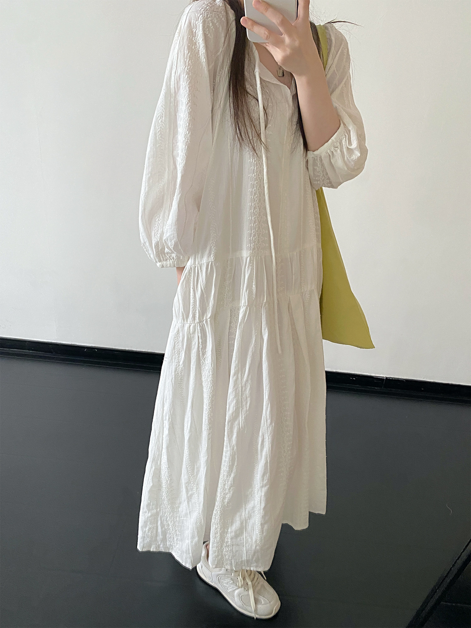 【ワンピース】レディース ホワイト 長袖 ワンピース フレンチリゾート レースアップ デザイン ロングワンピース テクスチャー素材 上品 きれいめ 夏【FCシリーズ】