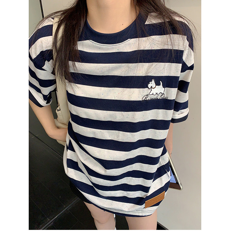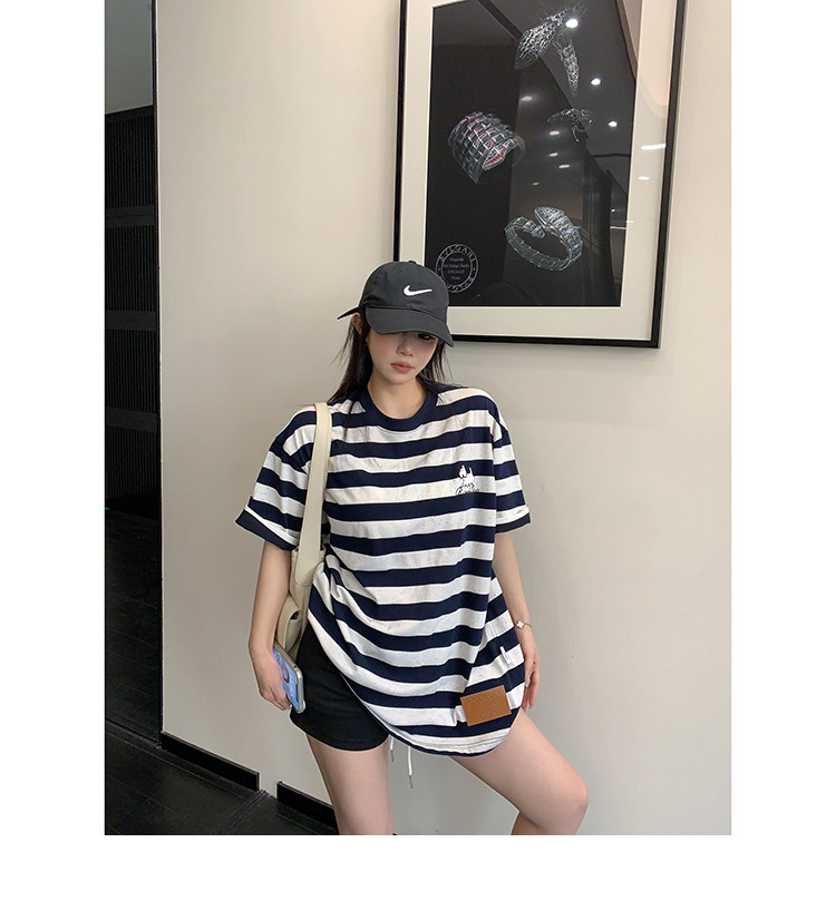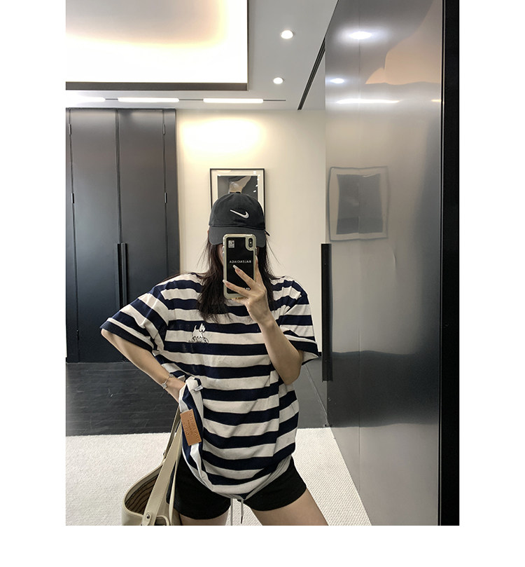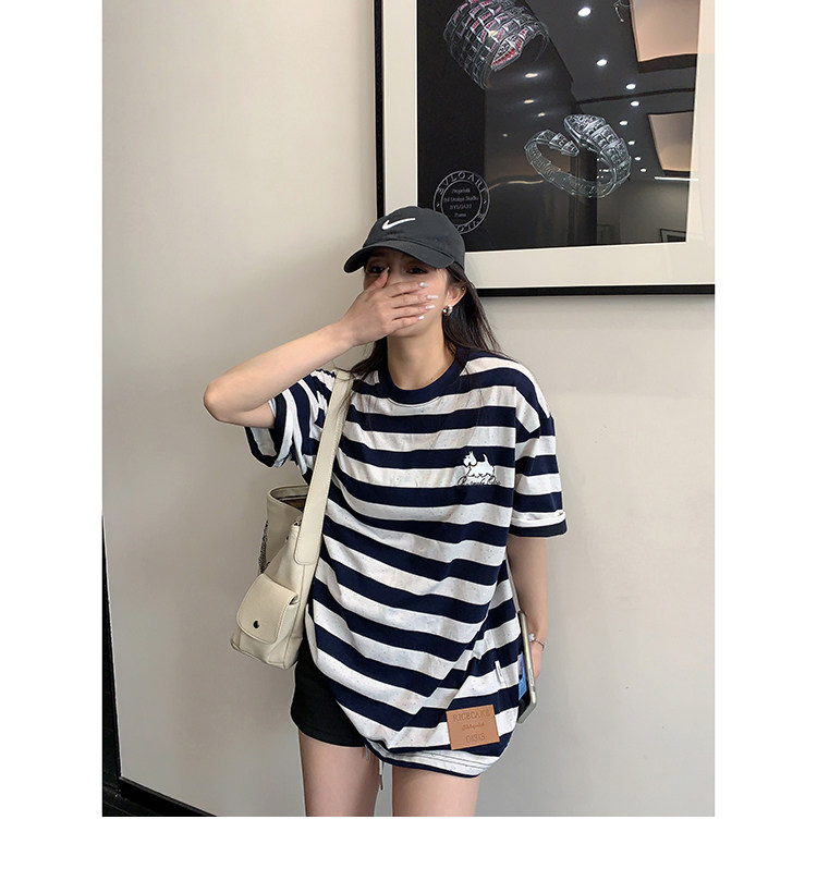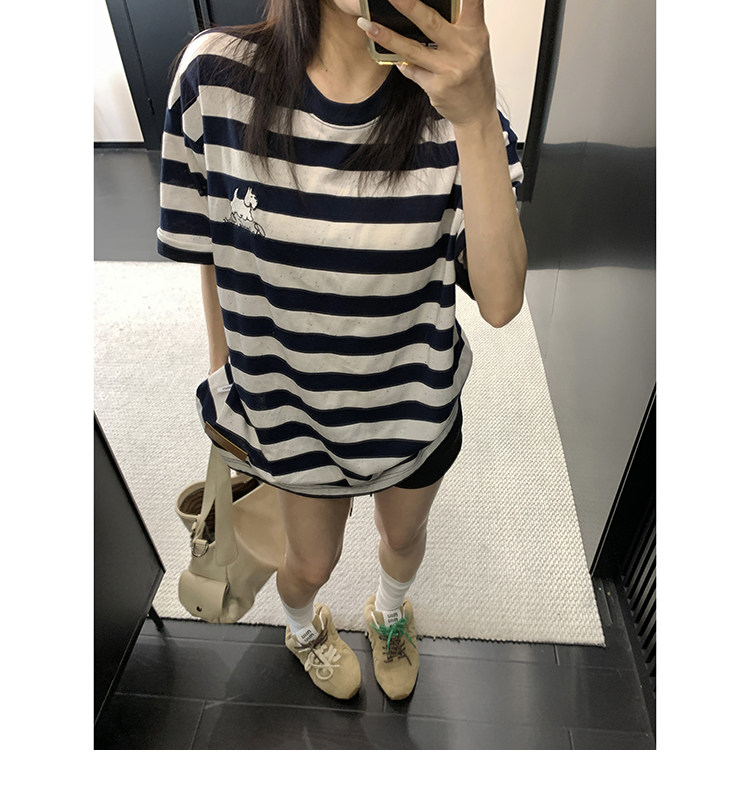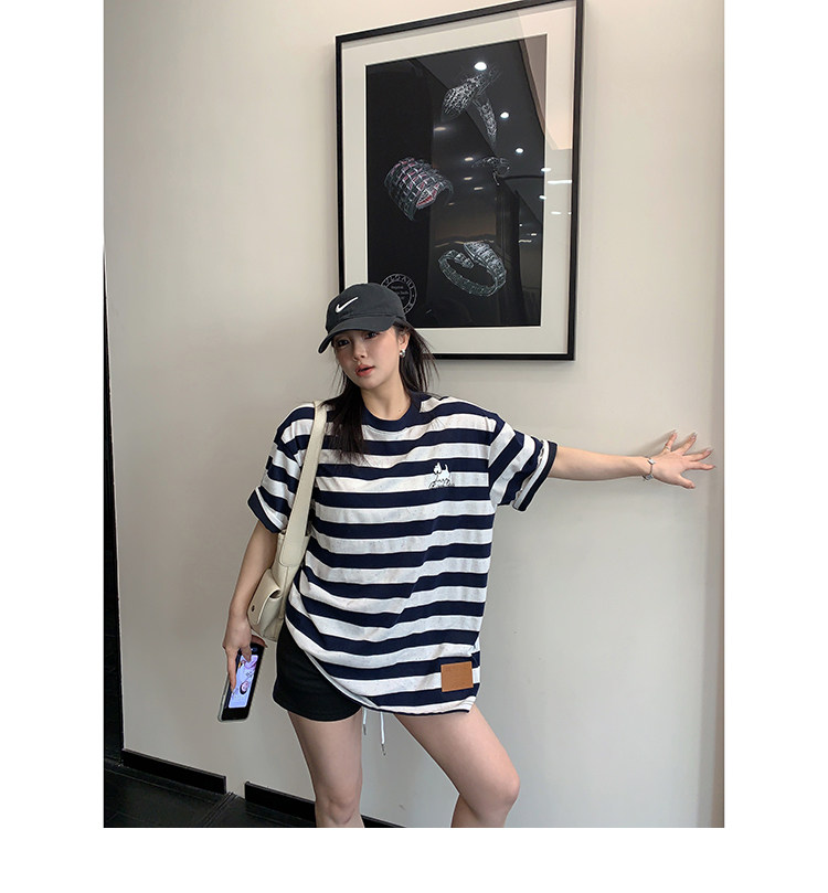 【トップス】ストライプ Tシャツ レディース 夏 半袖 カートゥーン ゆったり オーバーサイズ クルーネック 人気 リラックスコーデ【FCシリーズ】
