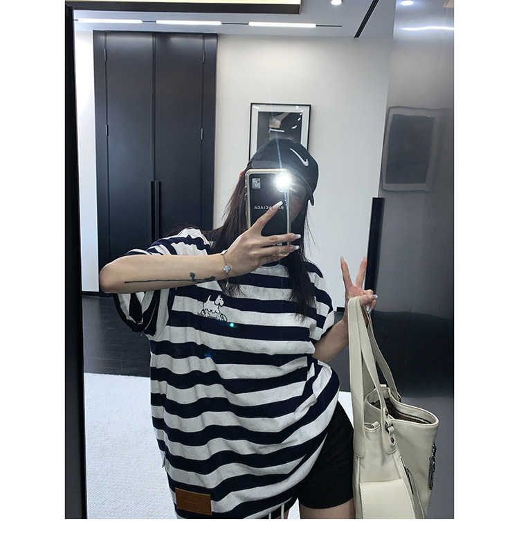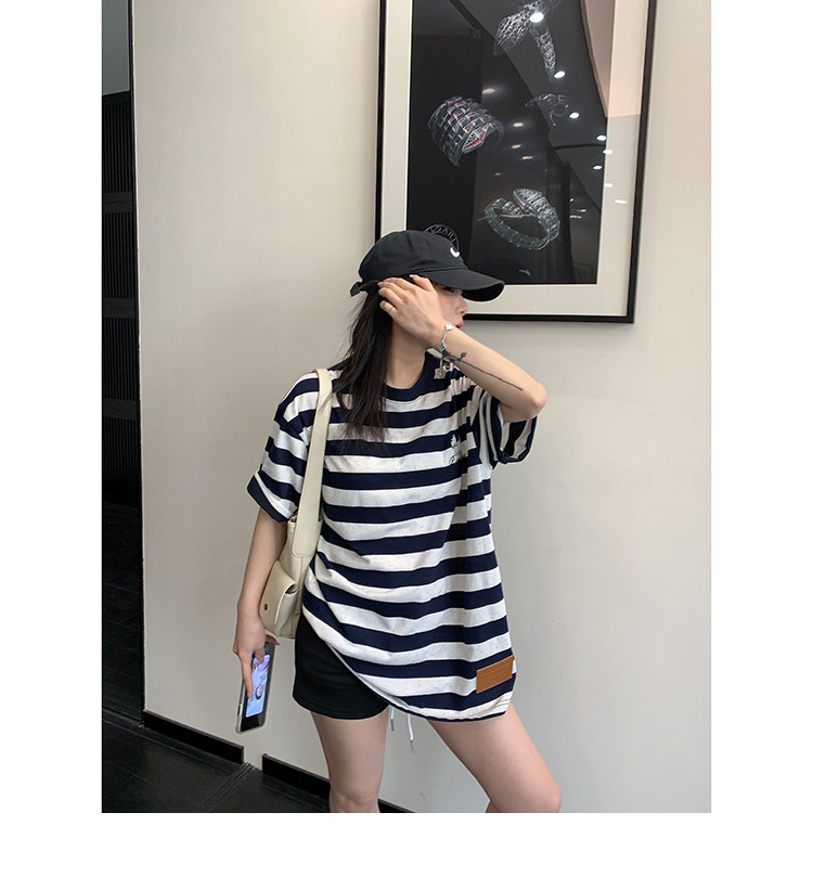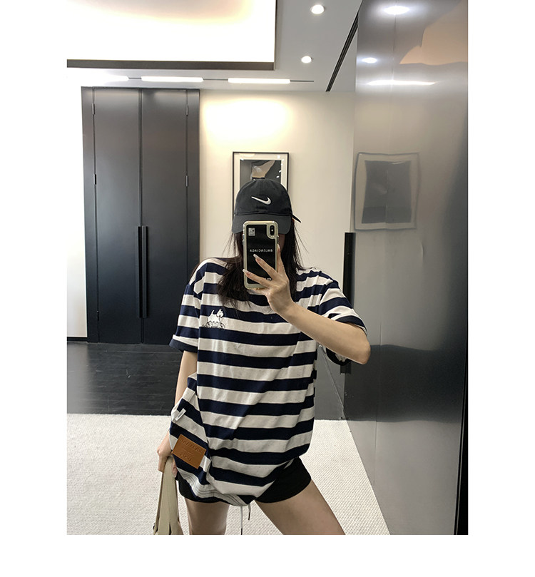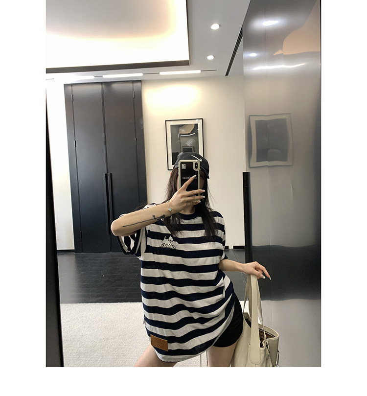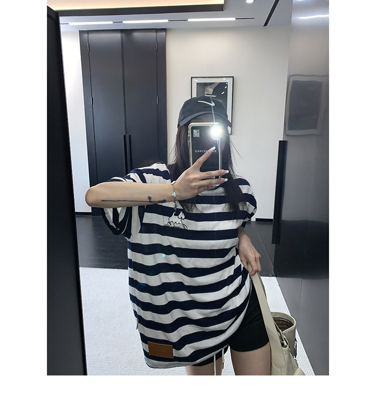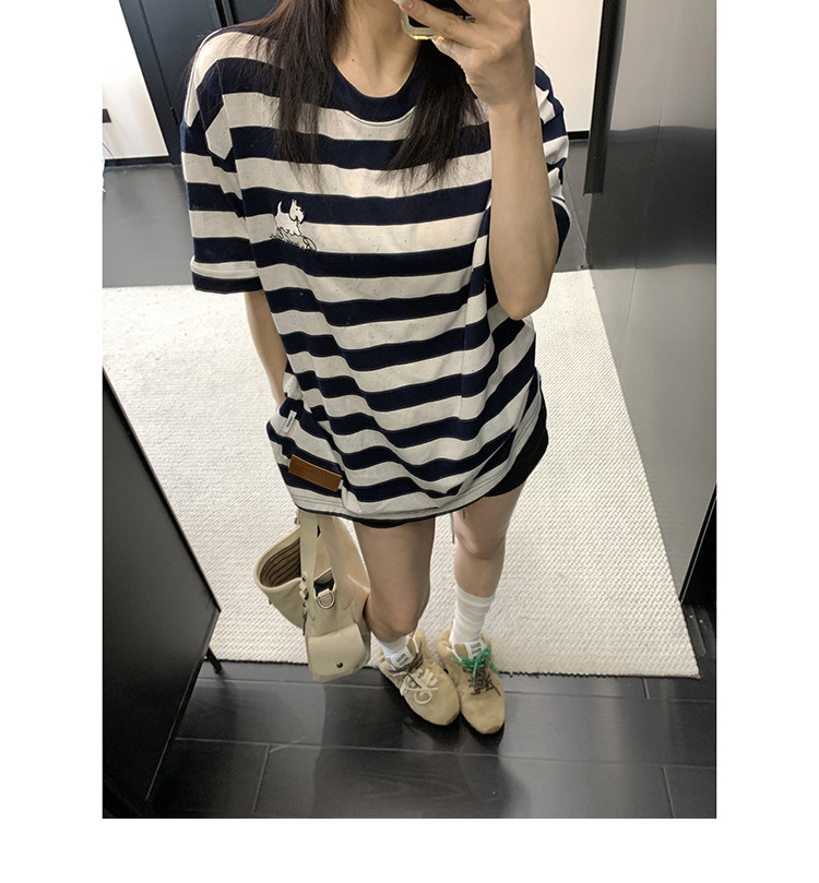 【トップス】ストライプ Tシャツ レディース 夏 半袖 カートゥーン ゆったり オーバーサイズ クルーネック 人気 リラックスコーデ【FCシリーズ】