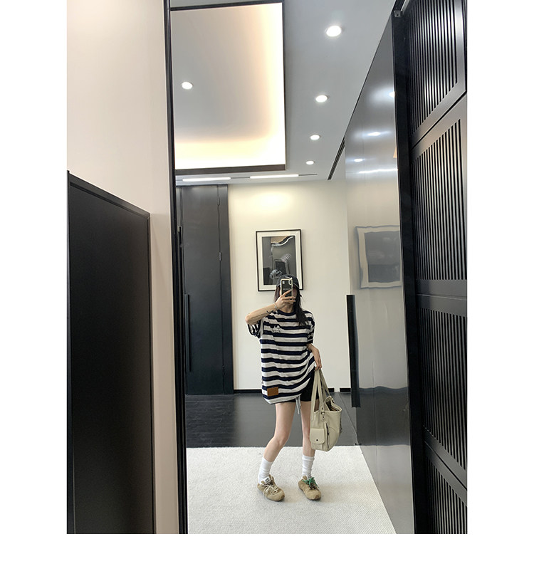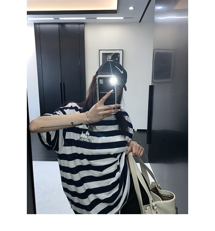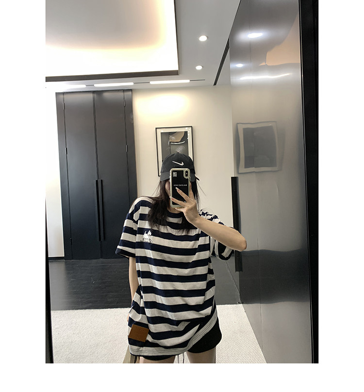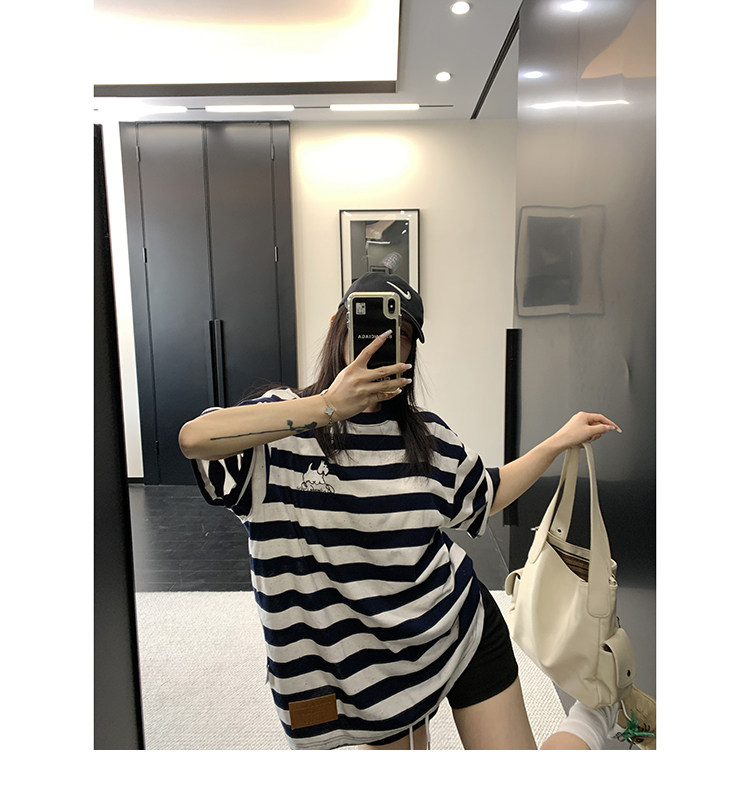 【商品名】【トップス】ストライプ Tシャツ レディース 夏 半袖 カートゥーン ゆったり オーバーサイズ クルーネック 人気 リラックスコーデ【FCシリーズ】