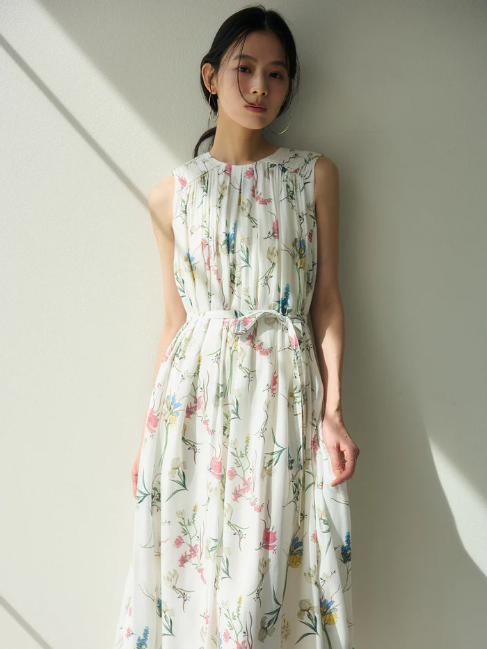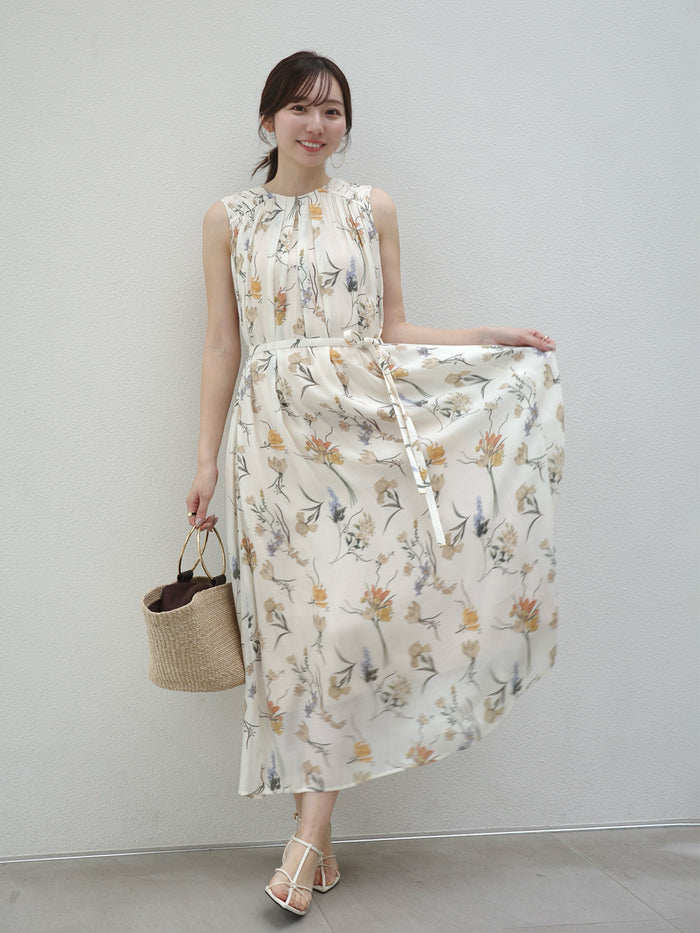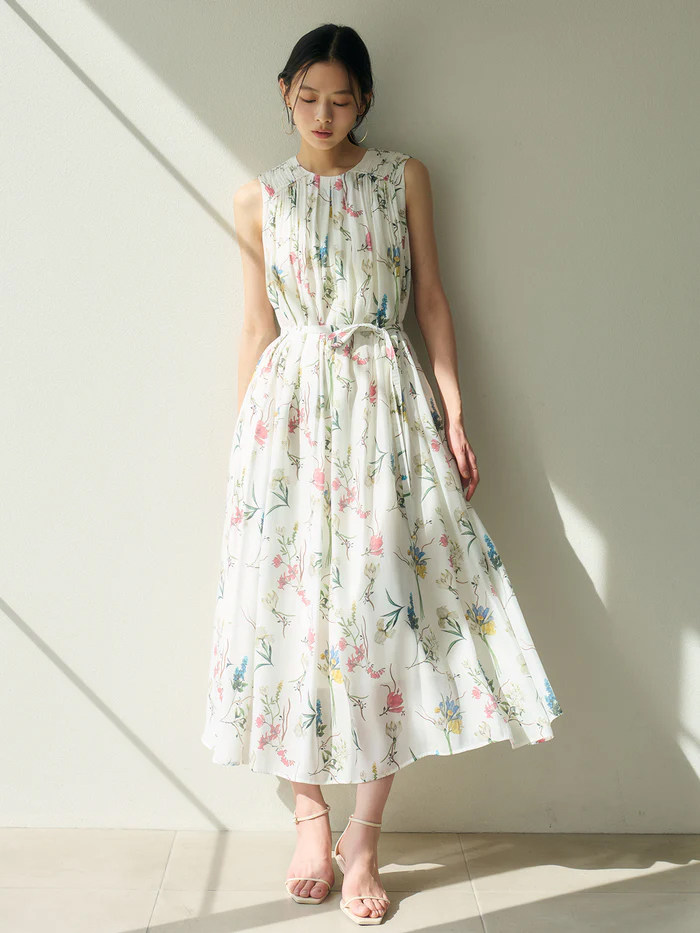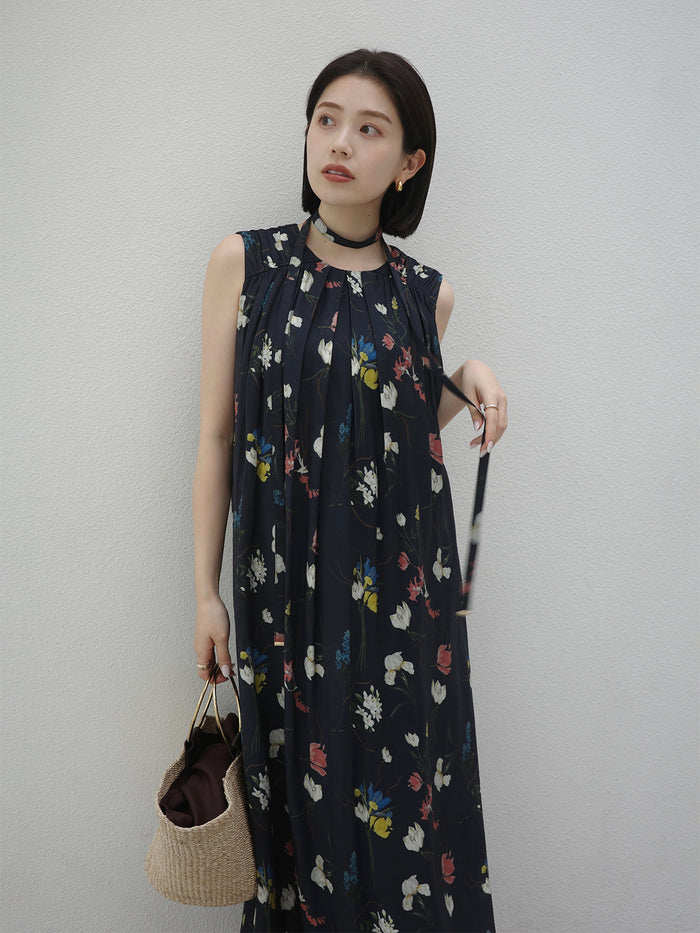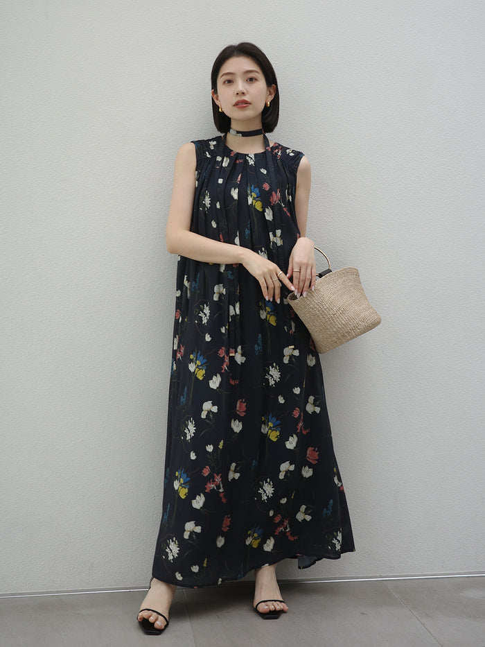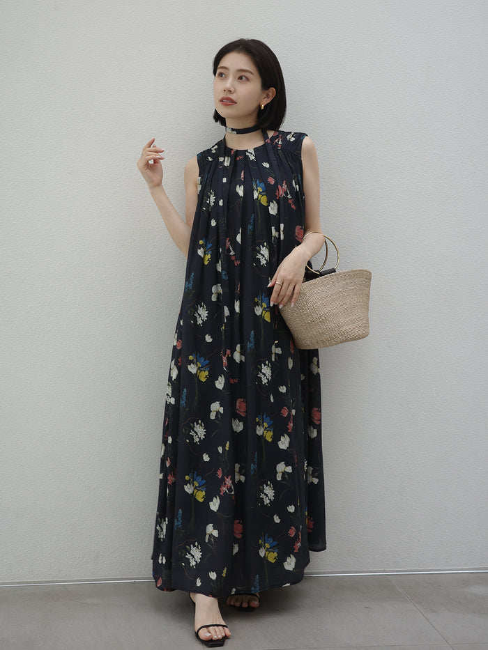 【ワンピース】レトロ花柄 プリーツデザイン ノースリーブワンピース レディース 夏 ゆったり ストレート ロングドレス【SHシリーズ】