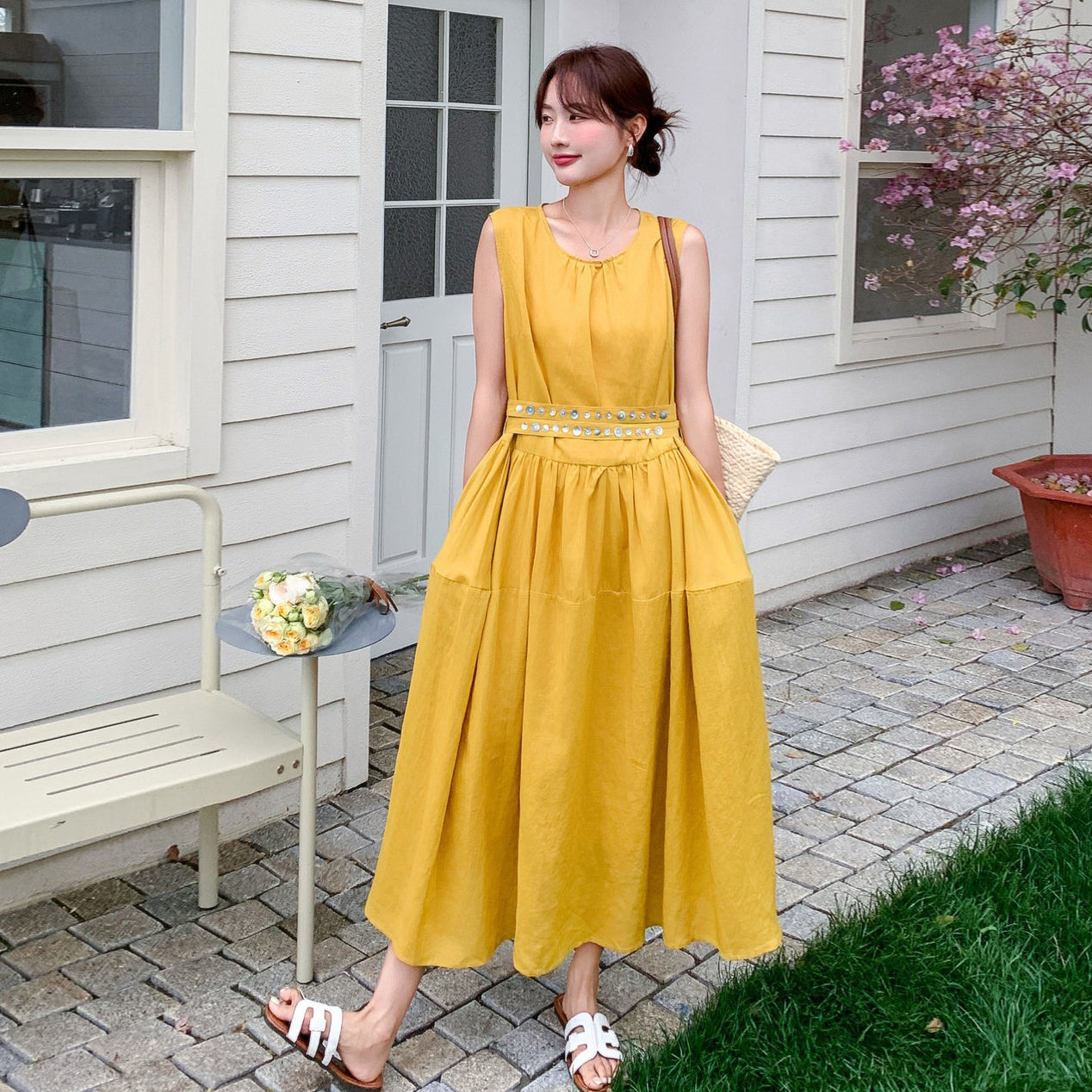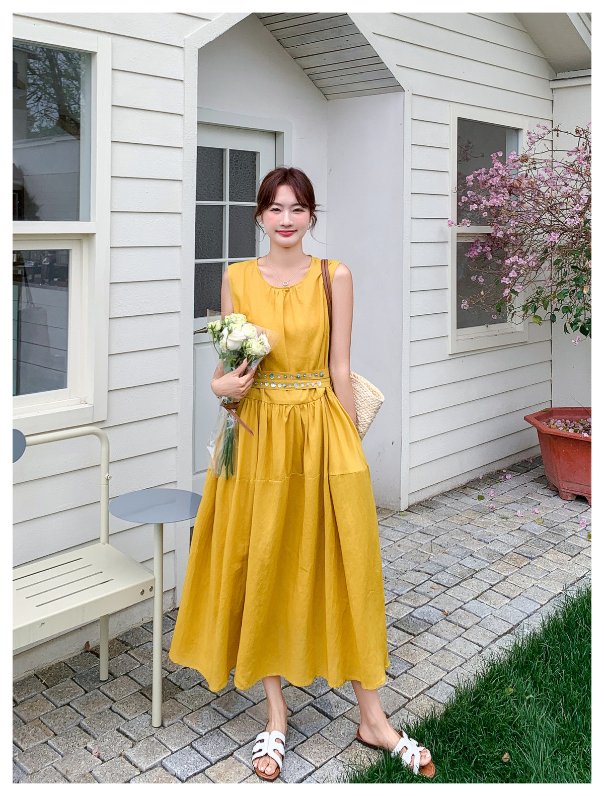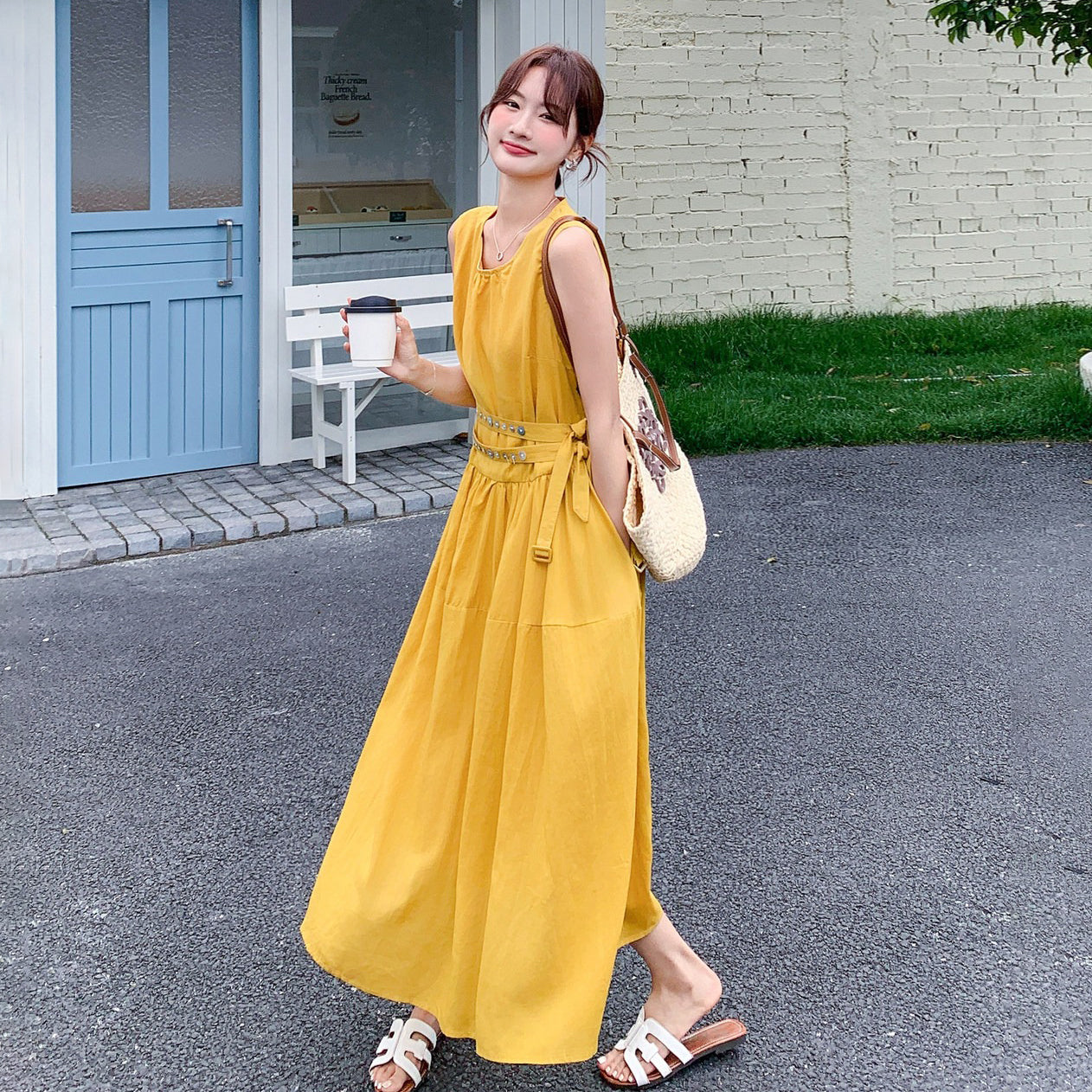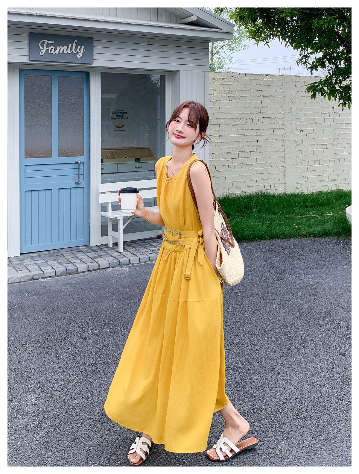 【商品名】【ワンピース】ノースリーブ ワンピース レディース 夏 フレンチ風 ウエストマーク ロングワンピース 細見え 上品 フェミニン【JZシリーズ】