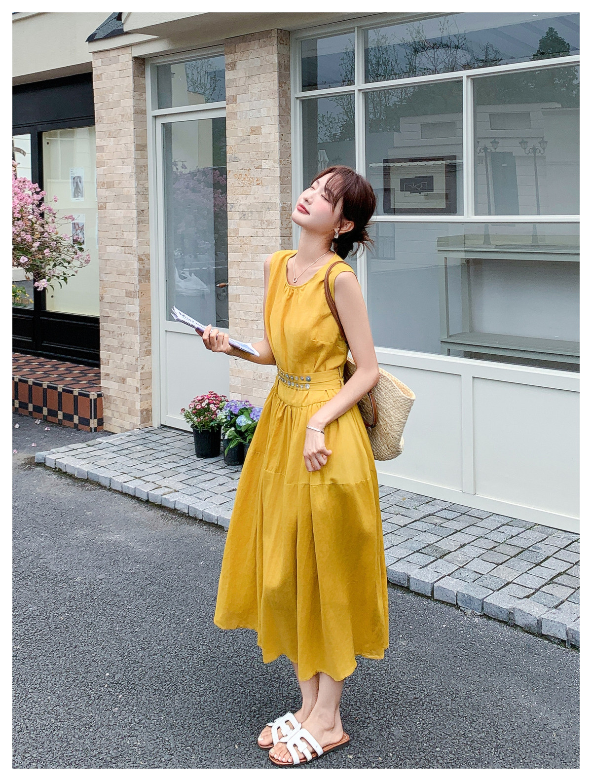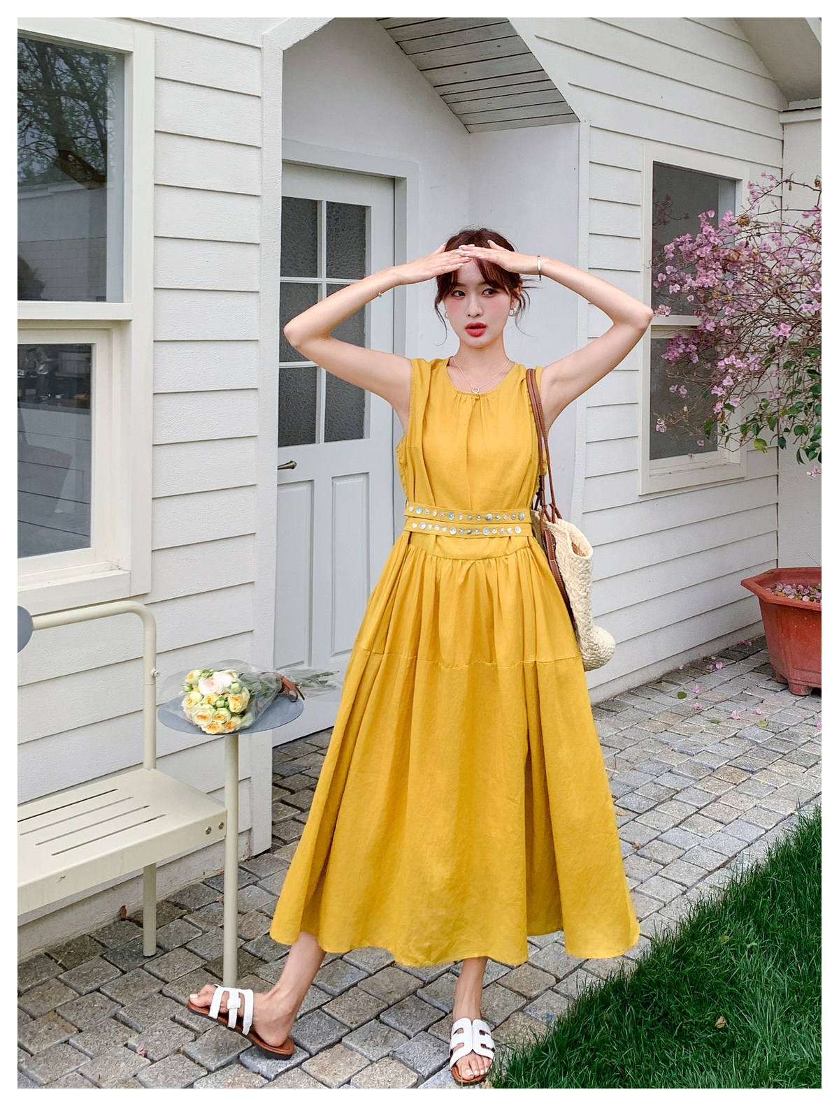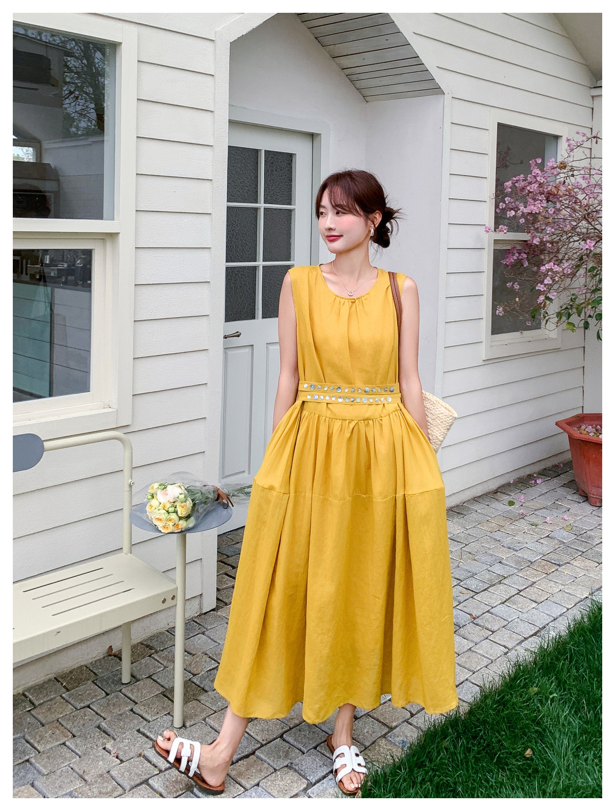 【商品名】【ワンピース】ノースリーブ ワンピース レディース 夏 フレンチ風 ウエストマーク ロングワンピース 細見え 上品 フェミニン【JZシリーズ】