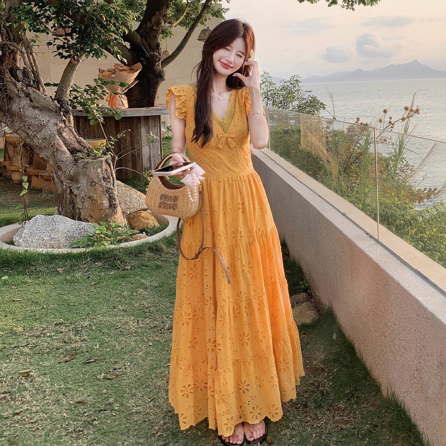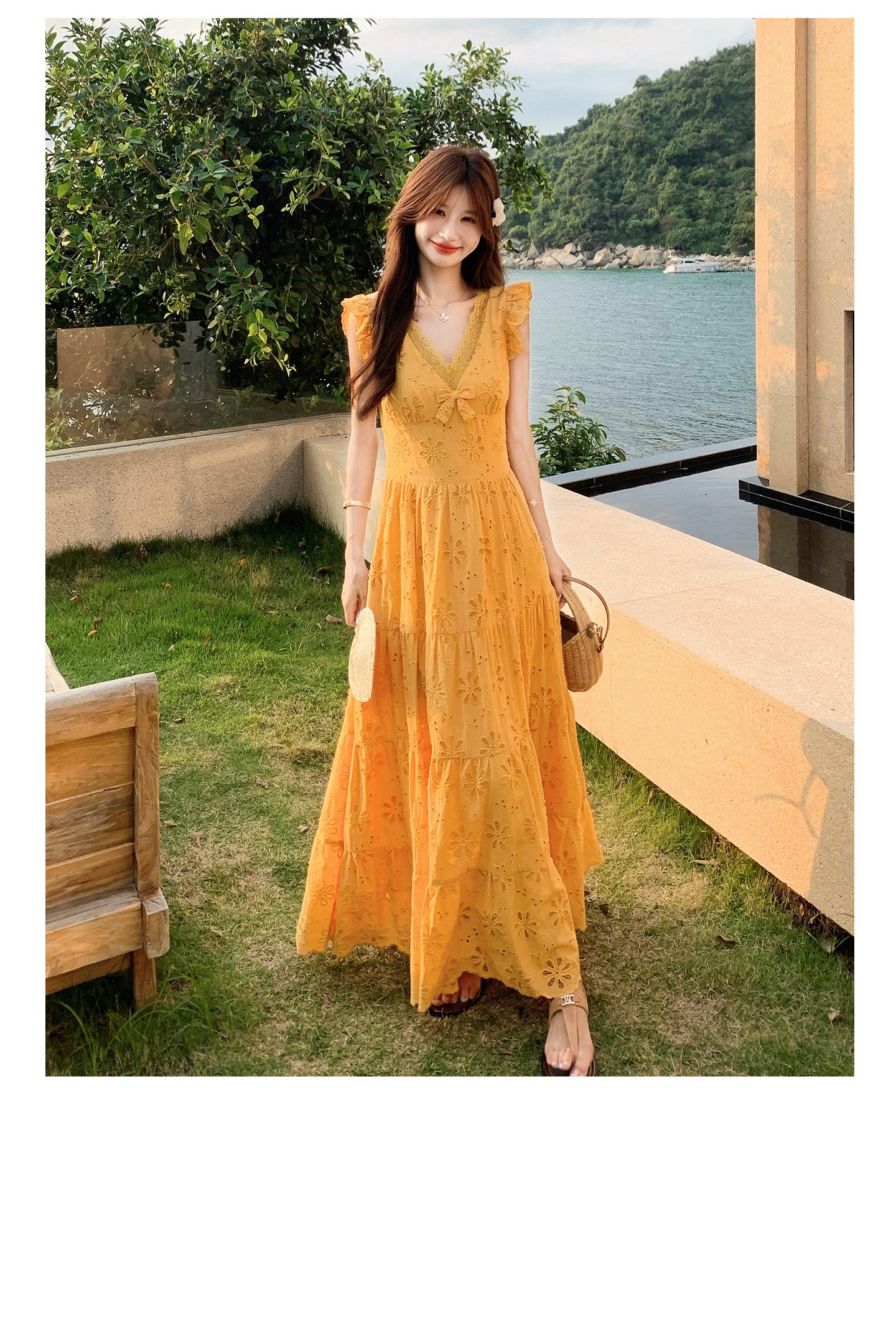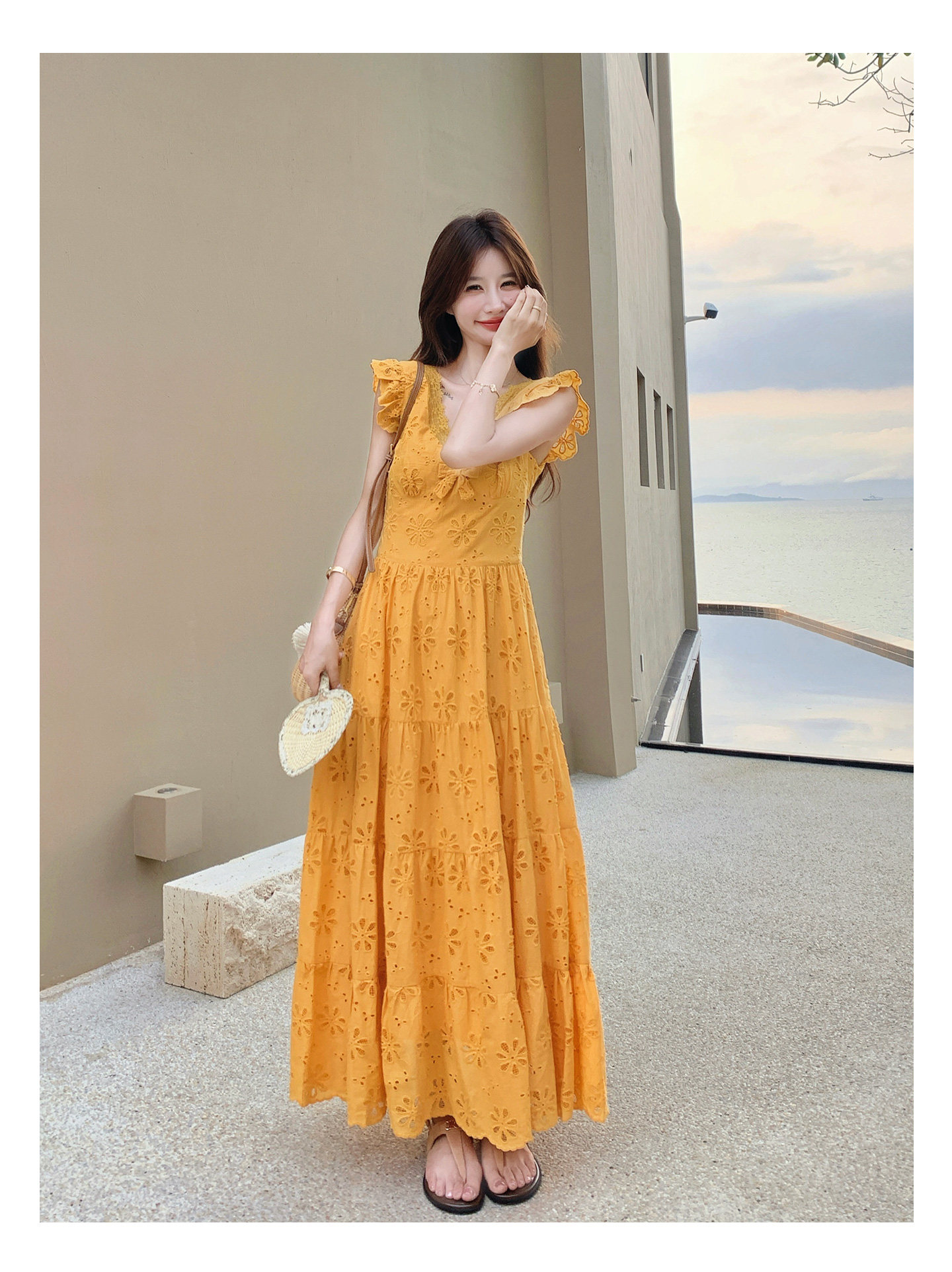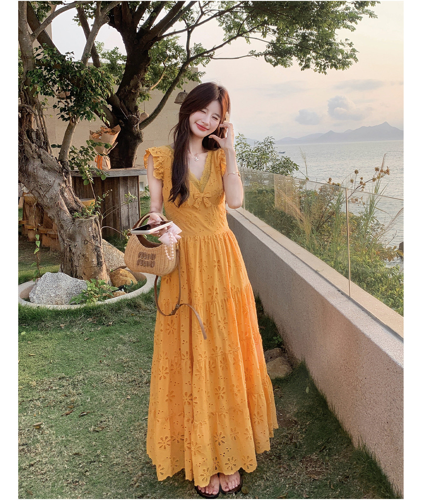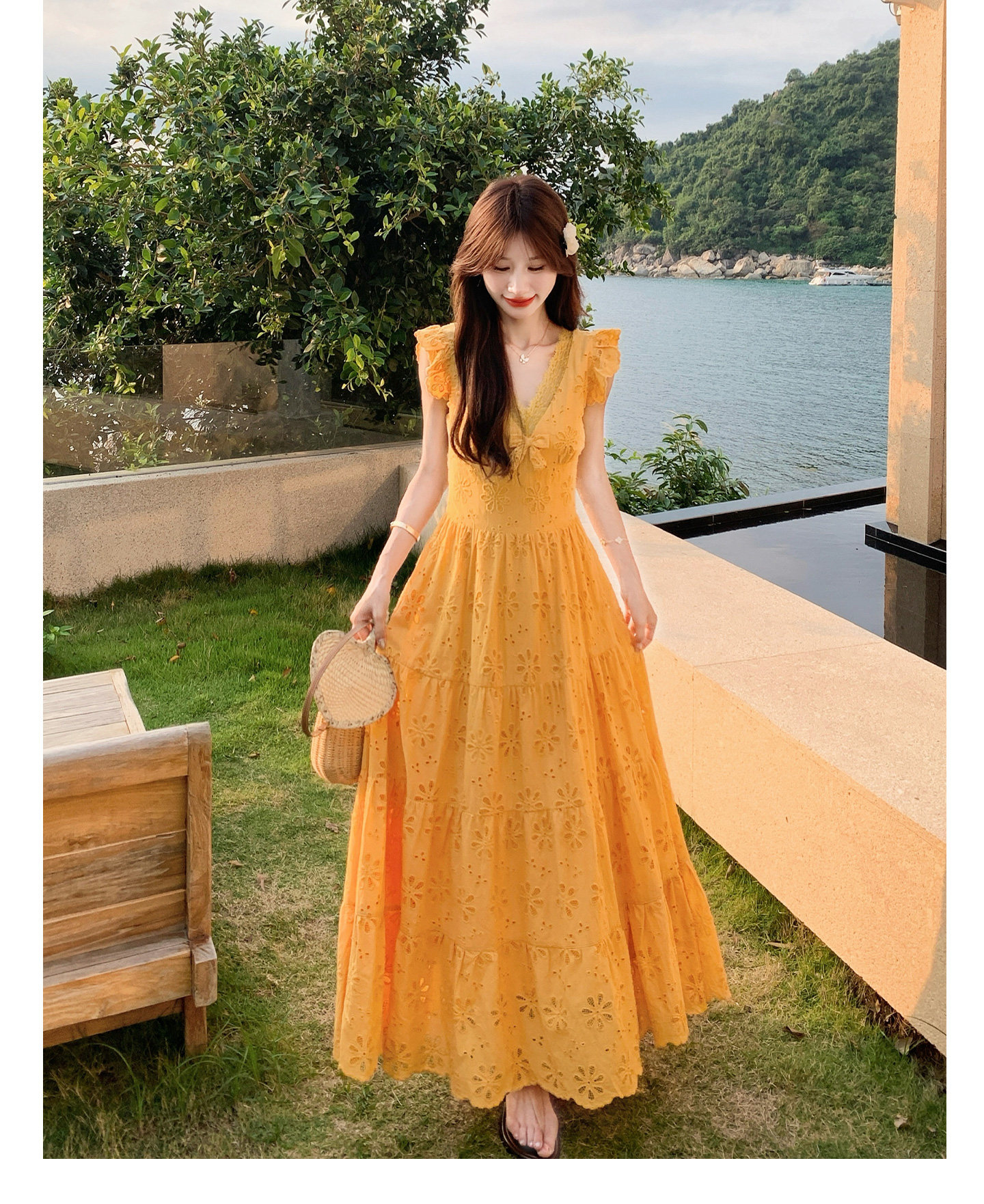 【商品名】【ワンピース】フレンチロマン オレンジ Vネック カットワーク刺繍 フレアワンピース レディース ノースリーブ 夏 大人可愛い リゾートコーデ ゆったり【JZシリーズ】