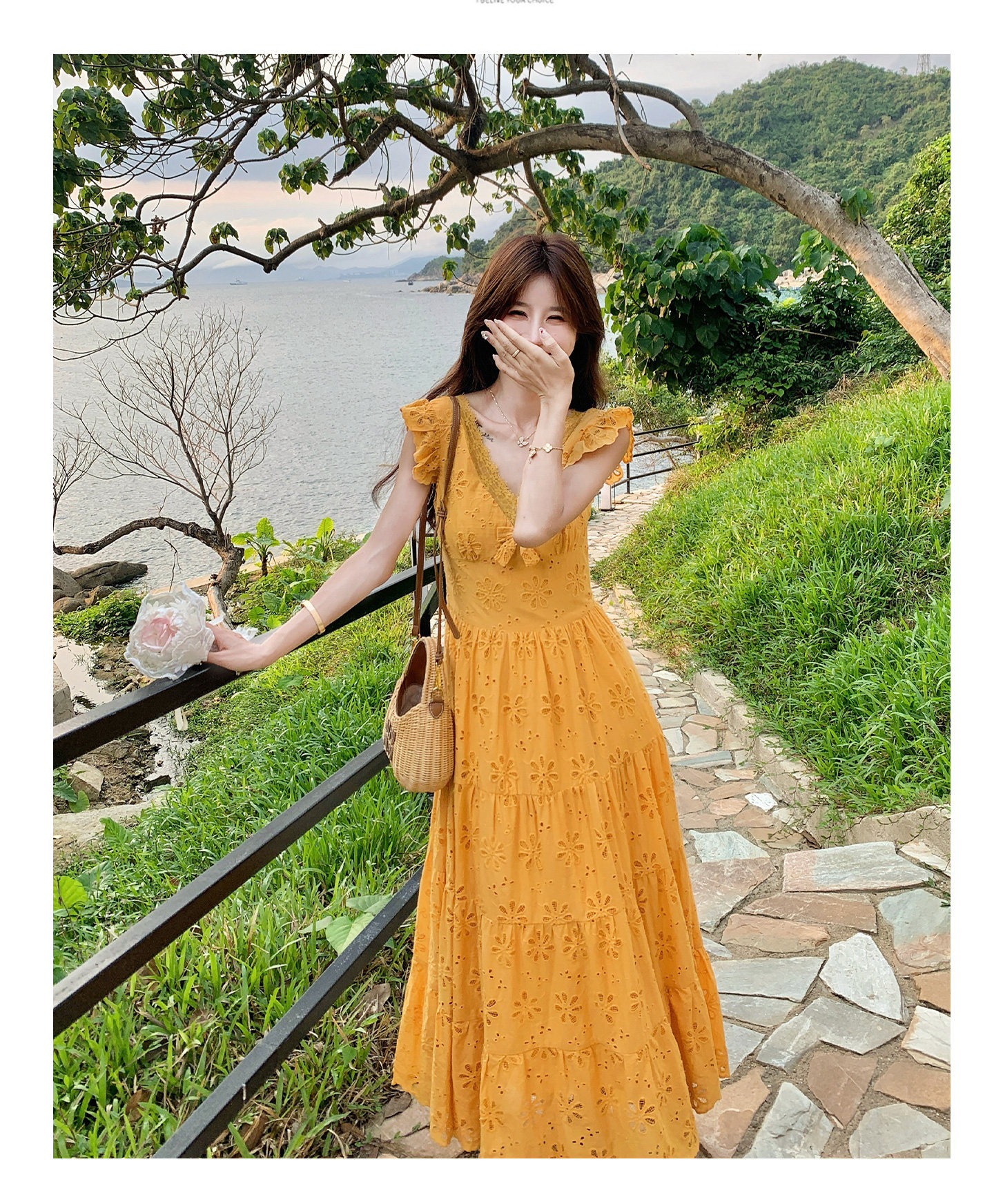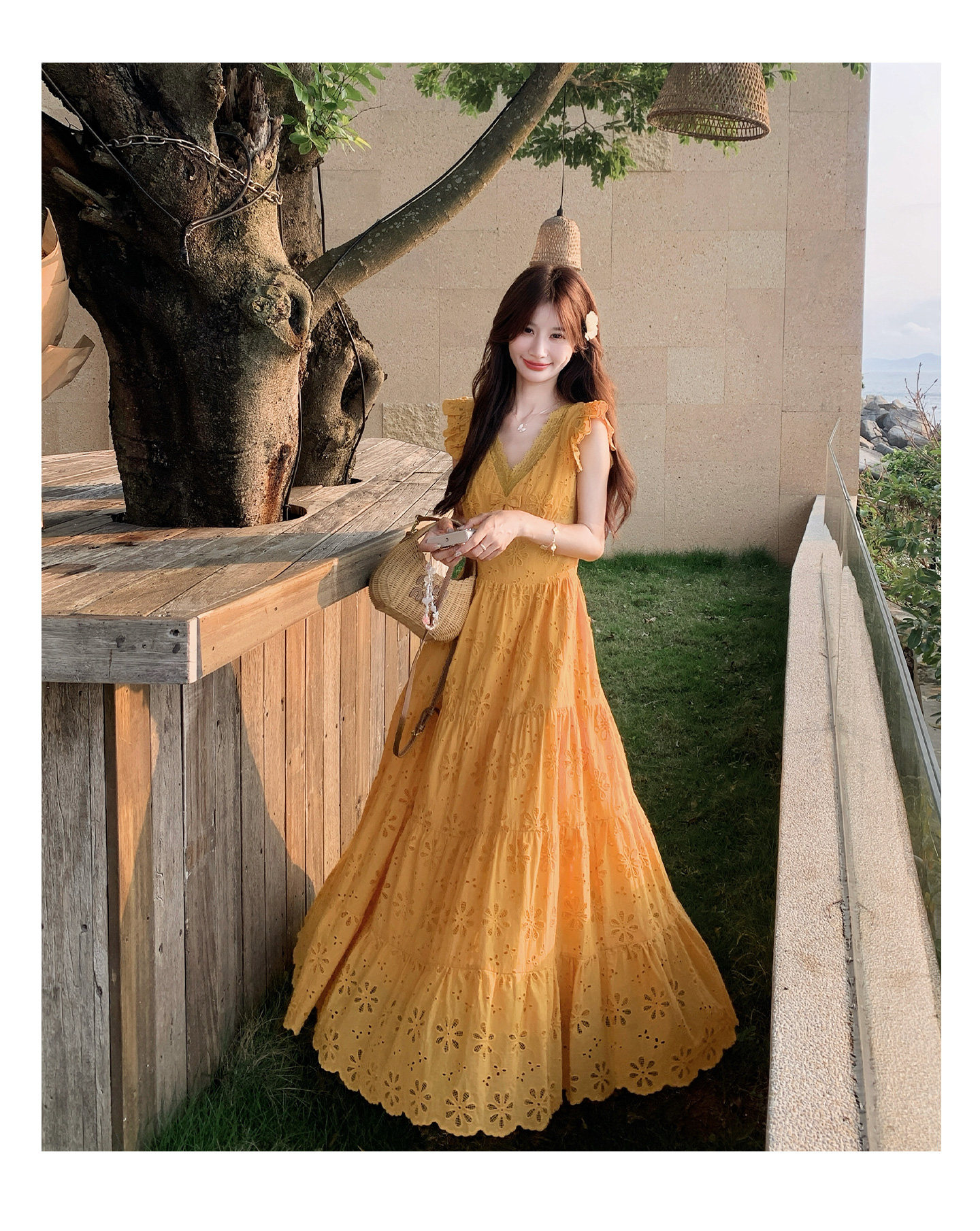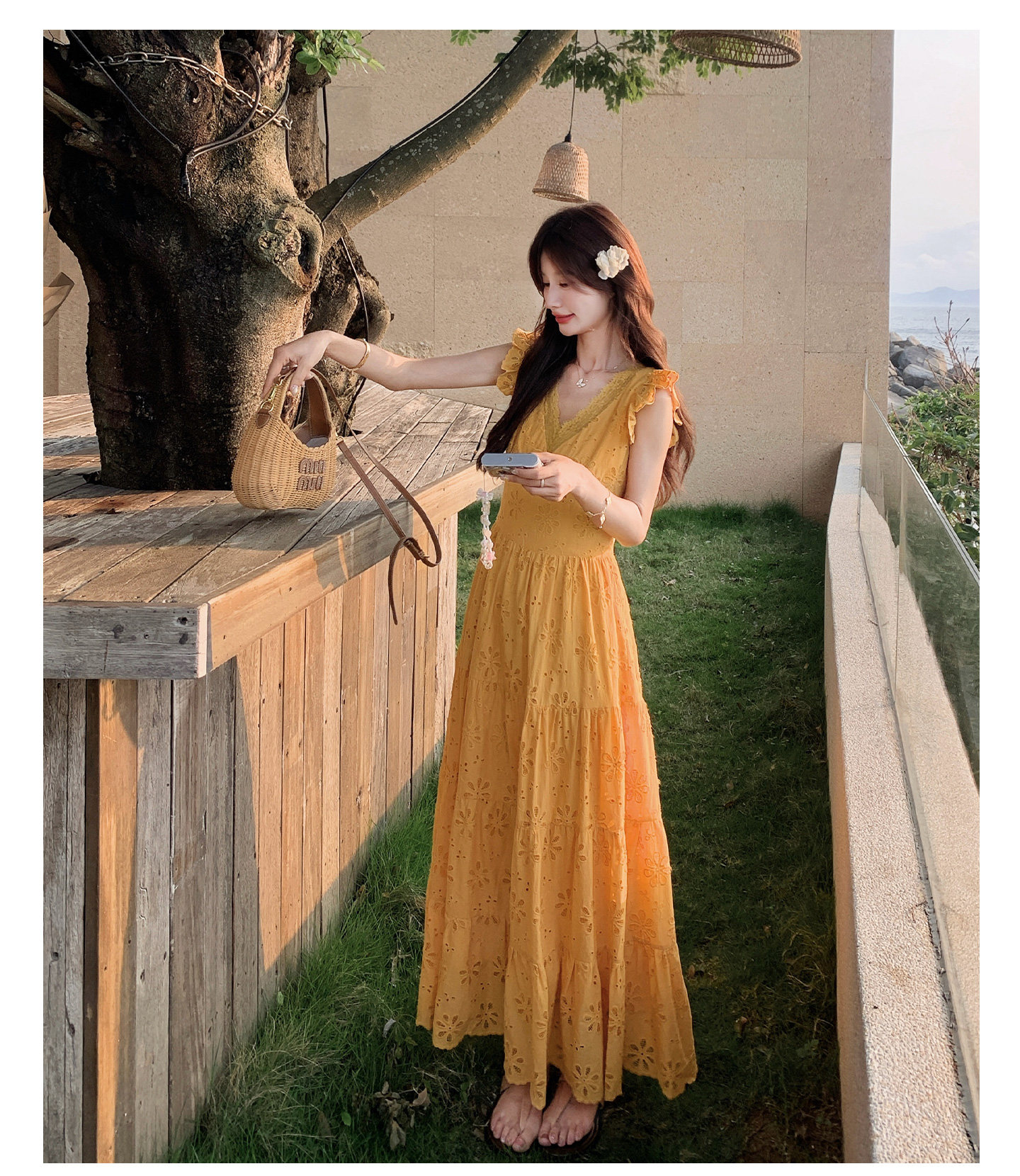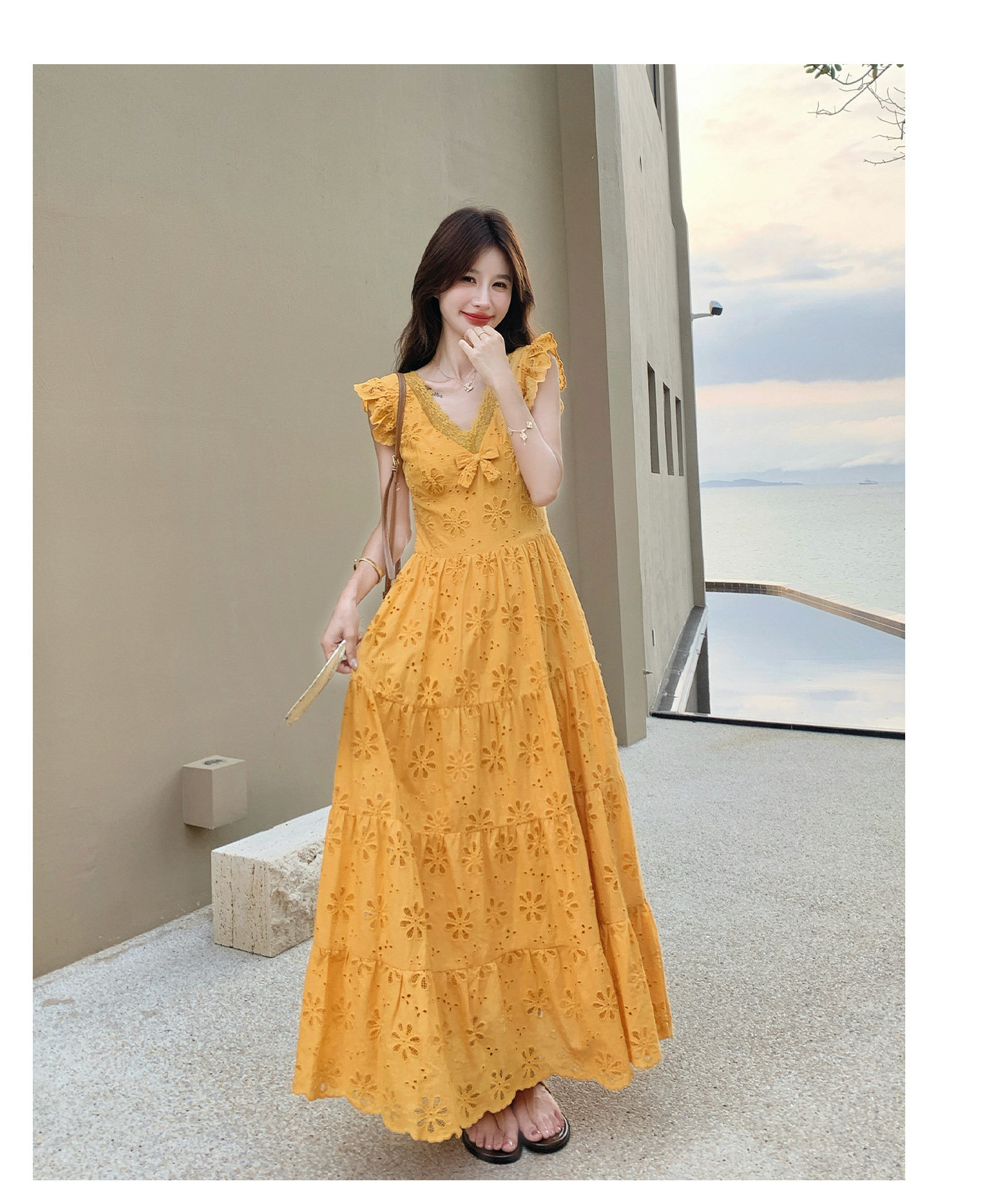 【商品名】【ワンピース】フレンチロマン オレンジ Vネック カットワーク刺繍 フレアワンピース レディース ノースリーブ 夏 大人可愛い リゾートコーデ ゆったり【JZシリーズ】