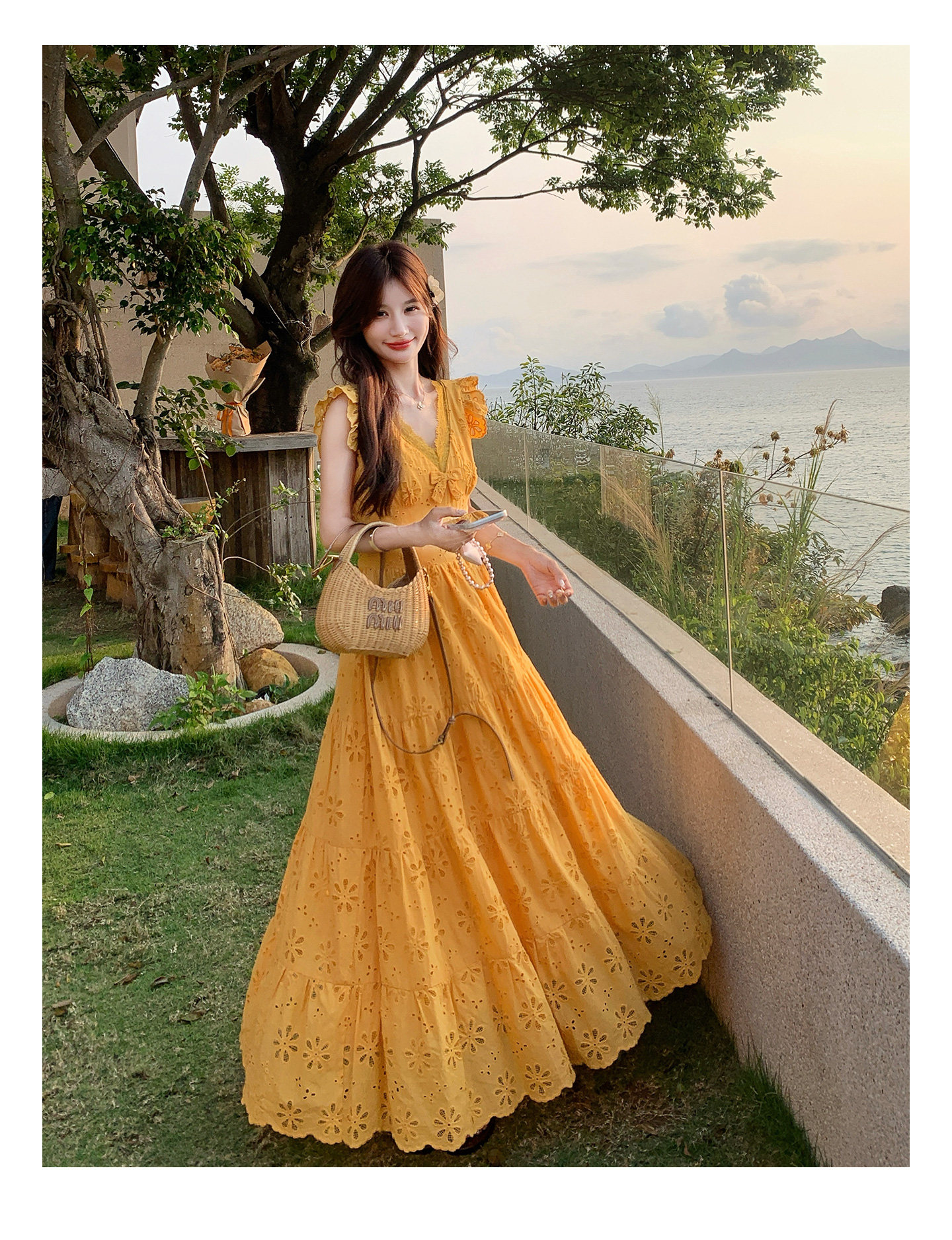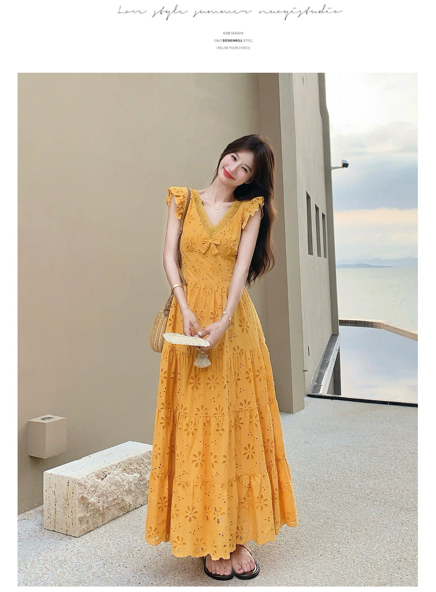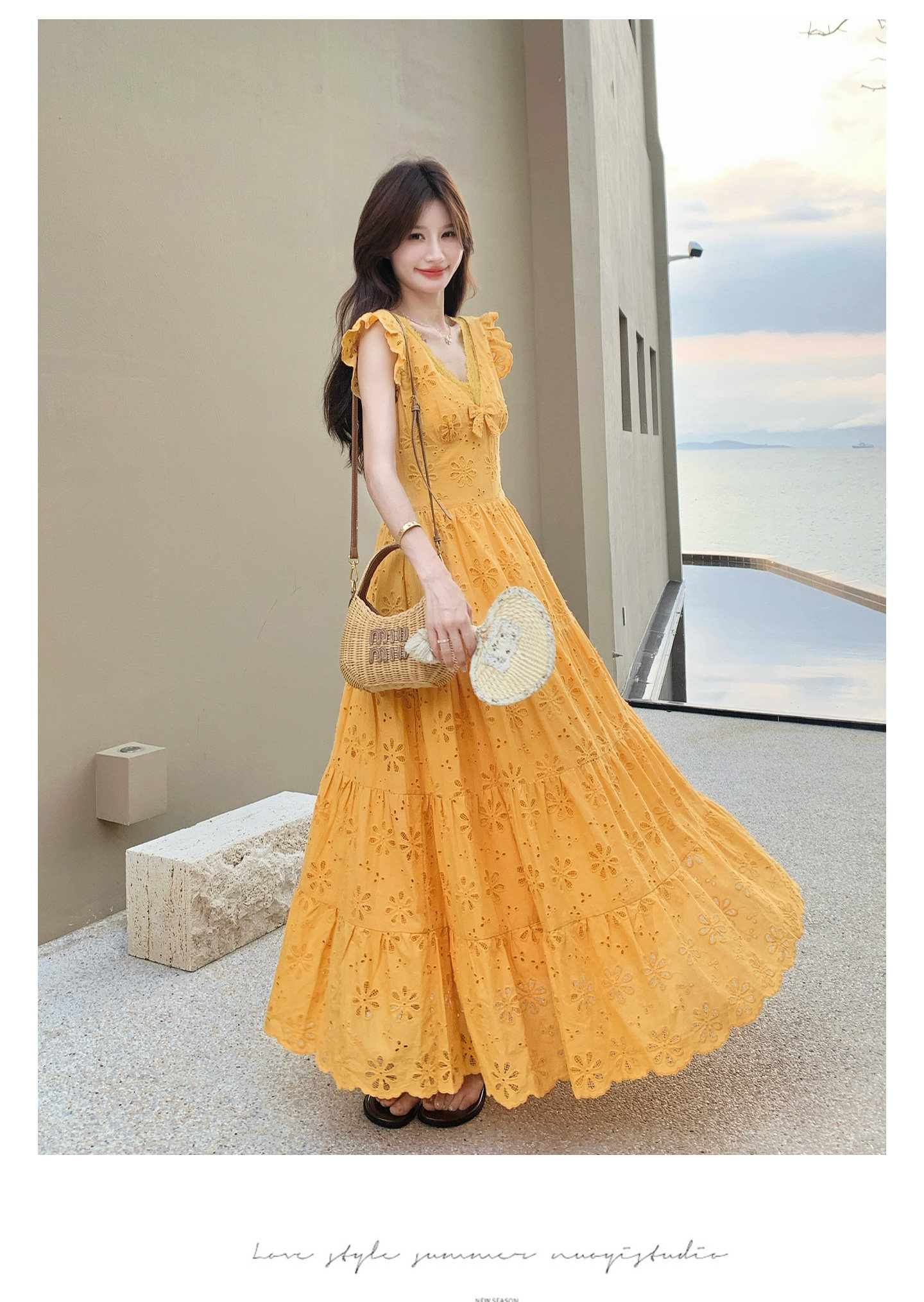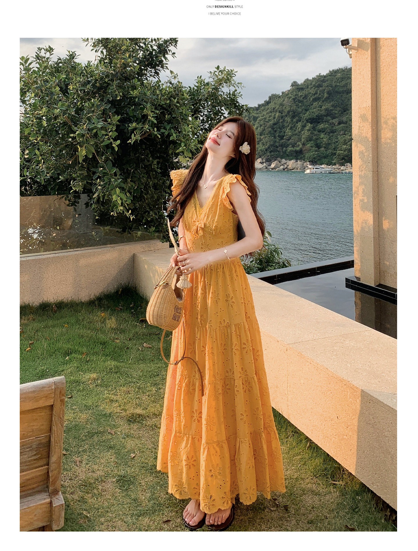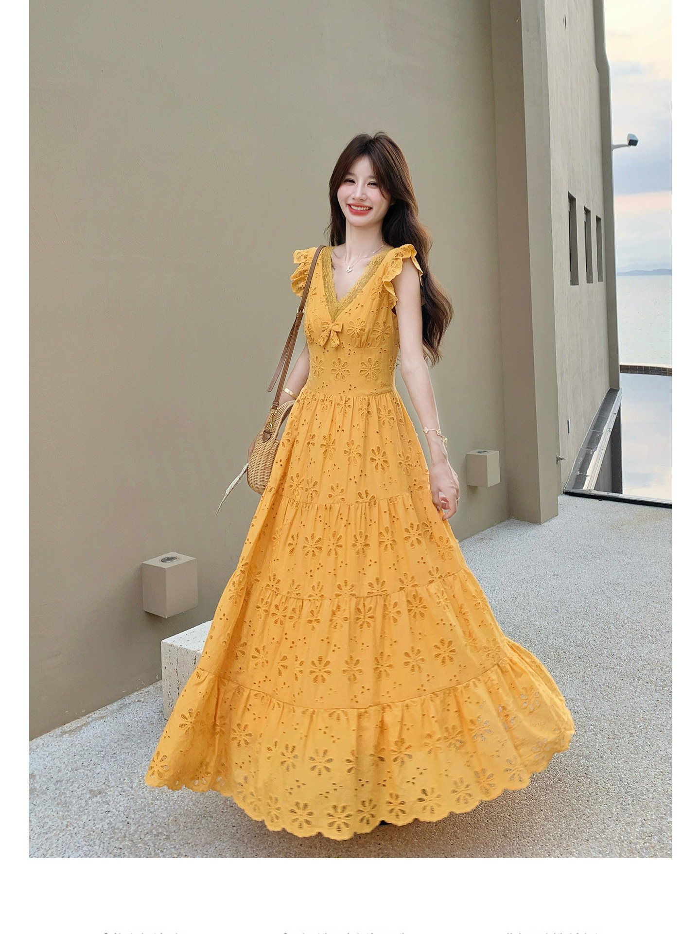【商品名】【ワンピース】フレンチロマン オレンジ Vネック カットワーク刺繍 フレアワンピース レディース ノースリーブ 夏 大人可愛い リゾートコーデ ゆったり【JZシリーズ】