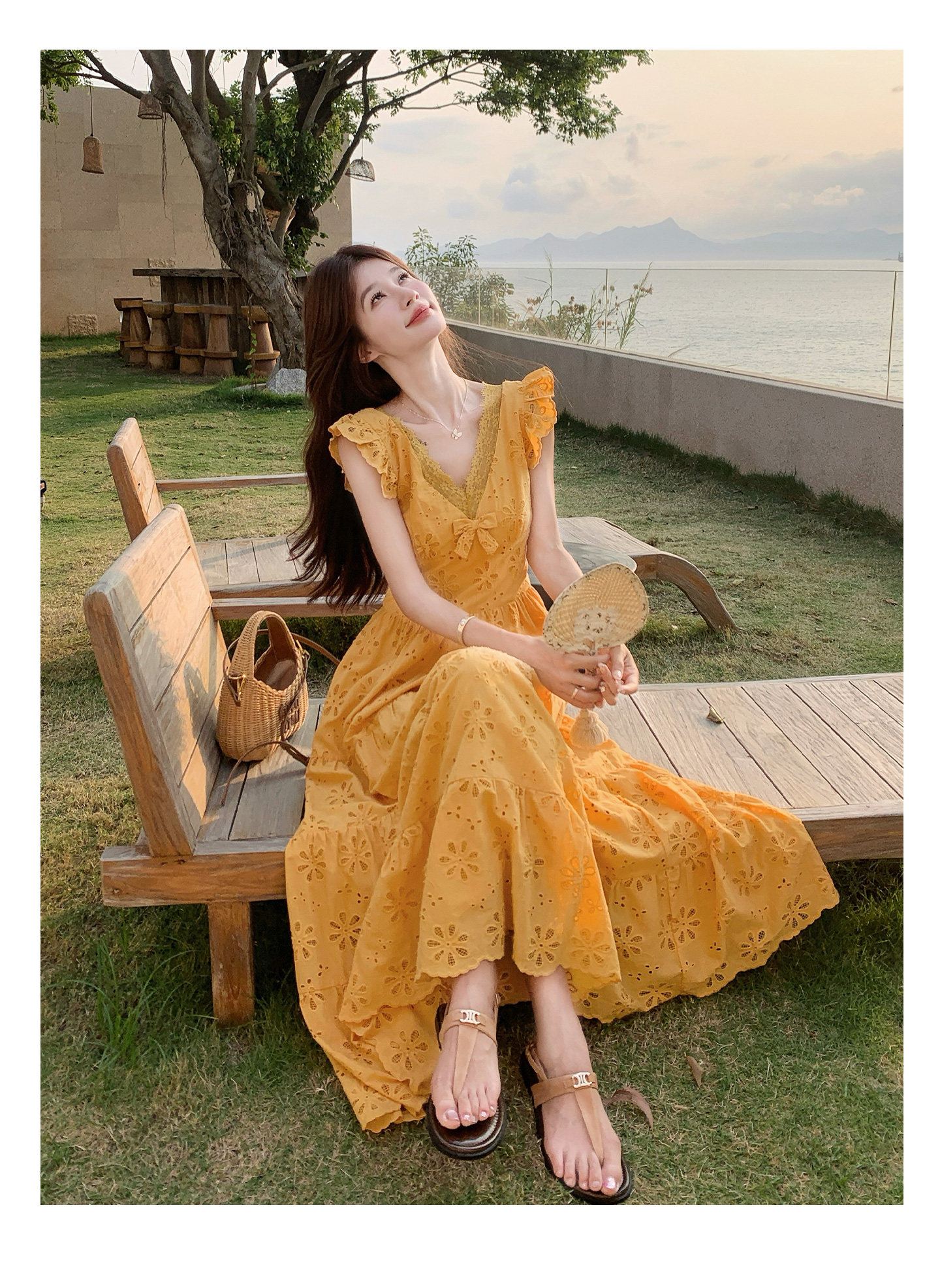 【ワンピース】フレンチロマン オレンジ Vネック カットワーク刺繍 フレアワンピース レディース ノースリーブ 夏 大人可愛い リゾートコーデ ゆったり【JZシリーズ】