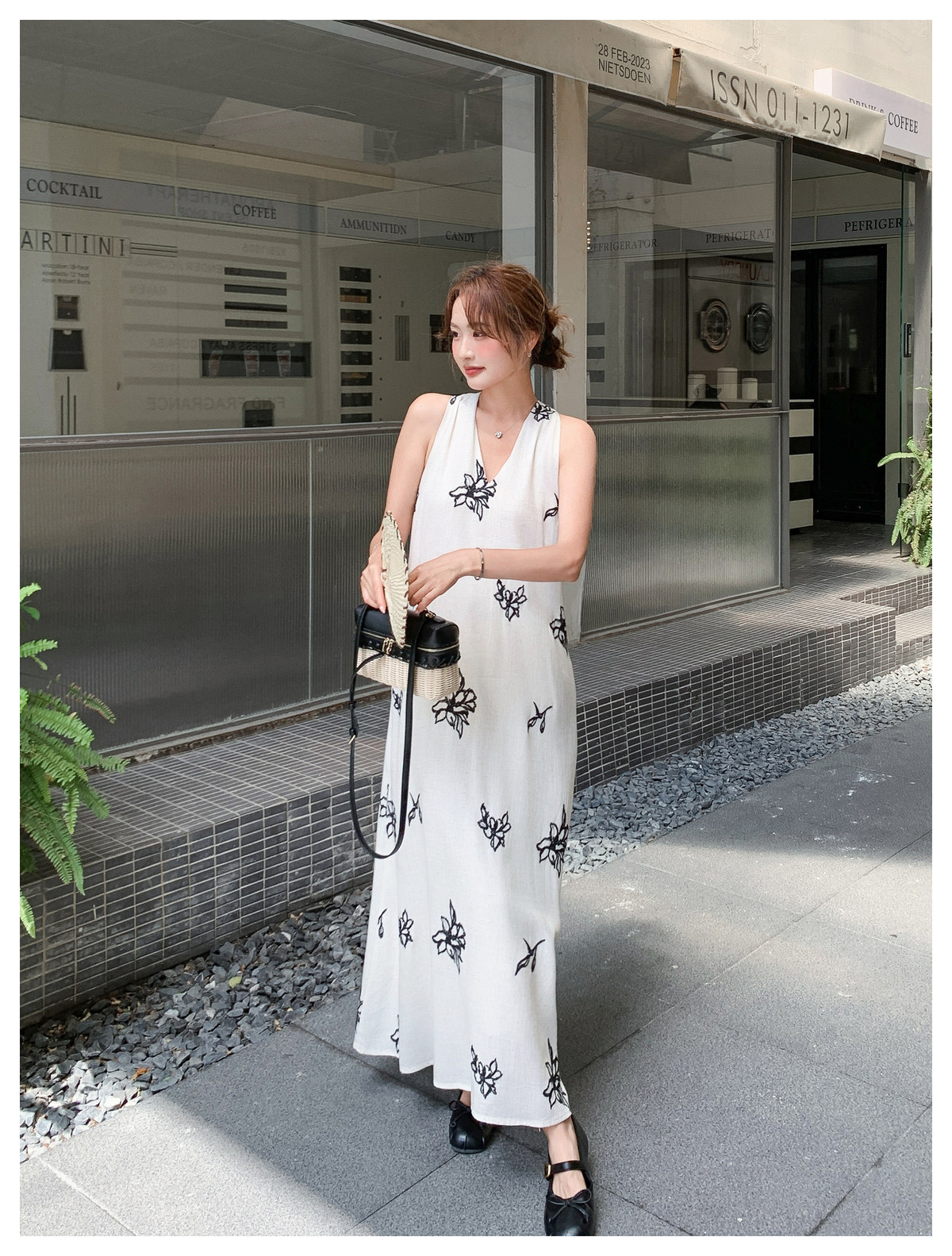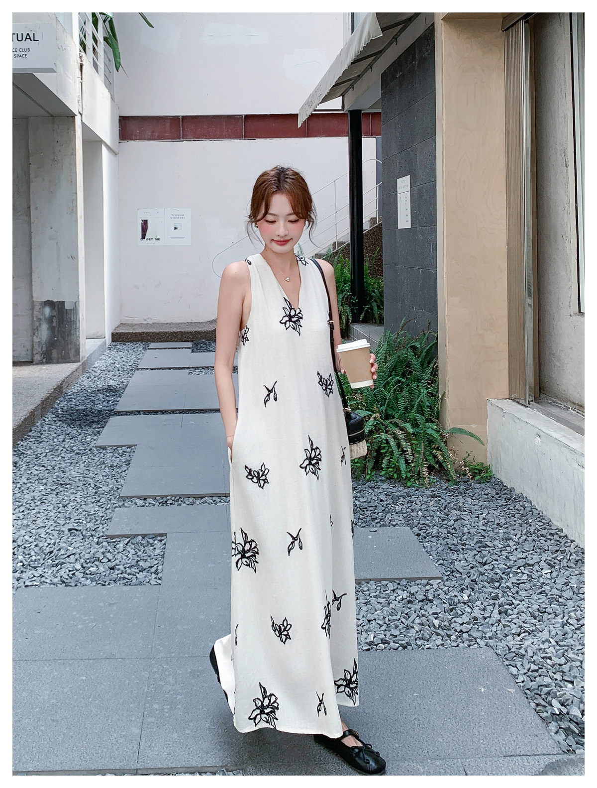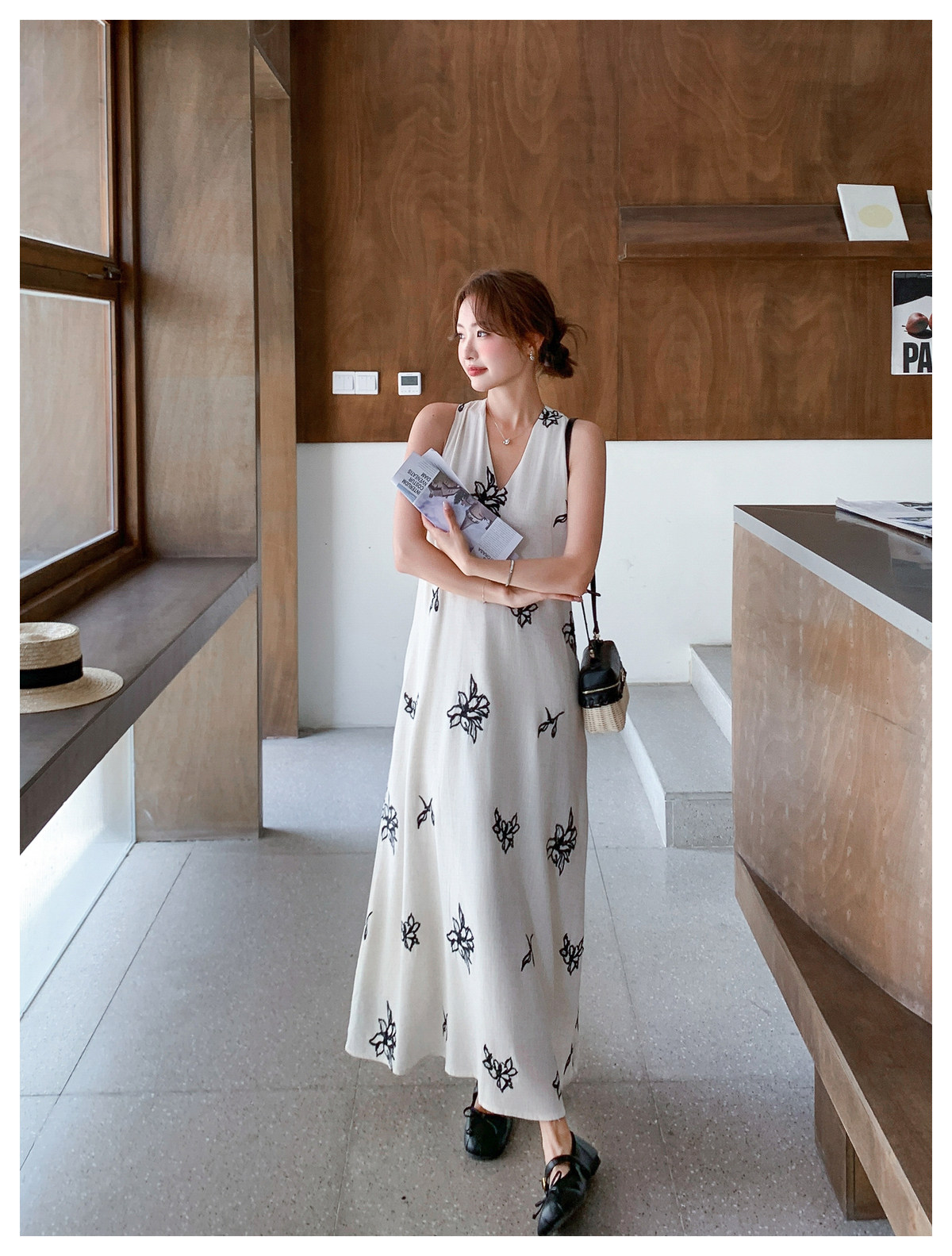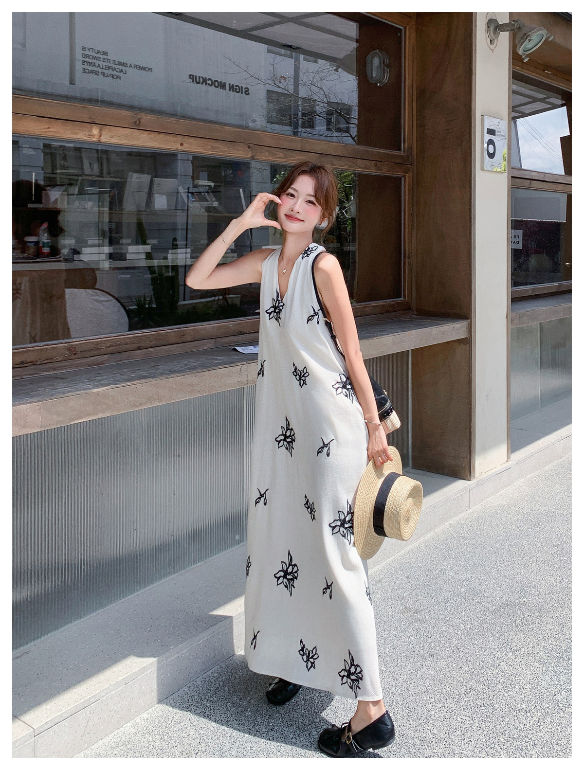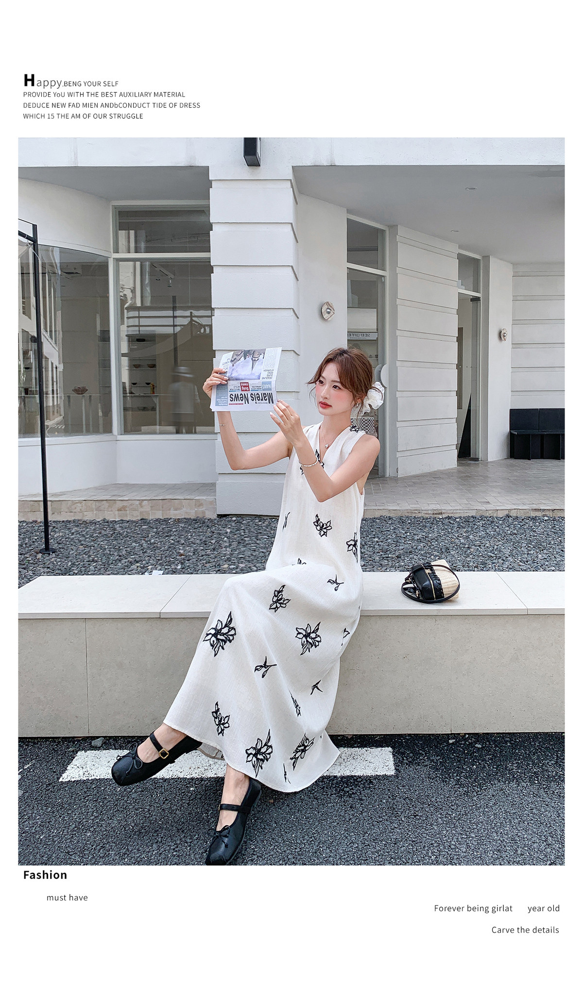 【ワンピース】フレンチ風 刺繍 Vネック ノースリーブワンピース レディース 夏 ロングワンピース リゾート 上品 フェミニン【SHシリーズ】