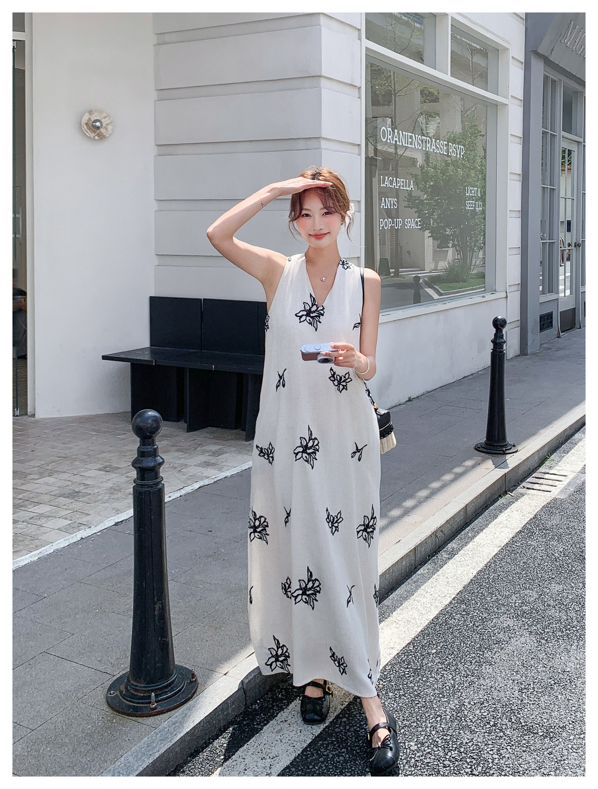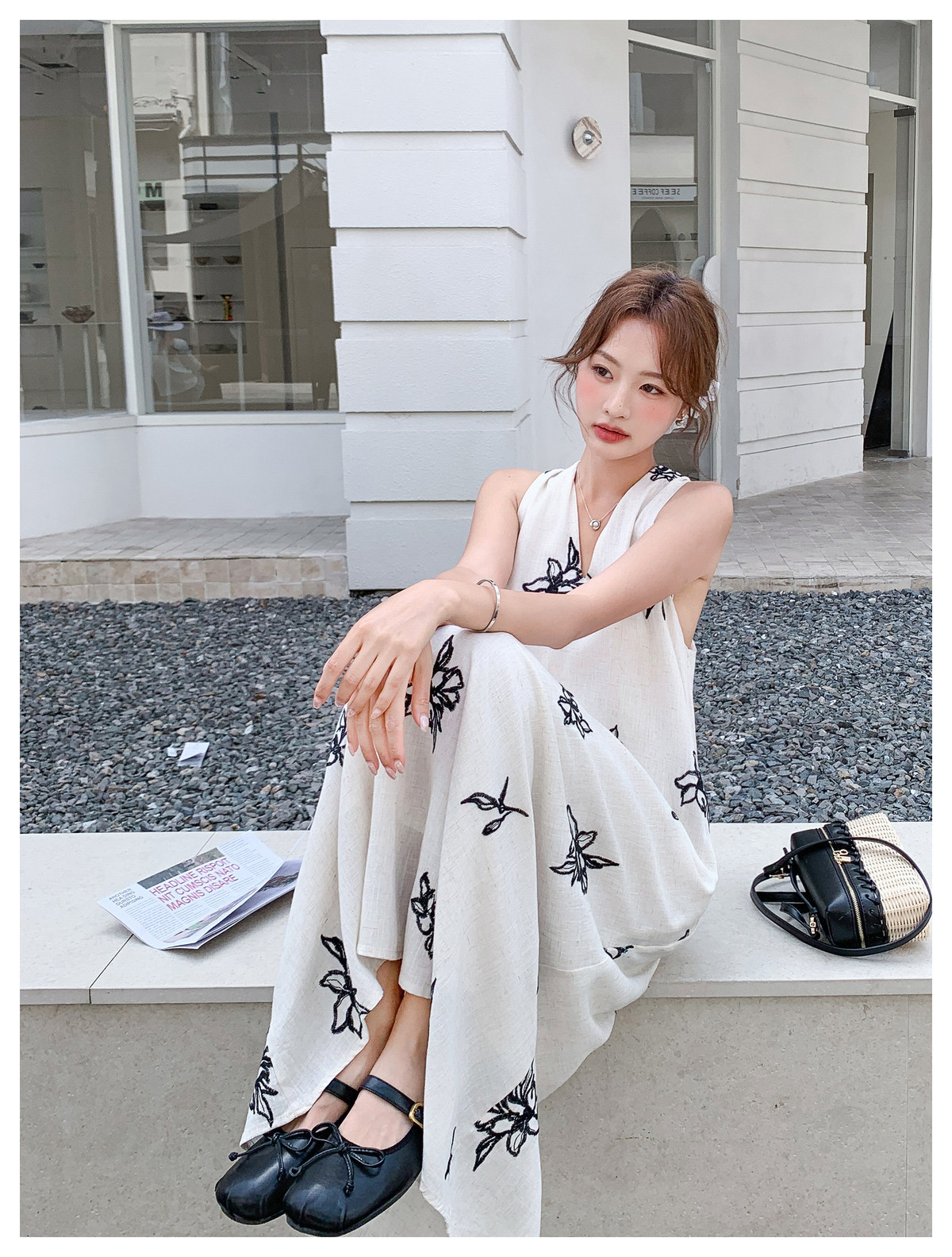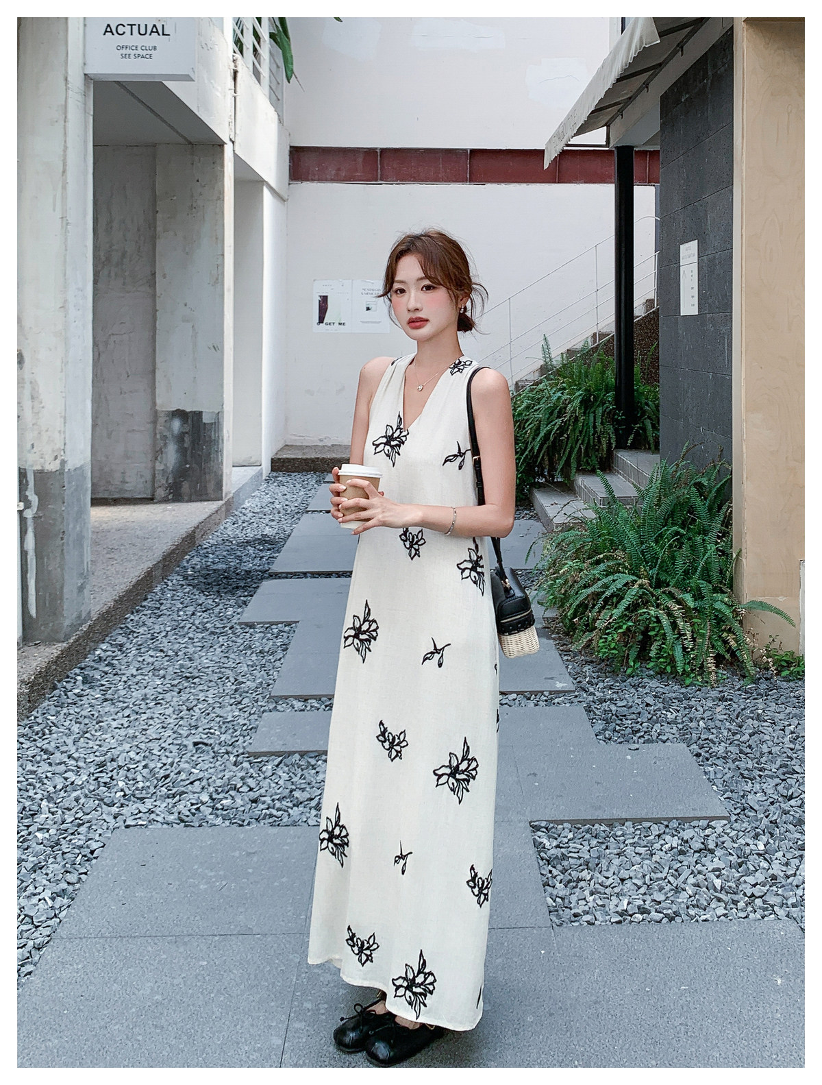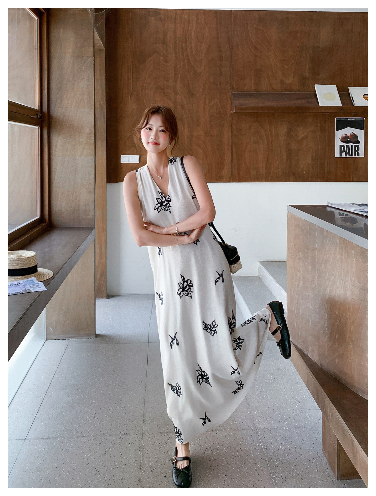 【ワンピース】フレンチ風 刺繍 Vネック ノースリーブワンピース レディース 夏 ロングワンピース リゾート 上品 フェミニン【SHシリーズ】