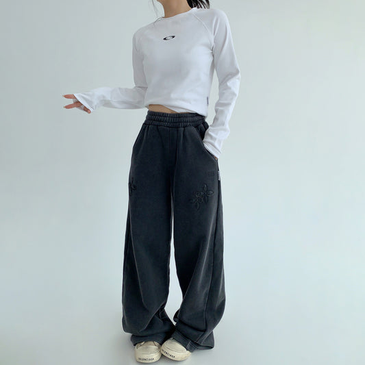 【ボトムス】韓国風 ヴィンテージライク デニムパンツ レディース 直筒&刺繍入り【FCシリーズ】
