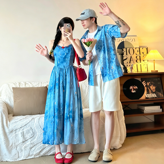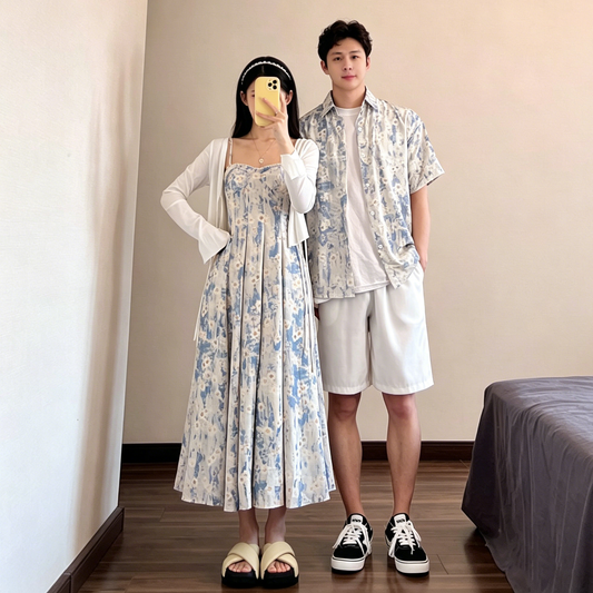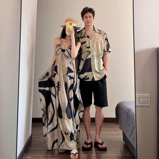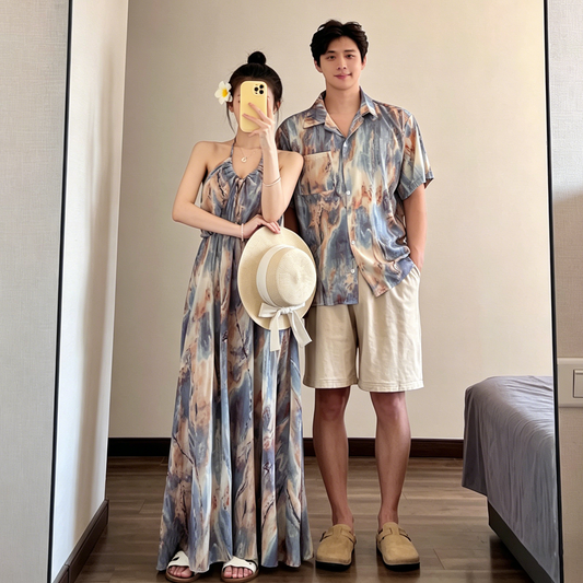 情侶海邊度假穿搭套裝|吊帶長洋裝+襯衫套裝|顯瘦修身情侶情侶裝【SH系列】