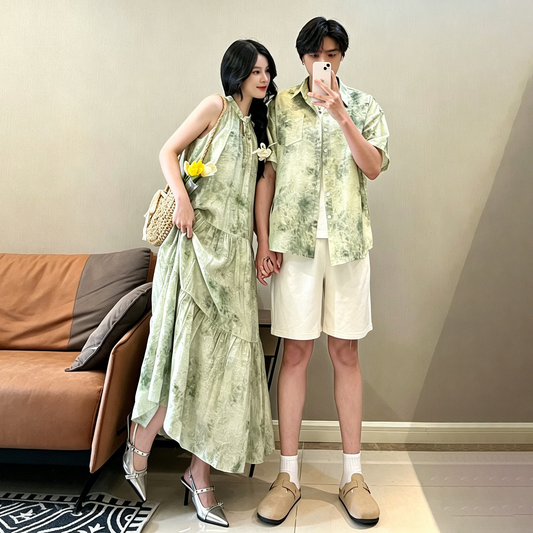 💕カップルコーデ【ワンピース】リゾート風 タイダイ染め ホルターネック ノースリーブ ワンピース&シャツ ペアルック【SHシリーズ】